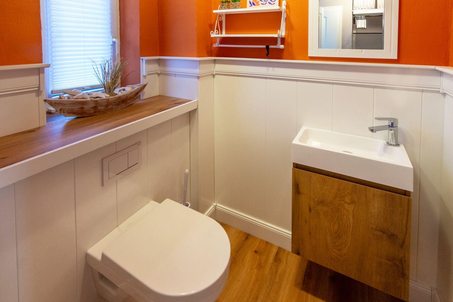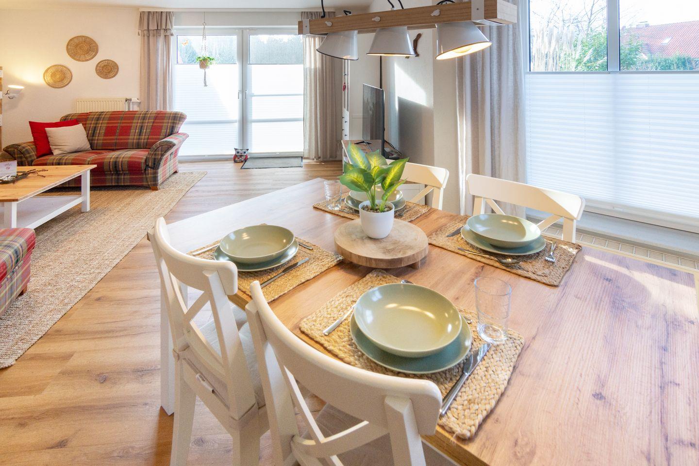 Im Erdgeschoss befinden sich der offen gestaltete Wohn- und Essbereich mit behaglicher Sofaecke, Satelliten-TV und WLAN sowie die vollständig ausgestattete offene Küche. Ein separates Gäste-WC ist ebenfalls vorhanden. Pflegeleichter Vinylboden, Spiele und Bücher sorgen für Gemütlichkeit zu jeder Jahreszeit, die Zentralheizung für angenehme Wärme.