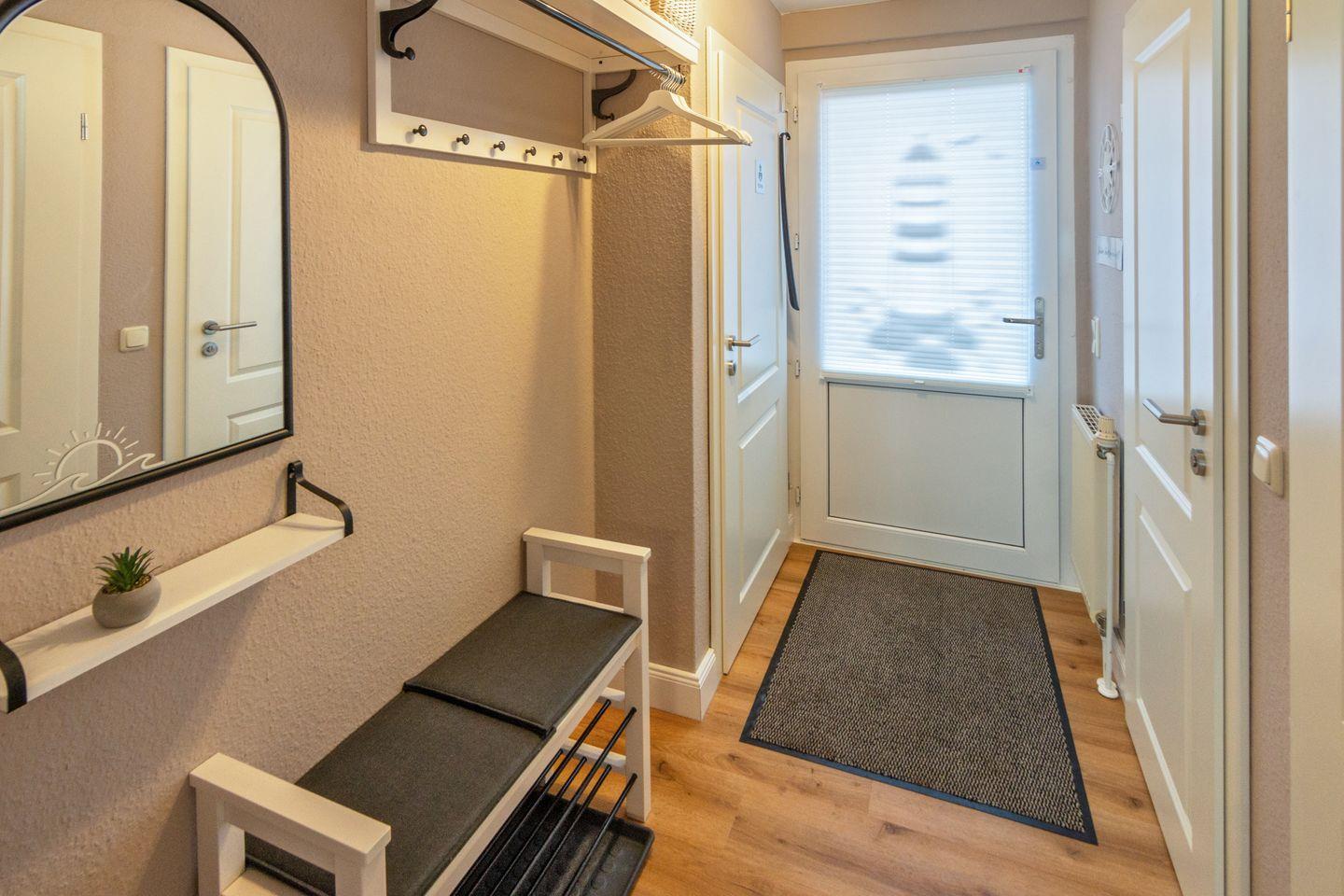 Waschmaschine, Bügeleisen, Bügelbrett, Staubsauger, Wäscheständer, Fliegengitter, Rauchmelder und Garderobe ergänzen die Ausstattung. Die Unterkunft ist ein Nichtraucherobjekt, Haustiere sind nicht erlaubt.