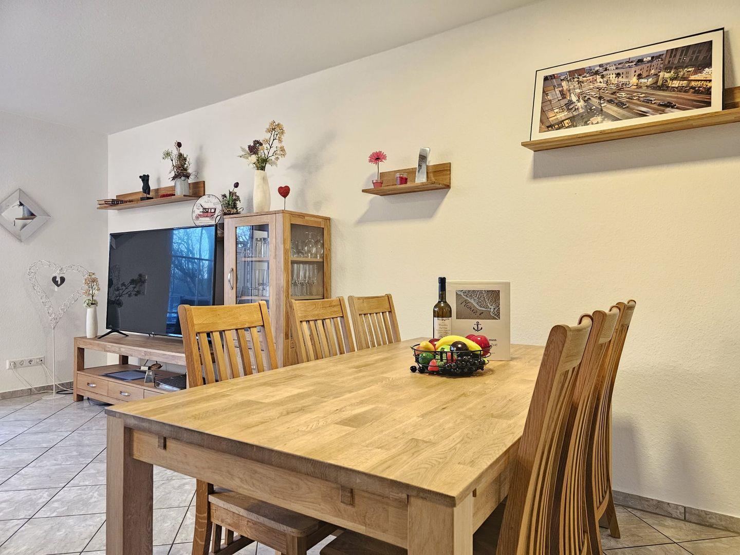 Der lichtdurchflutete Wohn- und Essbereich bildet das Herzstück des Hauses. Hier finden Sie eine bequeme Sofalandschaft, einen großen Esstisch und einen gemütlichen Kaminofen, der an kühlen Abenden für wohlige Wärme und eine entspannte Atmosphäre sorgt.