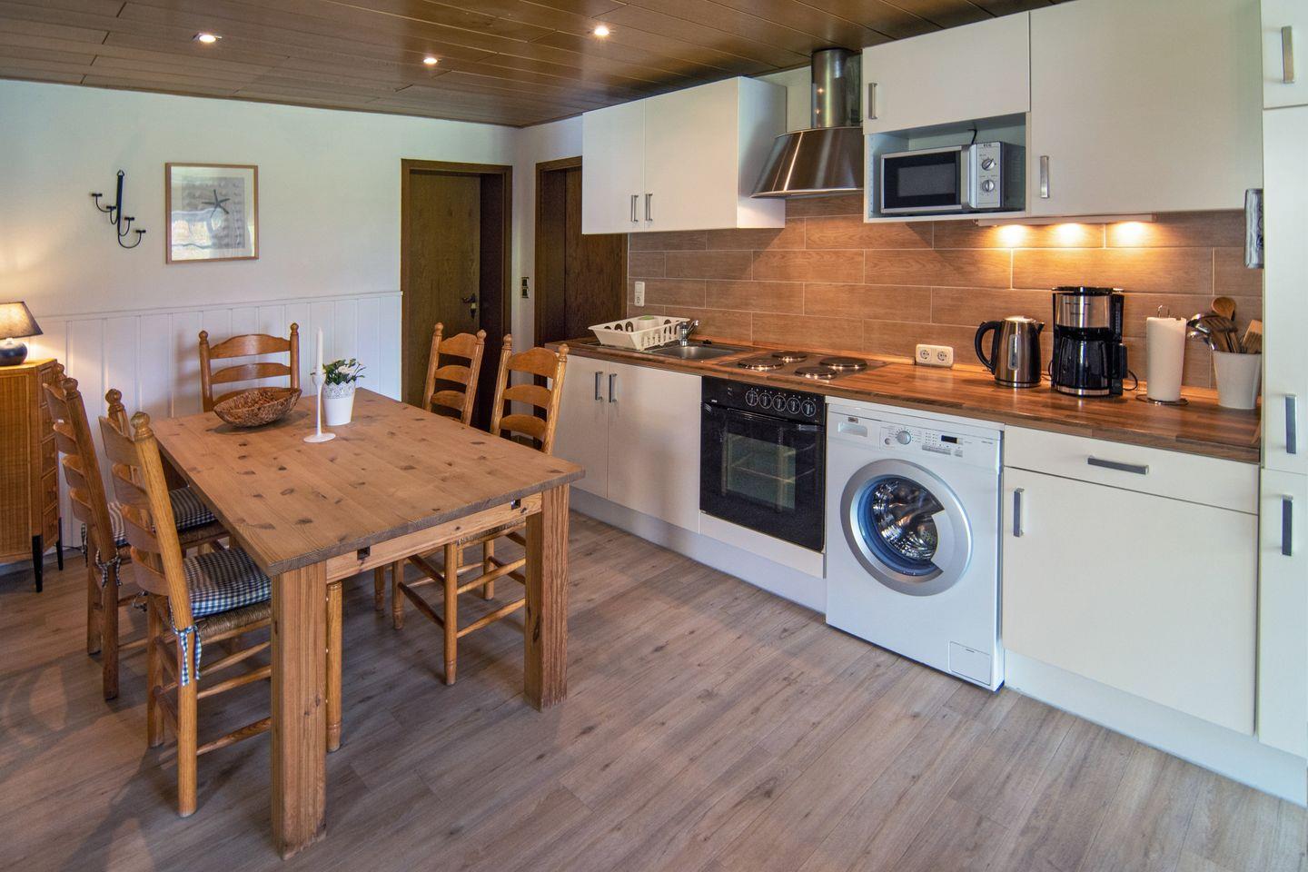 Die Wohnung Seegras verfügt über einen großen Wohn- und Essbereich mit angrenzender voll ausgestatteter Küche, zwei moderne Schlafzimmer (mit einem Ehebett und einem Doppelbett von 1,40 m) und ein Duschbad mit WC. In der Küche ist zudem noch eine Waschmaschine vorhanden. Zur Wohnung gehört eine Terrasse mit Garten. Ein PKW-Stellplatz ist für Sie hinterm Haus. Das WLAN steht Ihnen kostenlos zur Verfügung.
