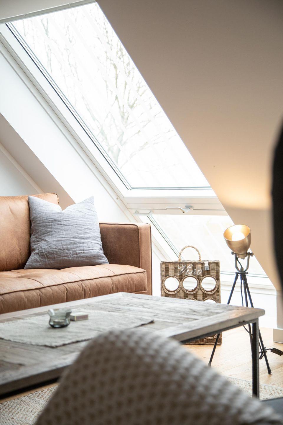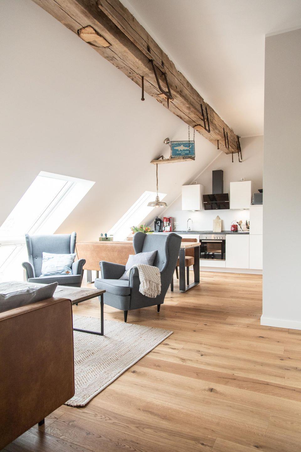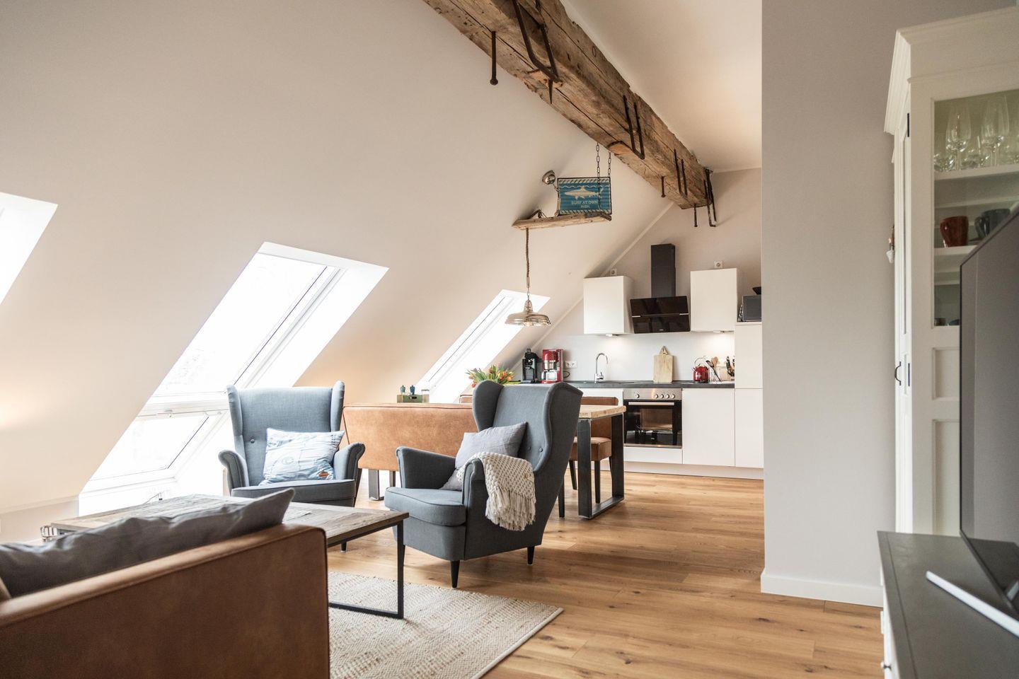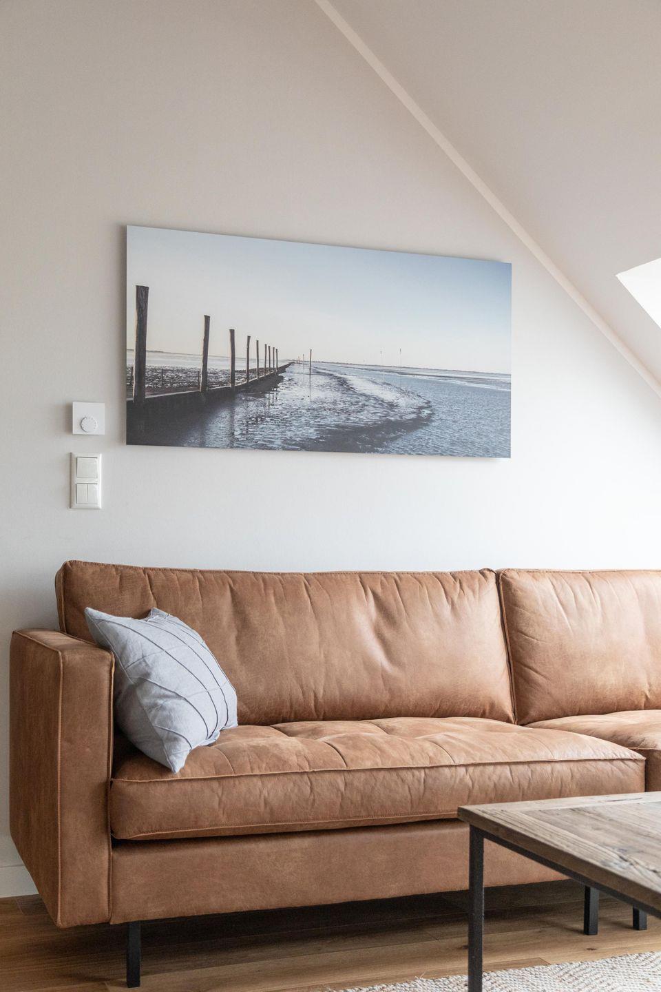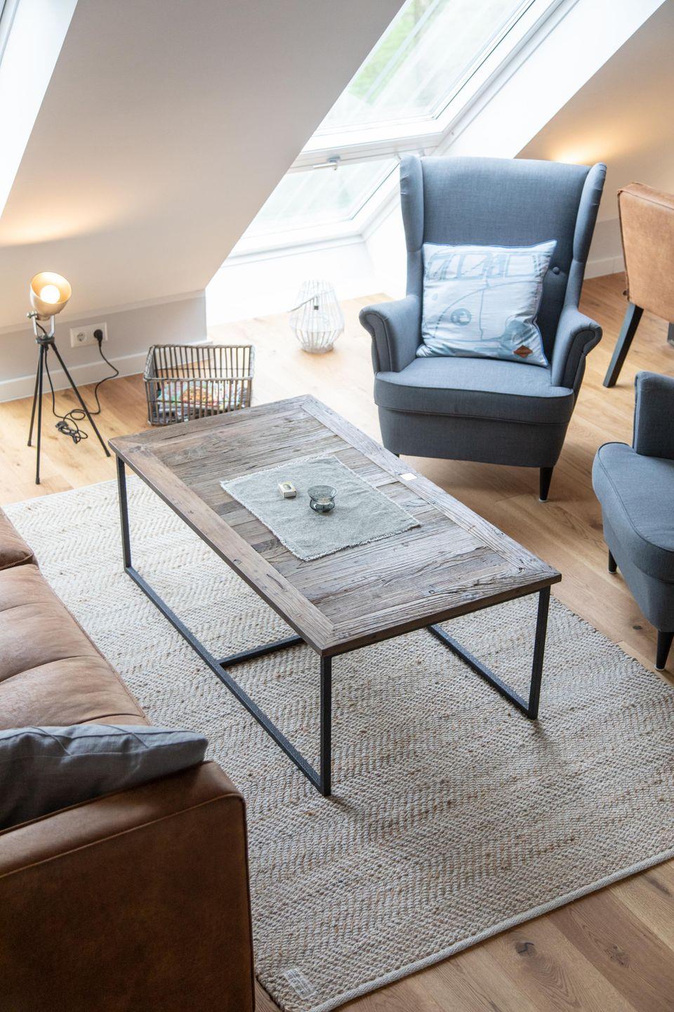 Im ersten Obergeschoss bildet der großzügige lichtdurchflutete Wohn- und Essbereich mit Küchenzeile das gemütliche Herz der Wohnung. Die vollausgestattete Küche lässt mit hochwertigem Geschirr, Mikrowelle und KitchenAid-Geräten keine Wünsche offen. An den einladenden Essbereich mit handgefertigtem Tisch und bequemen Lederstühlen schließt sich die heimelige Sofa-Ecke an: Sowohl von der extralangen Ledercouch als auch von den beiden Sesseln fällt der Blick durch das große Fenster auf den nahen Deich. Im Sommer lassen sich die Dachflächenfenster zu kleinen Balkonen öffnen.