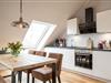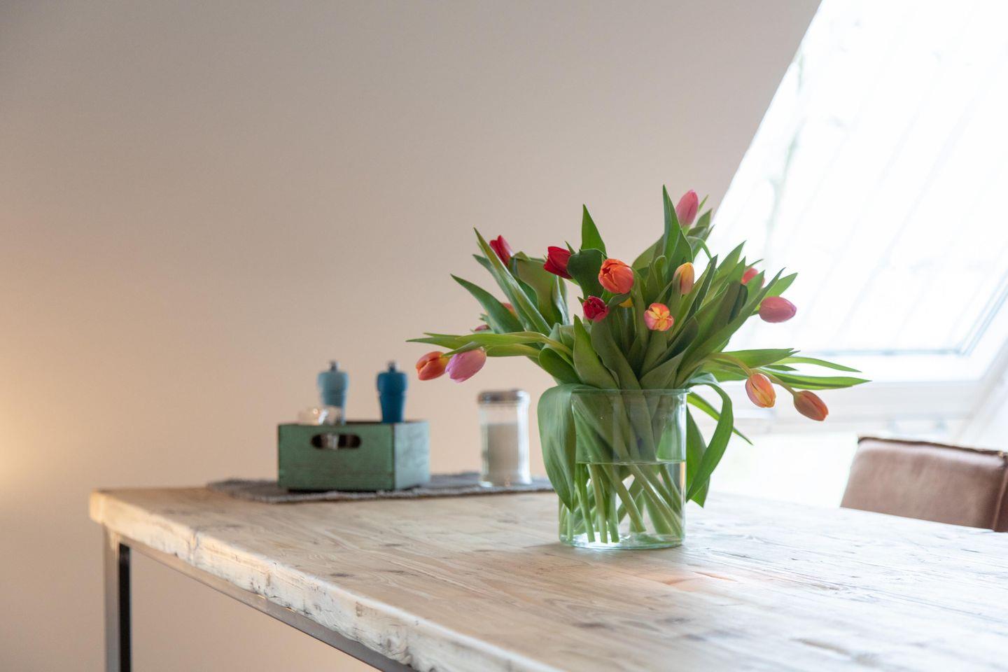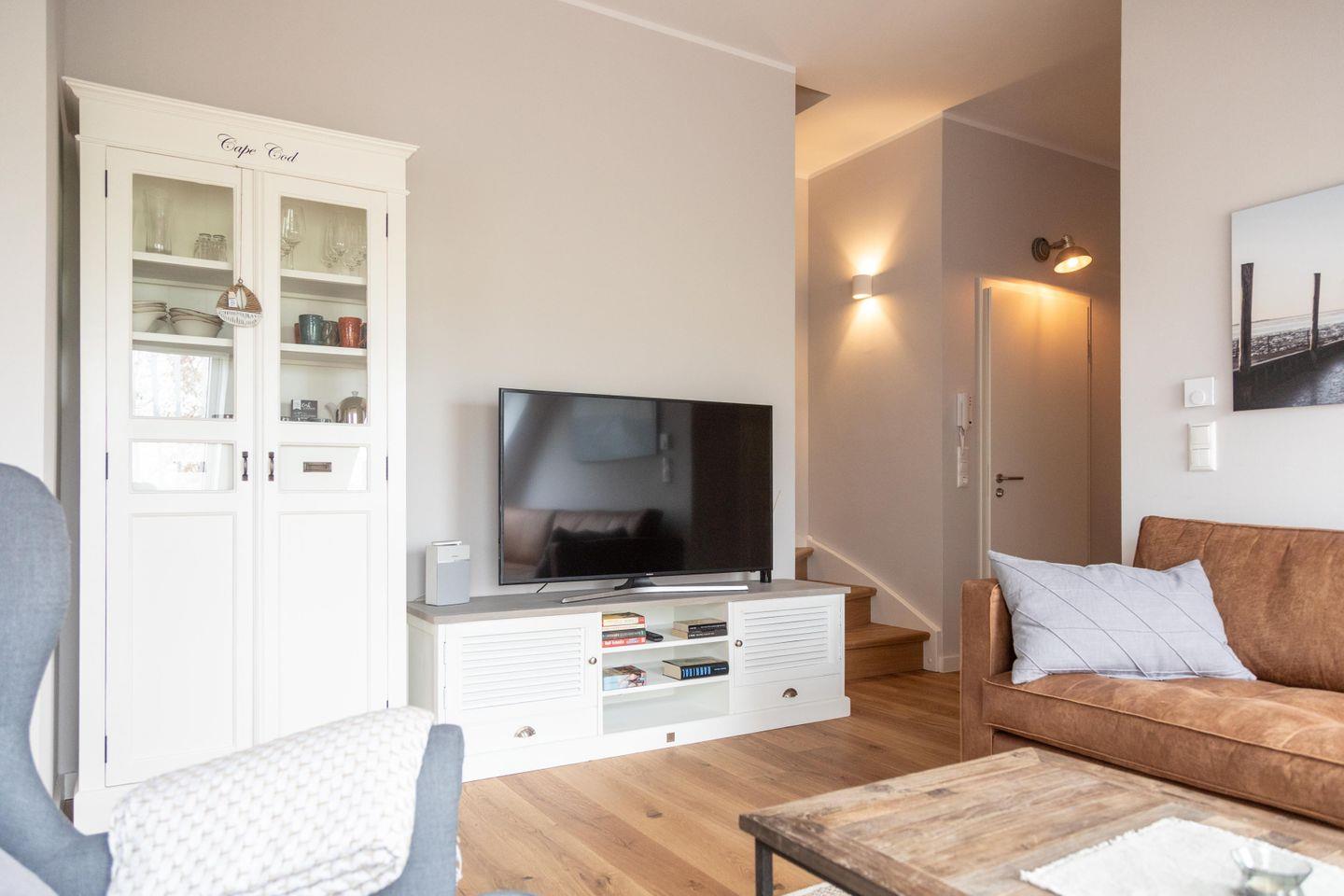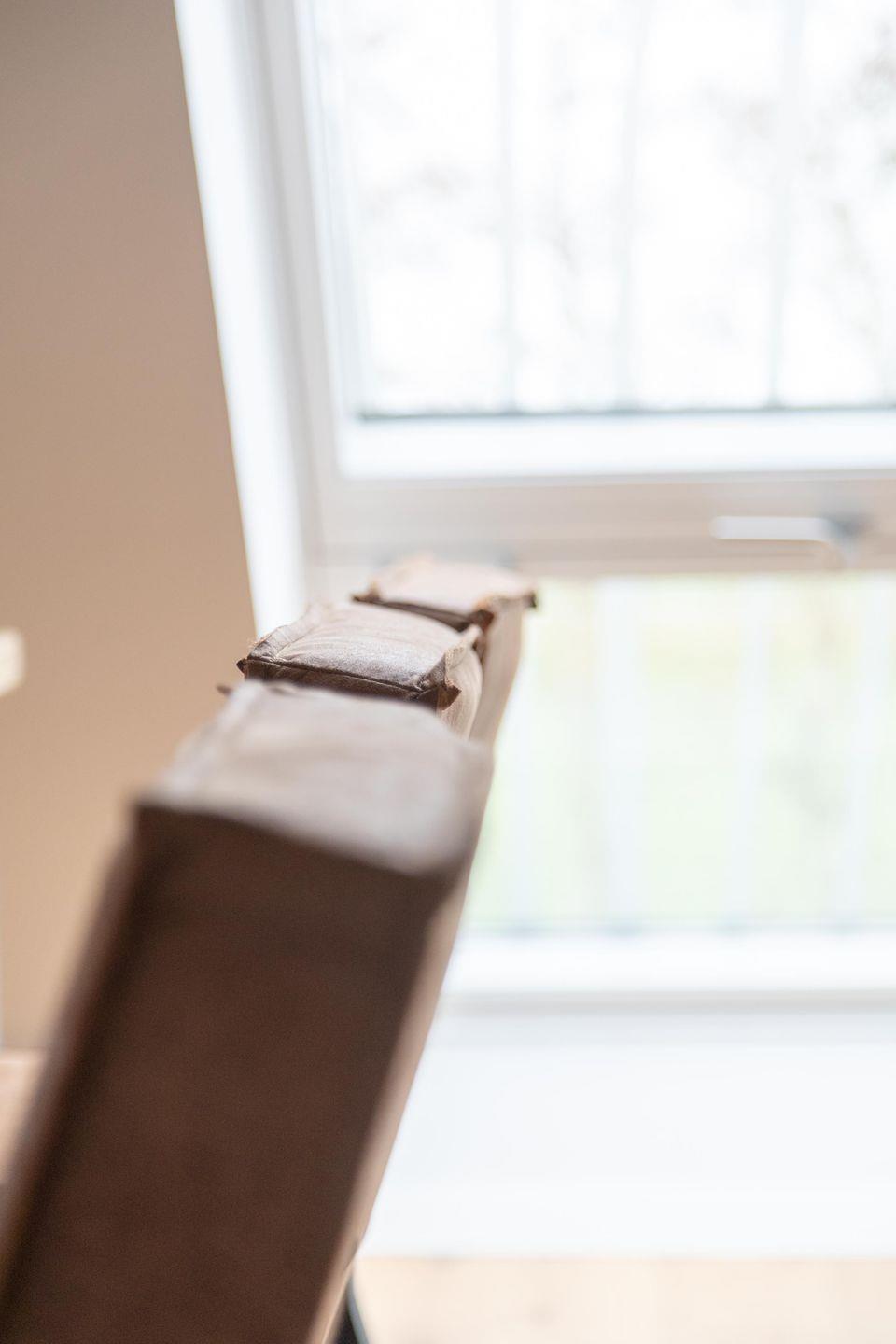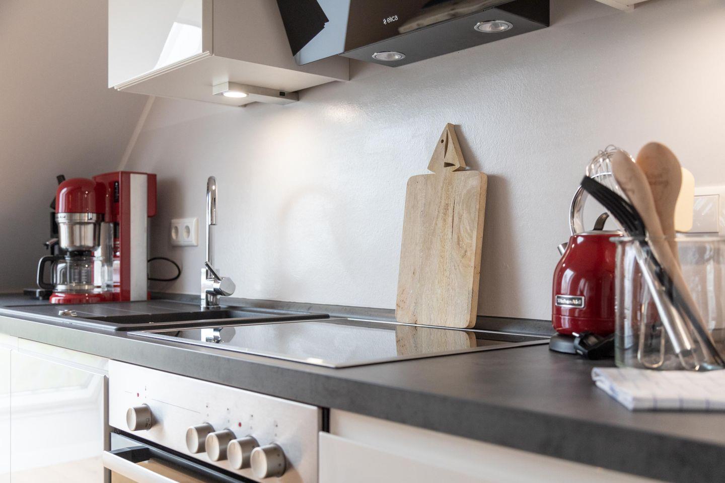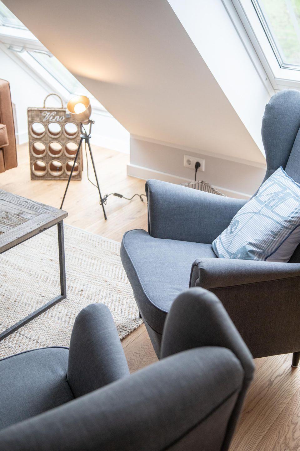 Im ersten Obergeschoss bildet der großzügige lichtdurchflutete Wohn- und Essbereich mit Küchenzeile das gemütliche Herz der Wohnung. Die vollausgestattete Küche lässt mit hochwertigem Geschirr, Mikrowelle und KitchenAid-Geräten keine Wünsche offen. An den einladenden Essbereich mit handgefertigtem Tisch und bequemen Lederstühlen schließt sich die heimelige Sofa-Ecke an: Sowohl von der extralangen Ledercouch als auch von den beiden Sesseln fällt der Blick durch das große Fenster auf den nahen Deich. Im Sommer lassen sich die Dachflächenfenster zu kleinen Balkonen öffnen.