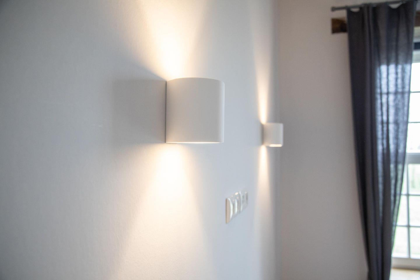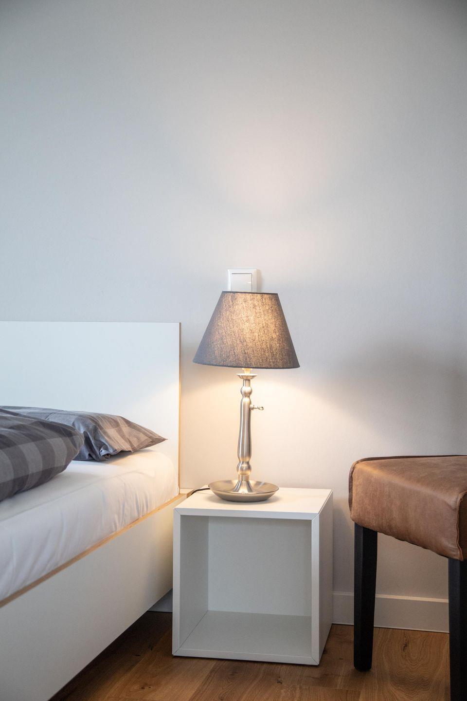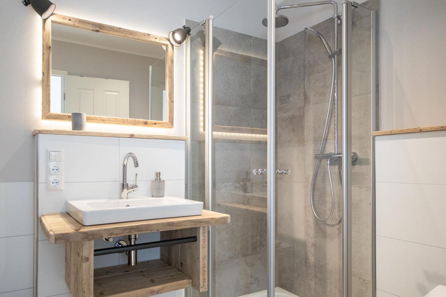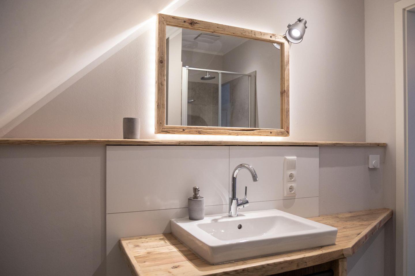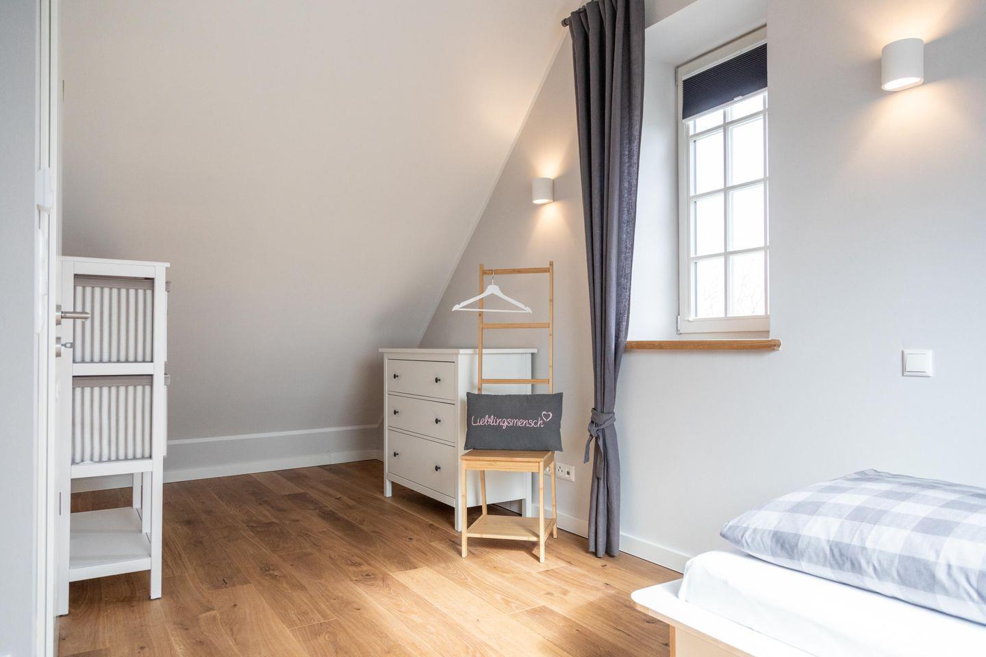 Auf derselben Etage befinden sich außerdem ein Schlafzimmer mit Doppelbett sowie ein Bad mit Dusche. Weitere Schlafmöglichkeiten findest du im Dachgeschoss: Dort gibt es ein Schlafzimmer mit einem Doppelbett sowie ein weiteres mit zwei Einzelbetten. Alle Betten wurden von einem Schreiner aus der Region gefertigt und sorgen mit bequemen Matratzen und hautsympathischem Bettzeug für süße Träume. Das Bad im Dachgeschoss präsentiert sich mit Dusche und Eck-Badewanne als kleiner Wellnessbereich.