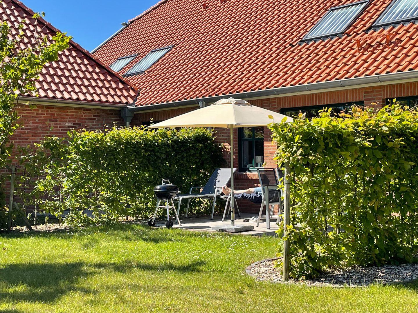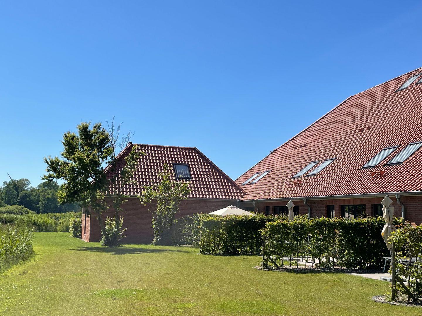 Übrigens: Zur Wohnung Habbo gehört auch eine Terrasse auf dem weitläufigen Grundstück des Gulfhofs. Diese erreichst du bequem durch den Flur im Wohnteil.