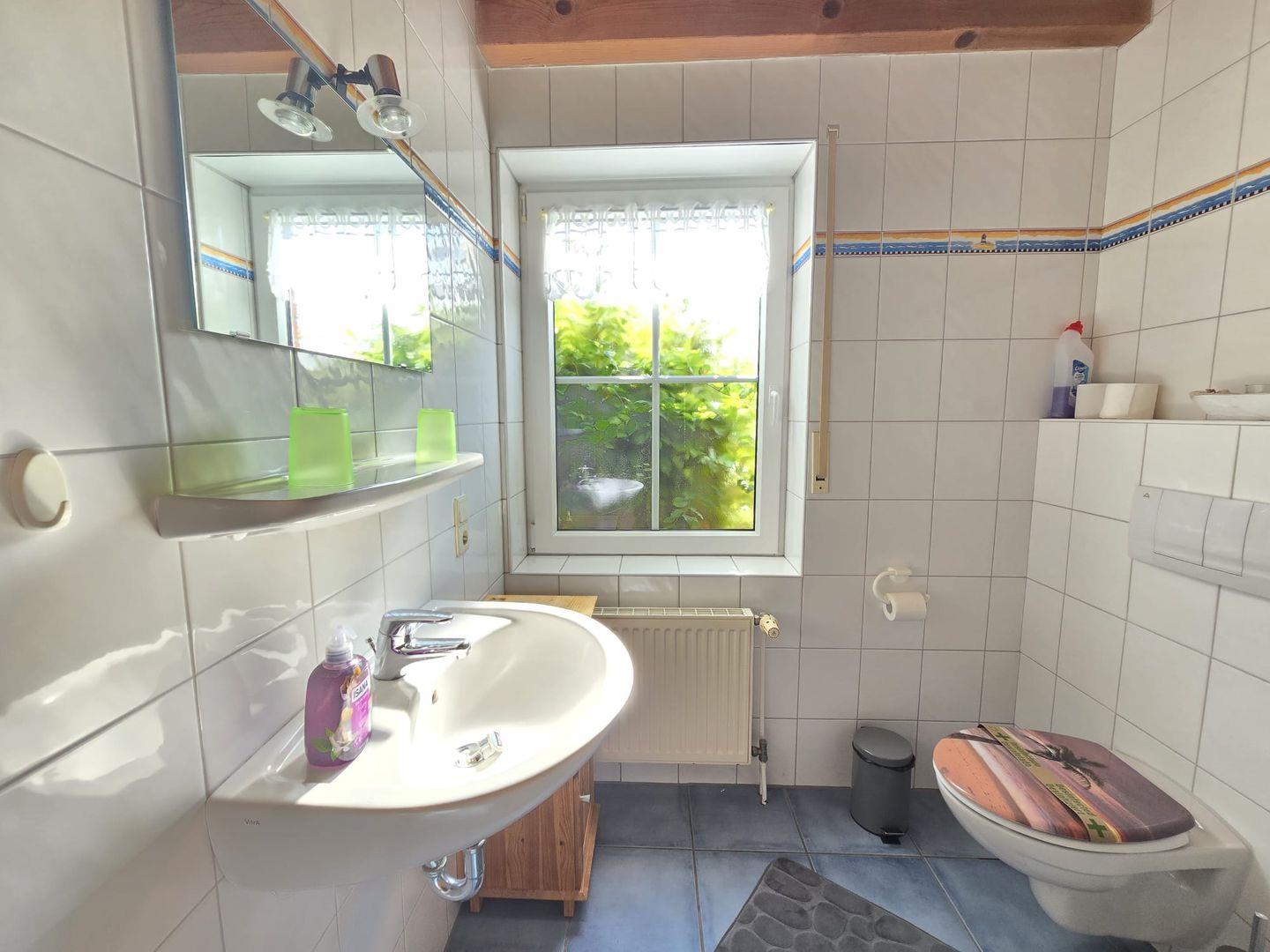 Im Obergeschoss befinden sich ein weiteres Elternschlafzimmer, ein Kinderzimmer sowie ein kleines, kindgerecht ausgestattetes Badezimmer. Beide Schlafzimmer sind ebenfalls mit Korkparkett ausgelegt und bieten dank Rollläden die Möglichkeit zur vollständigen Verdunkelung. Die Betten sind für Allergiker geeignet, weshalb Haustiere im gesamten Haus nicht erlaubt sind. Das zusätzliche Badezimmer verfügt über Dusche und WC sowie über kindgerechte Extras wie Toilettensitz und Tritthocker. Bettwäsche und Handtücher können gegen Aufpreis hinzugebucht werden.