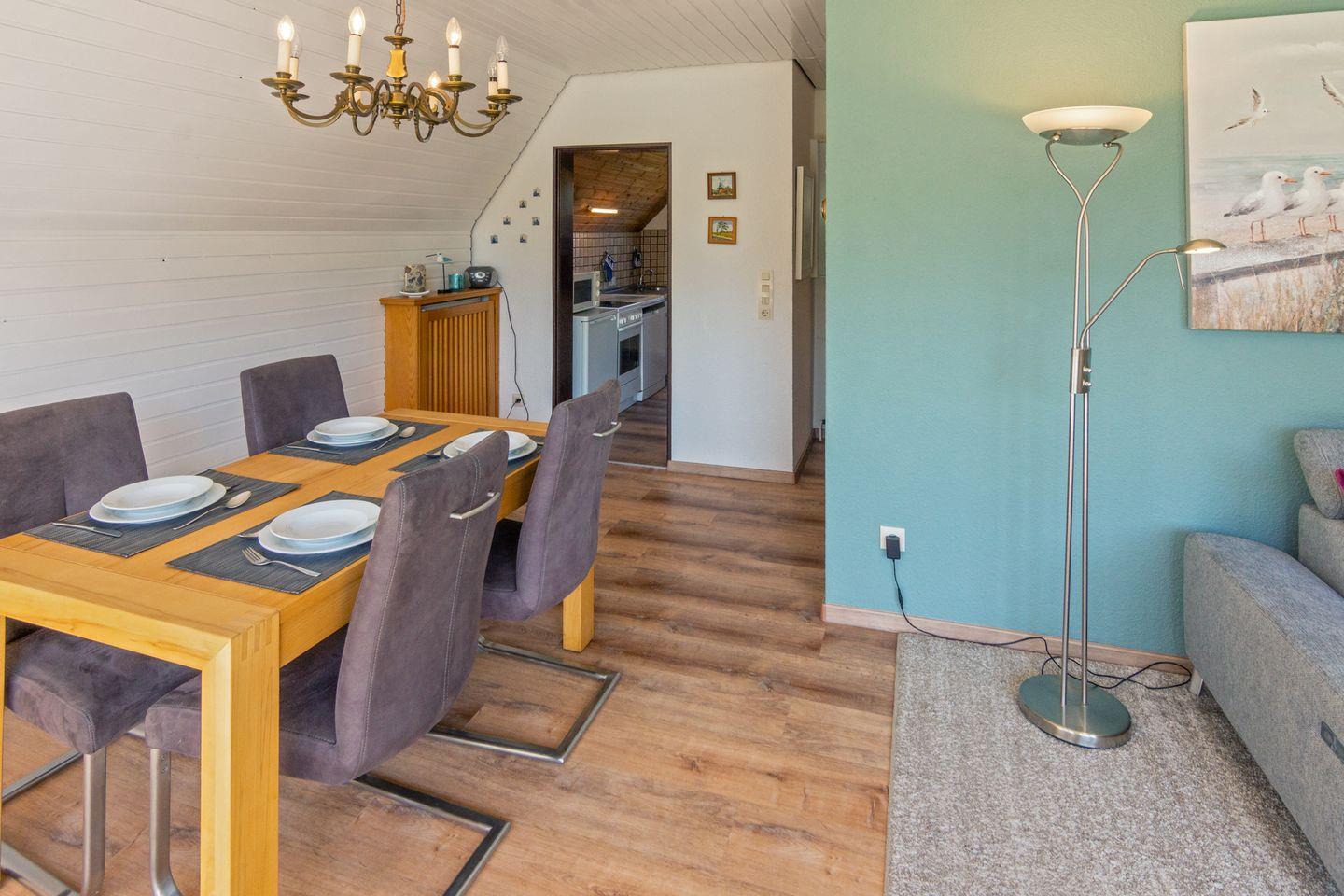 Die Küche ist voll ausgestattet mit Ceran-Herd, Backofen, Mikrowelle, Kühlschrank mit Gefrierfach, Spülmaschine, Toaster, Wasserkocher, Mixer, Eierkocher sowie Geschirr und Küchenutensilien. Für Kaffeeliebhaber stehen eine Kaffeemaschine und eine Senseo-Espressomaschine bereit. Der Essbereich mit Esstisch lädt zum gemeinsamen Essen ein.