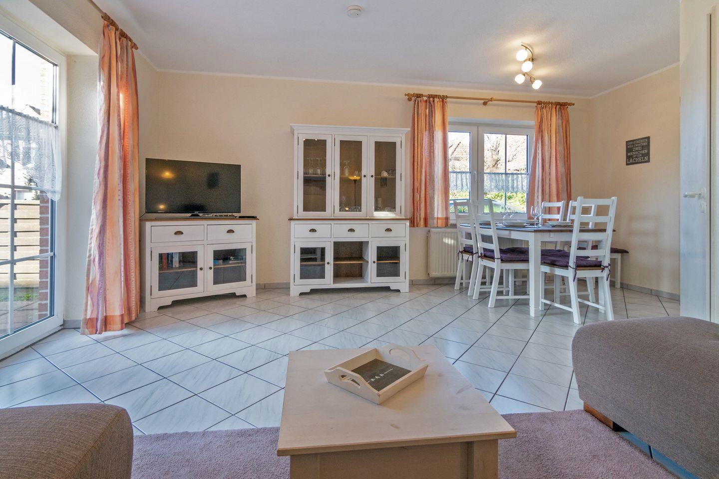Der Wohnbereich verfügt über Sofa und Essplatz sowie TV (Sat), WLAN, Radio, CD-Spieler und HiFi-Anlage. Bücher und Spiele sorgen für Unterhaltung. Praktische Ausstattung wie Garderobe, Rauchmelder, Staubsauger, Wäscheständer sowie Bügeleisen und Bügelbrett sind vorhanden, ebenso eine Waschmaschine.