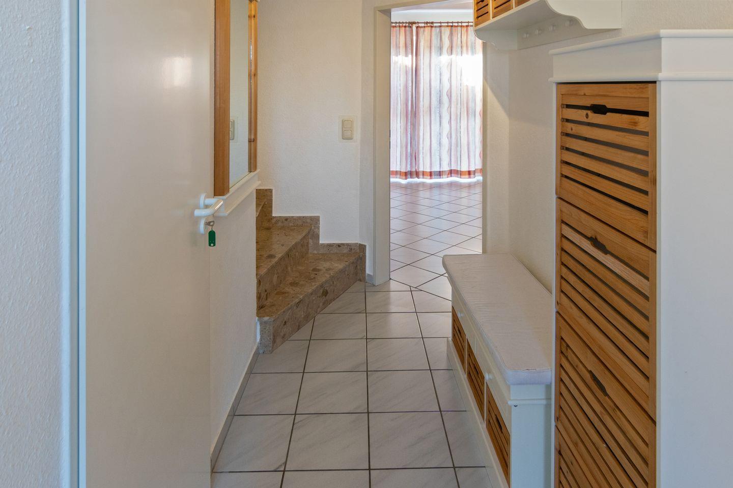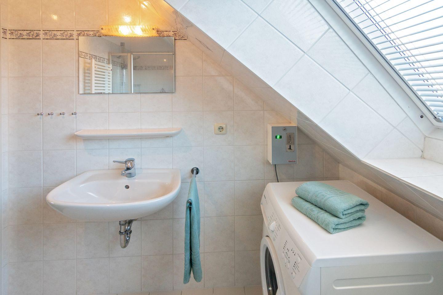 Das Badezimmer bietet Dusche, WC, Fenster und Haartrockner, zusätzlich gibt es ein Gäste-WC. Für Familien stehen Babybett, Hochstuhl und Treppengitter bereit.