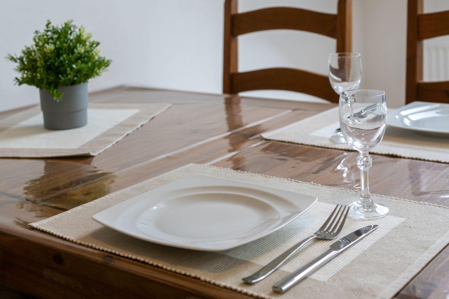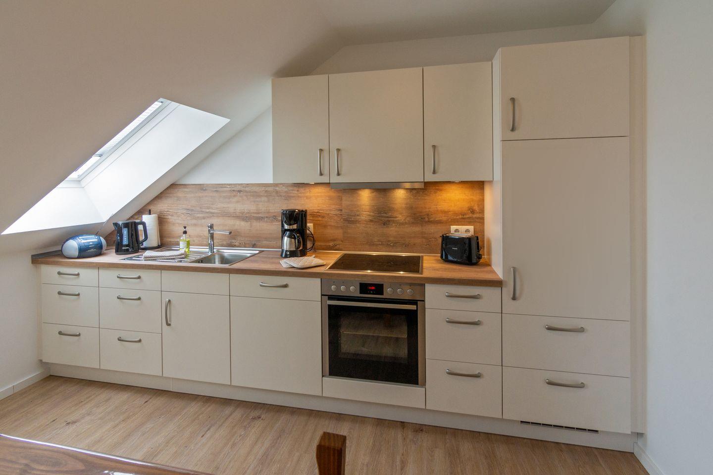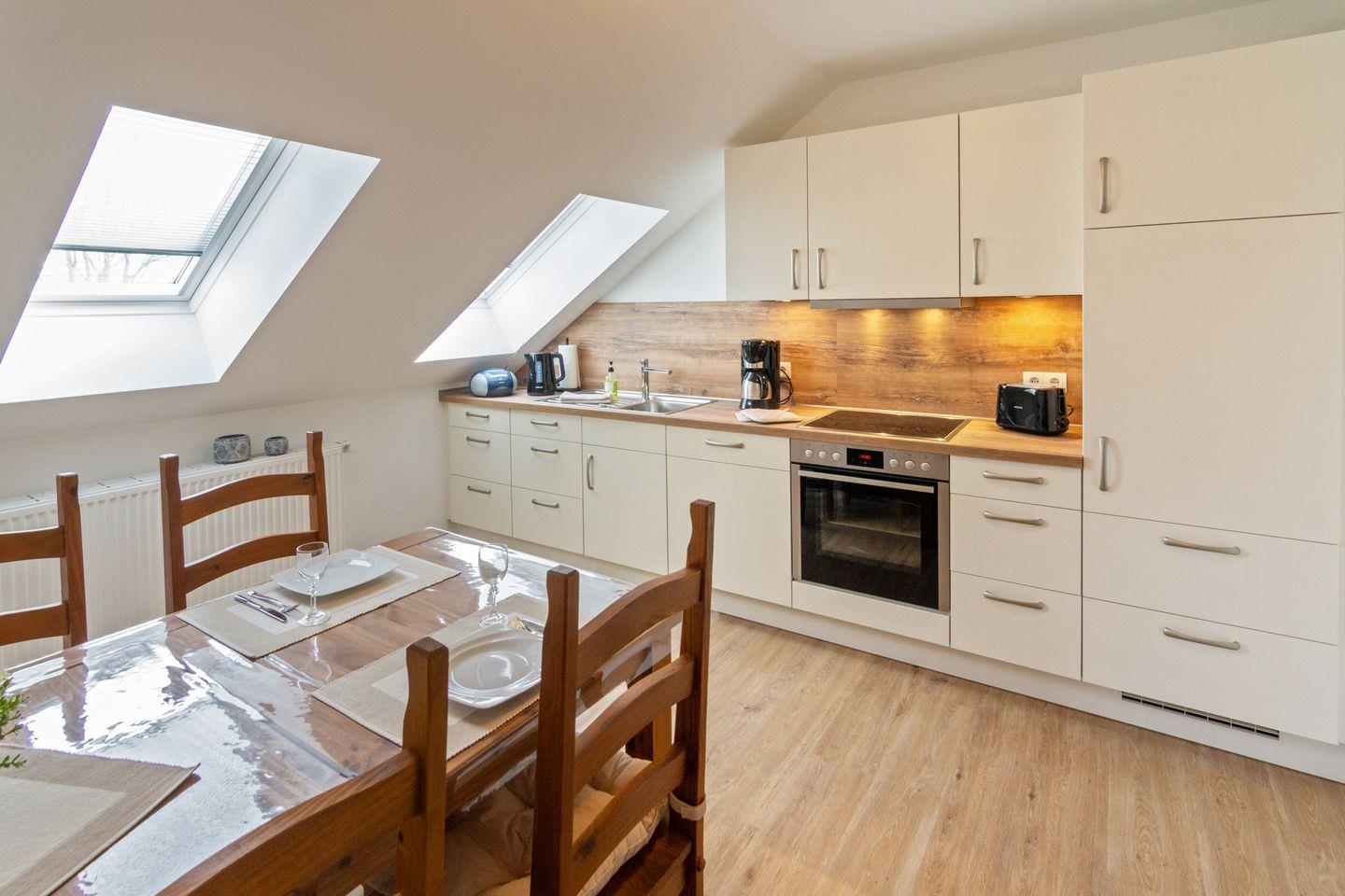Die voll ausgestattete Küche lässt keine Wünsche offen: Cerankochfeld, Backofen, Spülmaschine, Kaffeemaschine und alle nötigen Küchenutensilien sind vorhanden. Der angrenzende Essbereich lädt zu gemeinsamen Mahlzeiten ein.