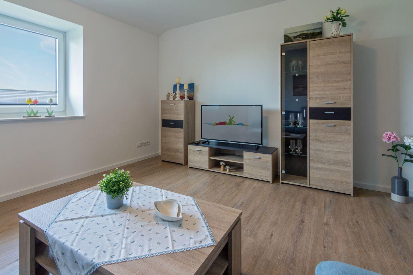 Auf 53 m² bietet die Wohnung Platz für zwei Personen. Sie verfügt über ein separates Schlafzimmer sowie ein helles Wohnzimmer mit Sofa-Ecke, Esstisch und modernem Fernseher. Eine zentrale Heizungsanlage sorgt ganzjährig für Wohlfühlklima.