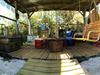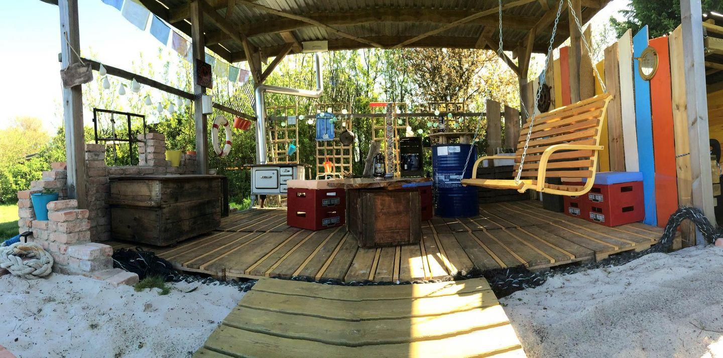 Als weitere Attraktion finden Sie im Garten den „Hasenbaudraufschaubau“: Eine großzügige, überdachte Sitzmöglichkeit mit Hängeschaukel, Stromanschluss und funktionierendem Ofen.