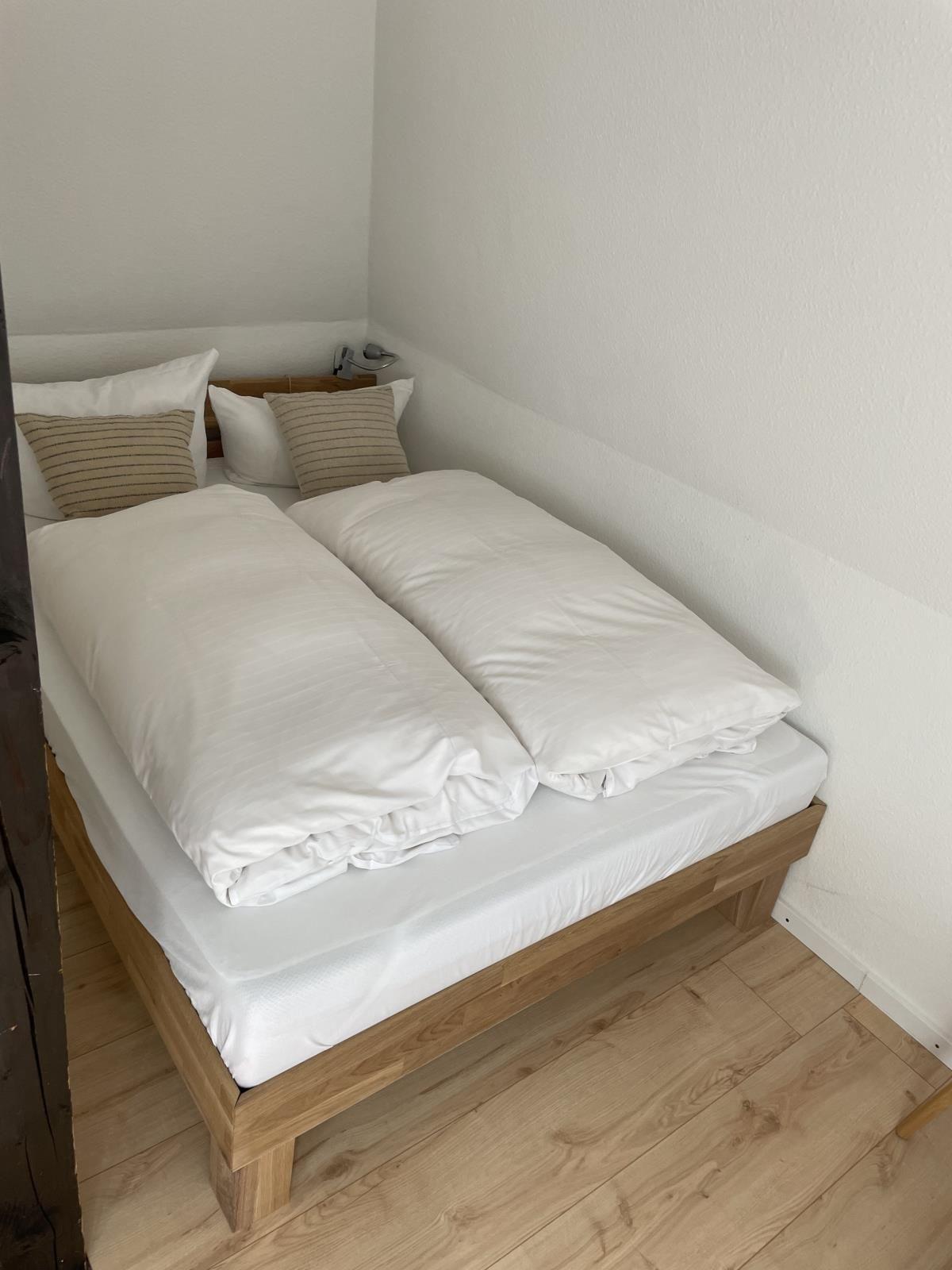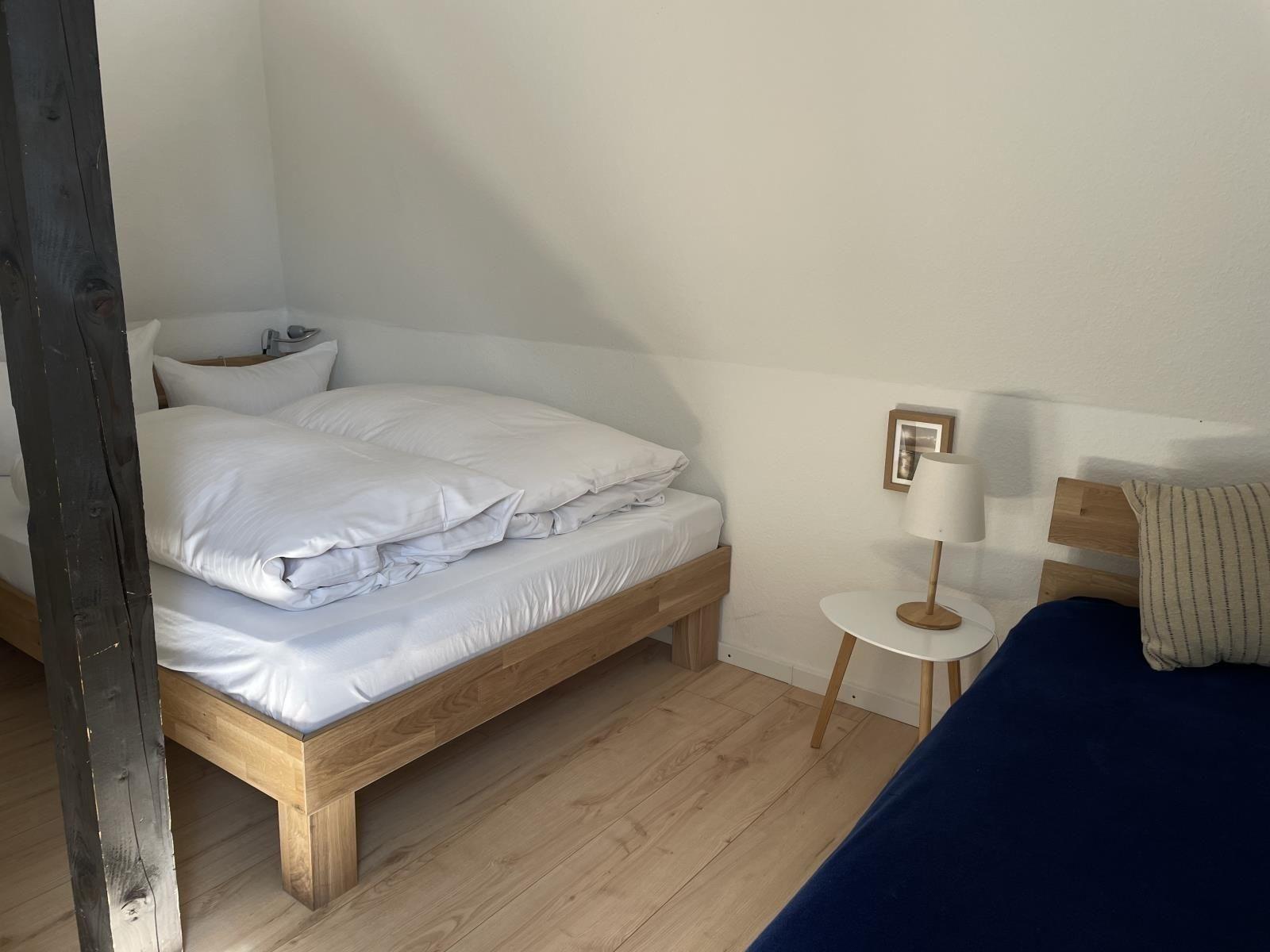 Die Ferienwohnung bietet eine komfortable und gut ausgestattete Unterkunft für erholsame Tage. Sie verfügt über ein Schlafzimmer mit einem Doppelbett und einem Einzelbett, ideal für Familien oder Paare. Das Duschbad ist modern und funktional.
