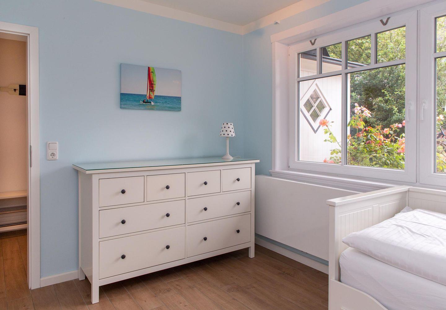 Das Kinderzimmer ist liebevoll dekoriert und mit zwei Einzelbetten ausgestattet. Die Betten können ausgeklappt werden, sodass in diesem Zimmer bis zu 4 Kinder Platz finden.