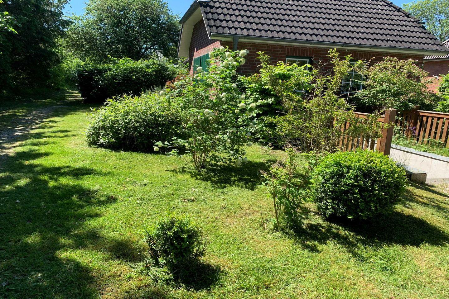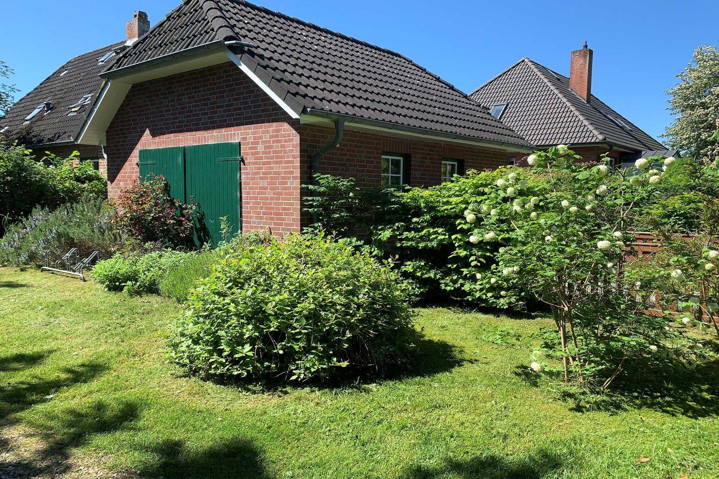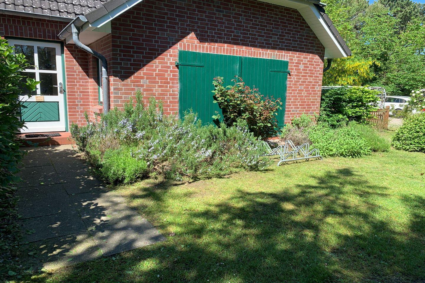 Garten mit Sonnen- und Schattenplätzen und Strandkörben auf 1.700 m² großem Grundstück, Bollerwagen für den Weg zum Strand. Unterstellplätze für Fahrräder und Stellplätze für Autos am Haus.