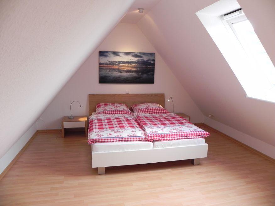 Die Ferienwohnung *Auer Lun* (Friesisch: über Land) im 1. Ober- und Dachgeschoss links des Hauses *Nordlicht* in Nebel auf Amrum ist eine 1,5-Zimmer-Maisonette-Ferienwohnung (ca. 44 qm Grundfläche) mit Schlafmöglichkeiten für 1 bis 2 Personen. Blick über das Wattenmeer bis nach Föhr.