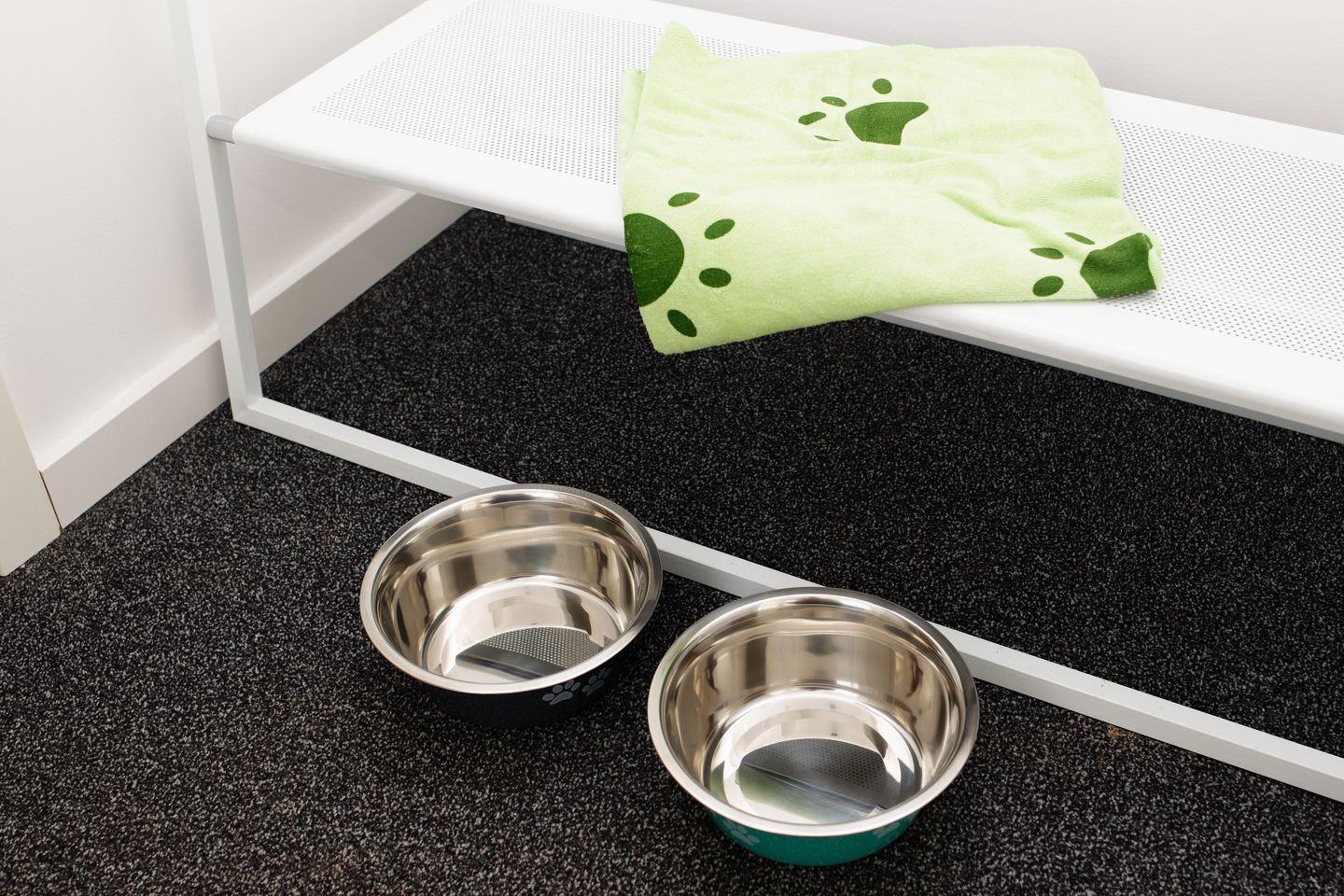 - Fressnäpfe und Handtuch für nasse Pfoten werden bereitgestellt