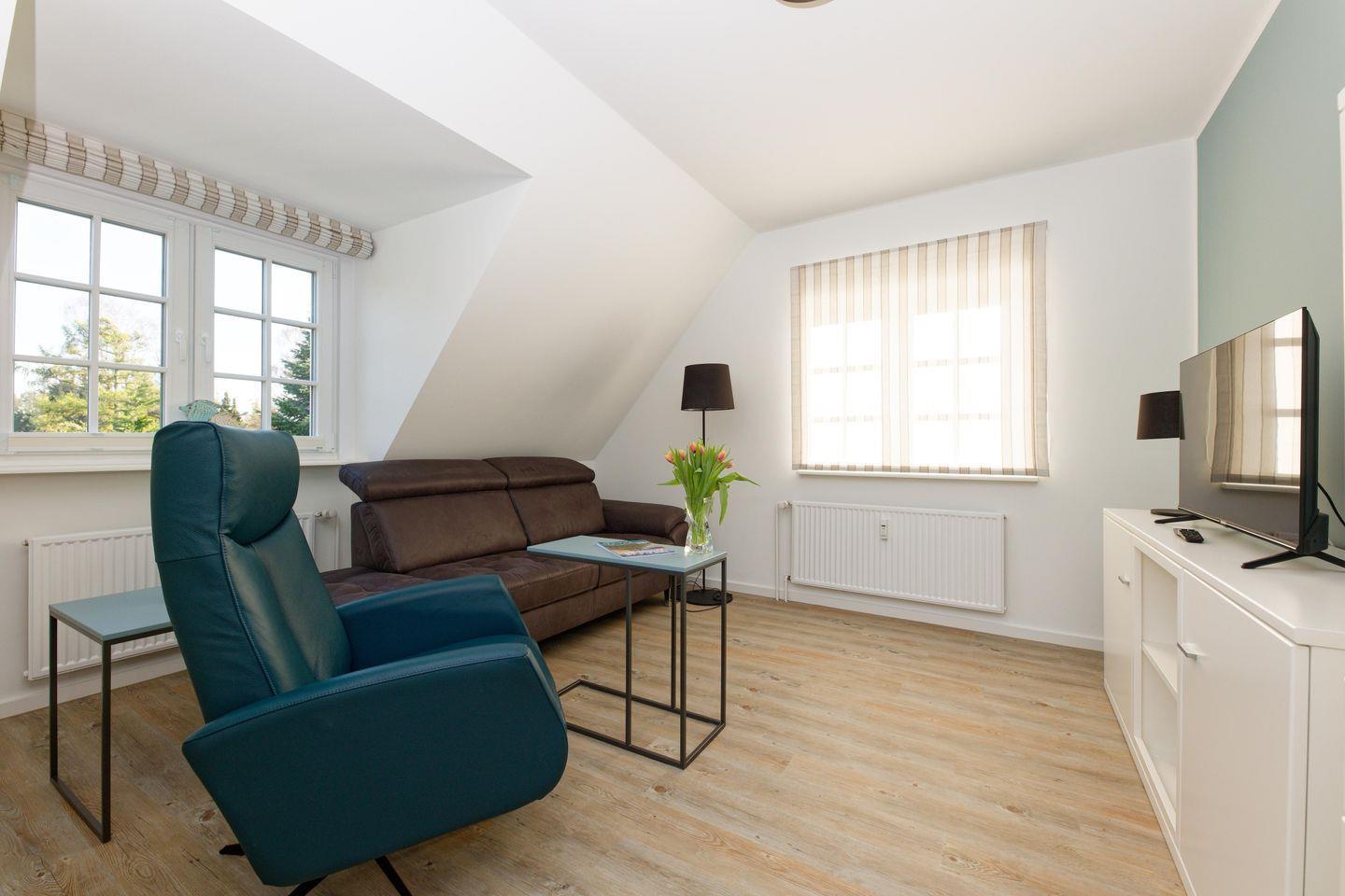 Wohnzimmer mit einem Sofa, Küche, Duschbad/WC, 1 Doppelschlafzimmer.