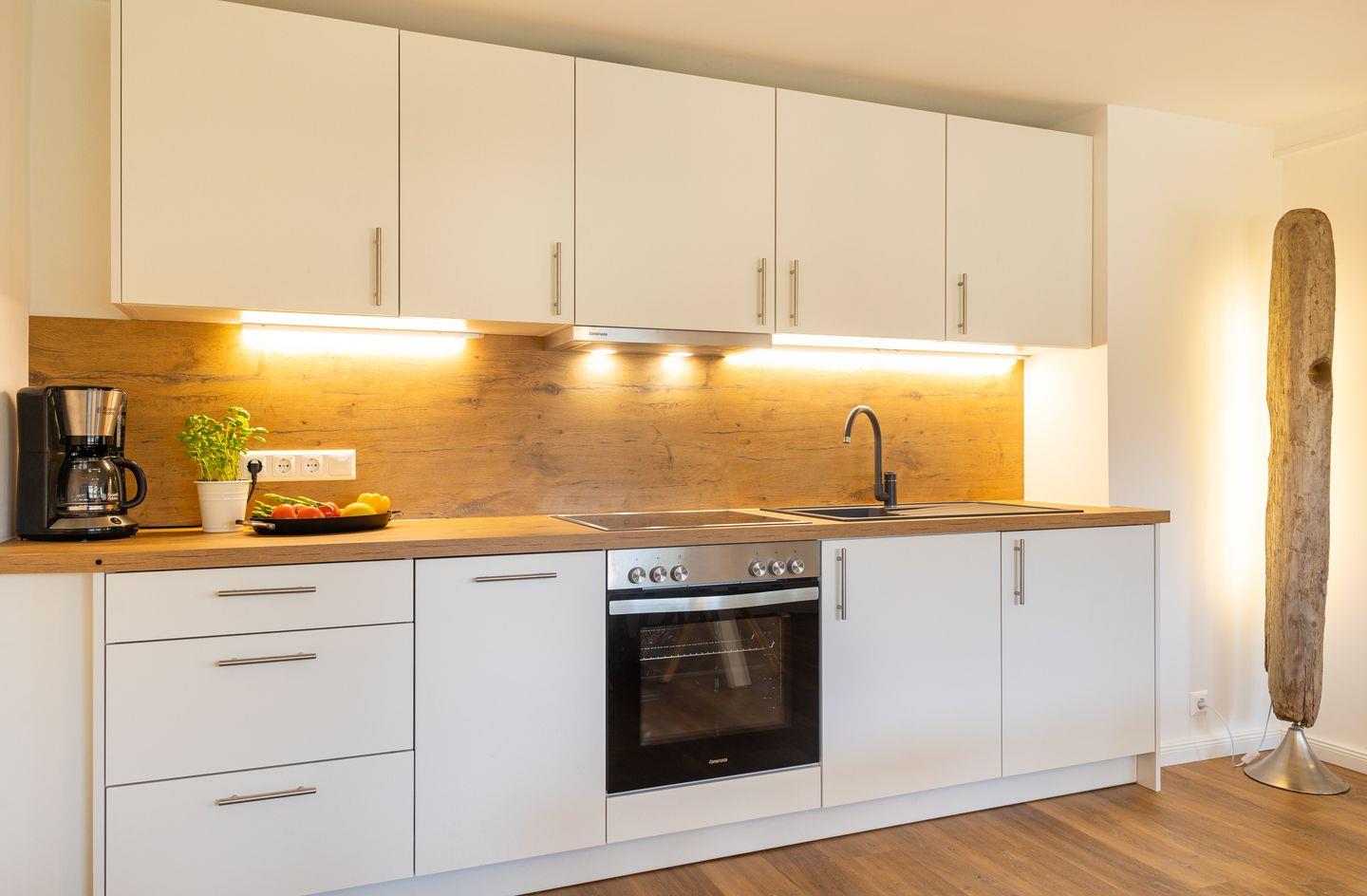 - Küche mit einem Cerankochfeld, Ofen, Toaster, Kaffeemaschine, Wasserkocher, Mikrowelle, Geschirrspüler & Küchenutensilien