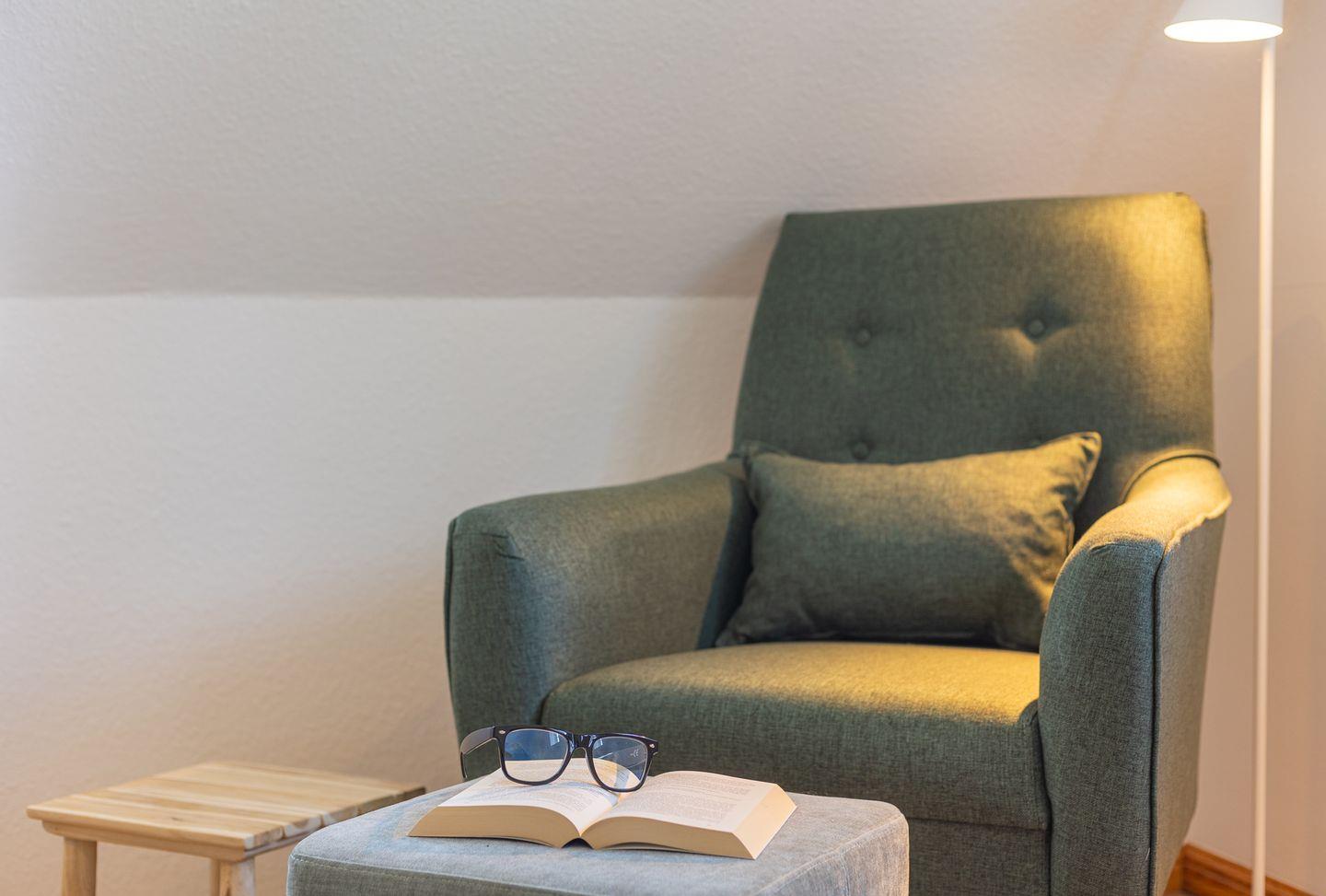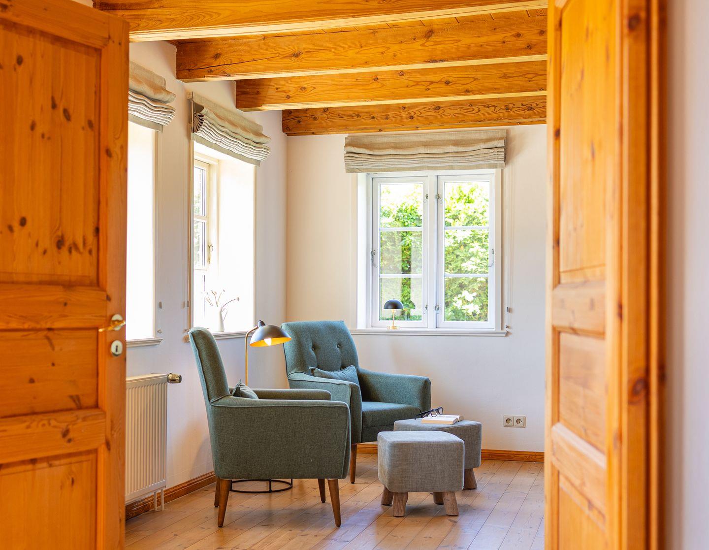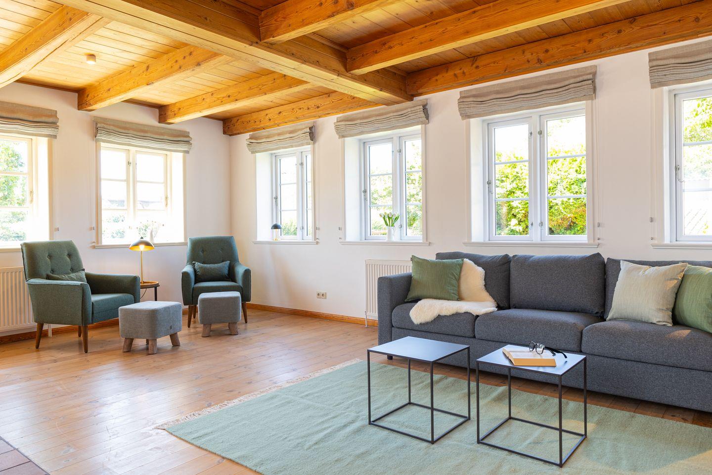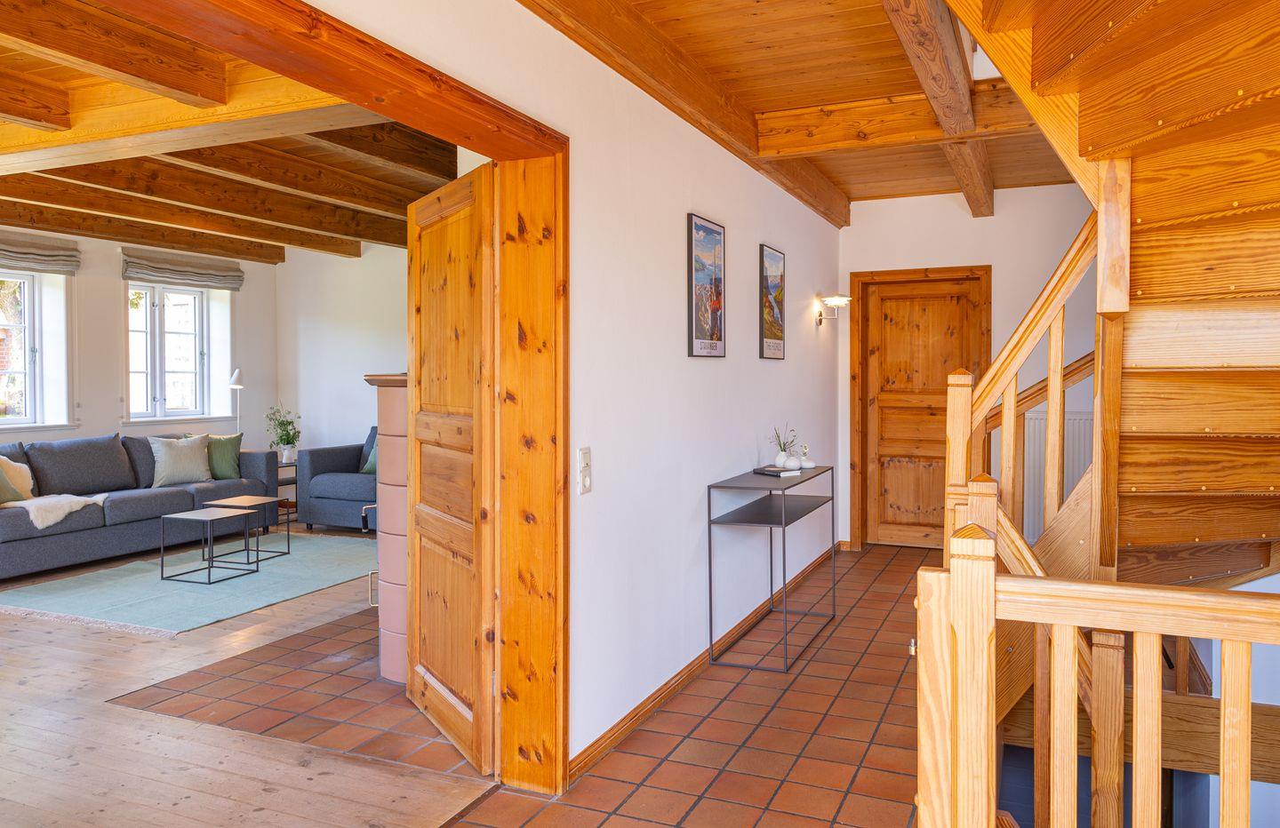 Die Räume im Friesenhaus teilen sich auf in einem großen Flur im Erdgeschoß, eine große separate Küche mit Esstisch und ein großes Wohnzimmer mit vielen gemütlichen Sitzplätzen. Im Erdgeschoß befindet sich zusätzlich ein Hauswirtschaftsraum mit einer Waschmaschine und einem Trockner.