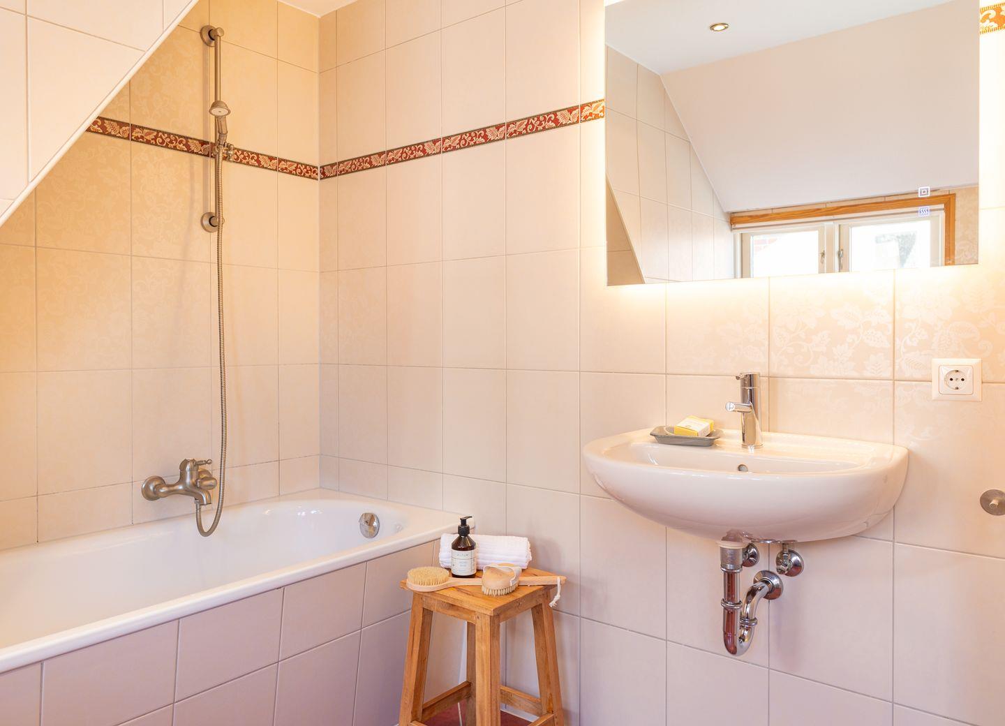 Im ersten Stockwerk finden sich die zwei Schlafzimmer. Sie sind jeweils mit einem 1,80 m breiten Boxspringbett ausgestattet. In jedem Zimmer befindet sich ein Schrank. Das Bad mit Badewanne ist ebenfalls im ersten Obergeschoß. Im Flur steht Ihnen außerdem ein Schreibtisch zur Verfügung.