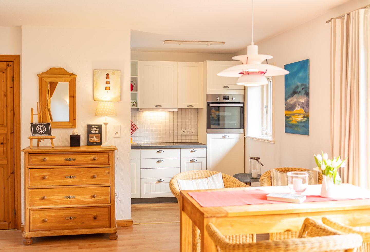 Das 4-Sterne-Haus bietet Ihnen allen Komfort für bis zu 4 Personen mit Wohnzimmer, Küche, Bad, Gäste WC, zwei separaten Schlafzimmern und einem gemütlichen dänischen Ofen. Das Haus ist sehr liebevoll zum Teil mit antiken Möbeln eingerichtet und verfügt über einen großen Plasma-TV und Radio mit CD-Player. Die sehr großzügige Küche enthält einen Geschirrspüler und Backofen.Tisch- und Bettwäsche sowie Handtücher werden gestellt. Waschmaschine und Trockner sind am Haus und kostenfrei nutzbar. Gepflegte Fahrräder stehen zu Ihrer freien Nutzung bereit.