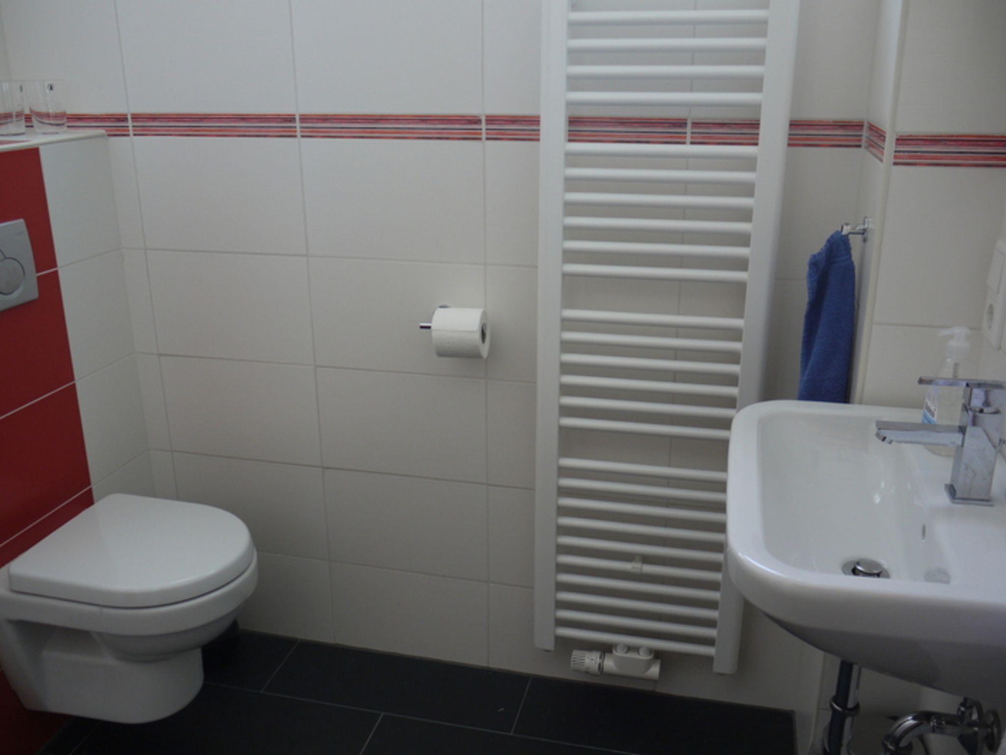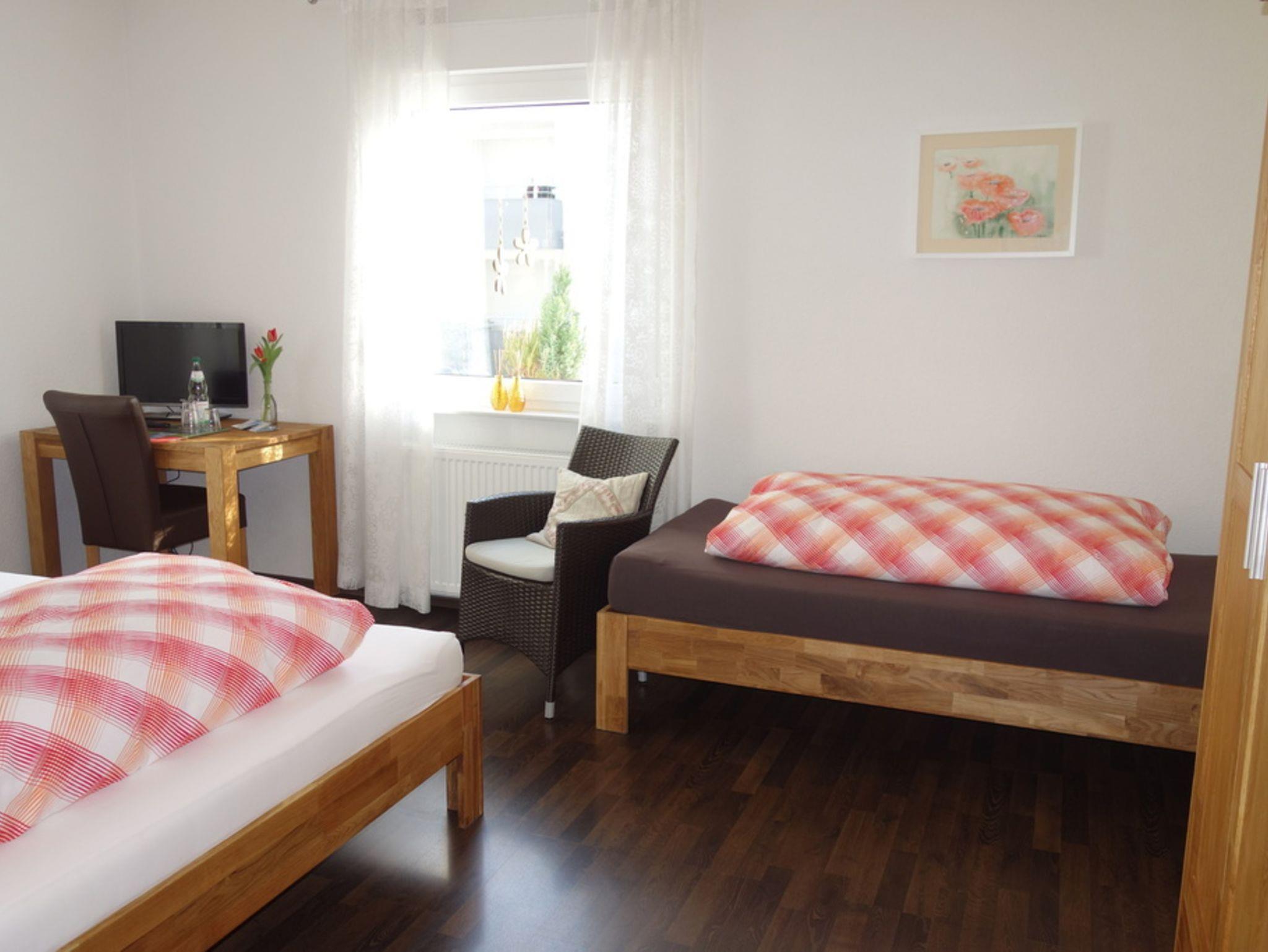 Das Dreibettzimmer ist ausgestattet mit Kabel TV, WLAN, Tresor und einem Schreibtisch. Das Badezimmer mit Dusche/WC befindet sich auf dem Flur, wird aber durch keine anderen Gäste benutzt. Fön und Handtücher sind vorhanden.