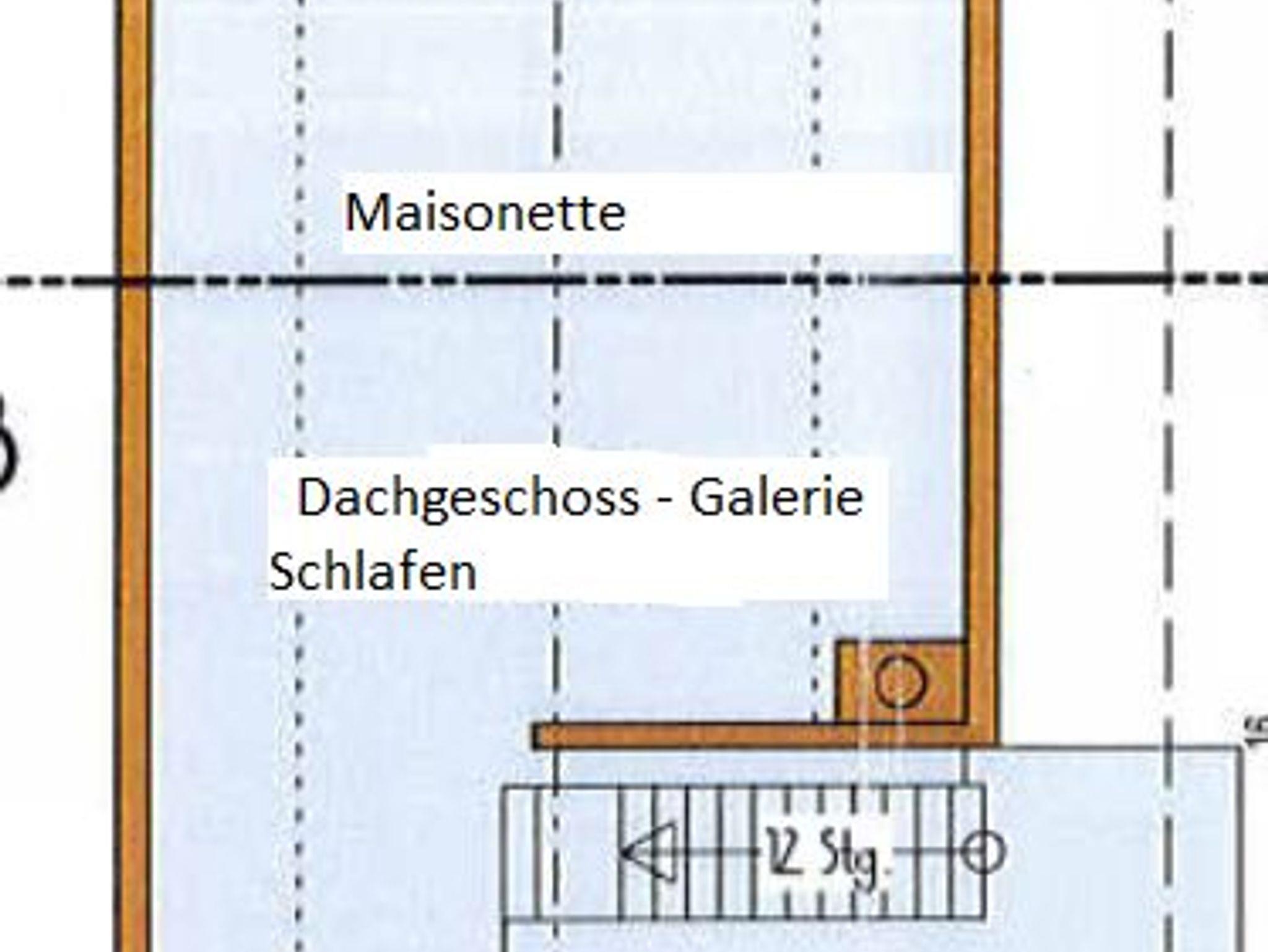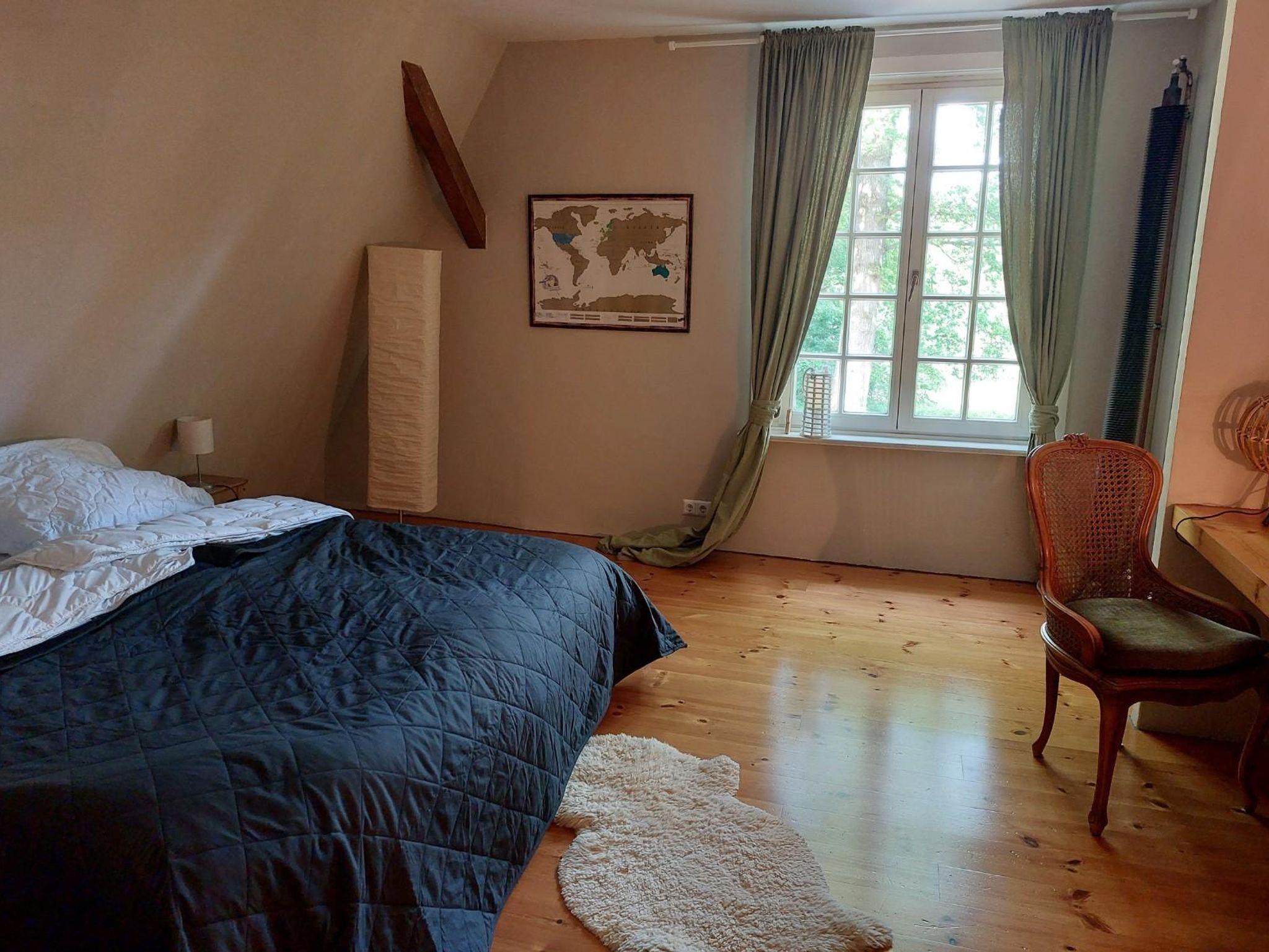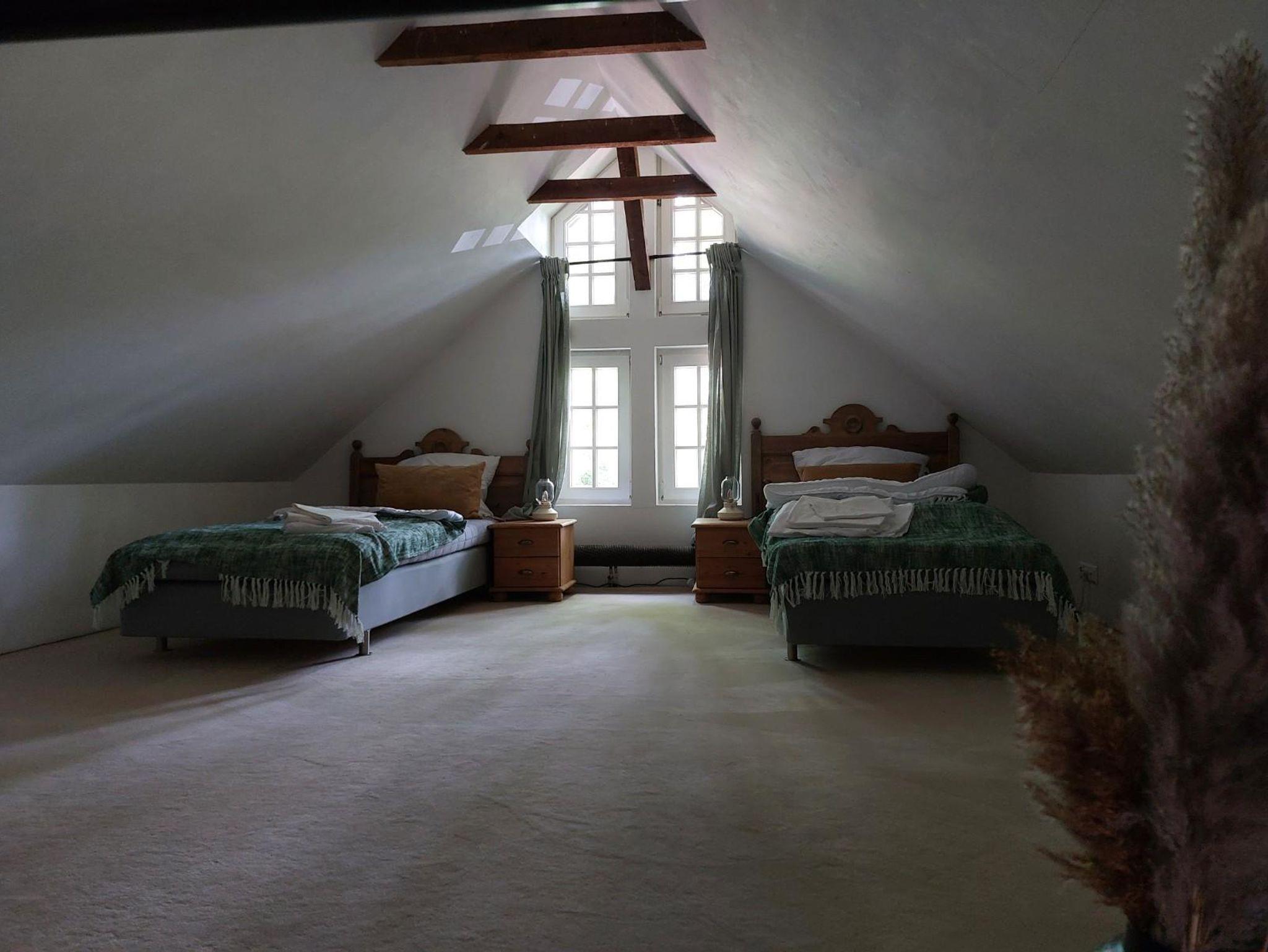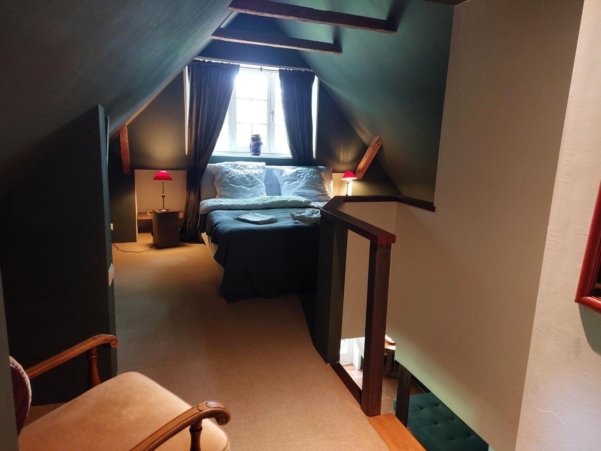 Das Ferienhaus bietet 3 Schlafzimmer mit jeweils einem Doppelbett. Von einem Schlafzimmer führt eine steile Treppe ins Dachgeschoss zur offenen Galerie mit weiteren drei Einzelbetten.