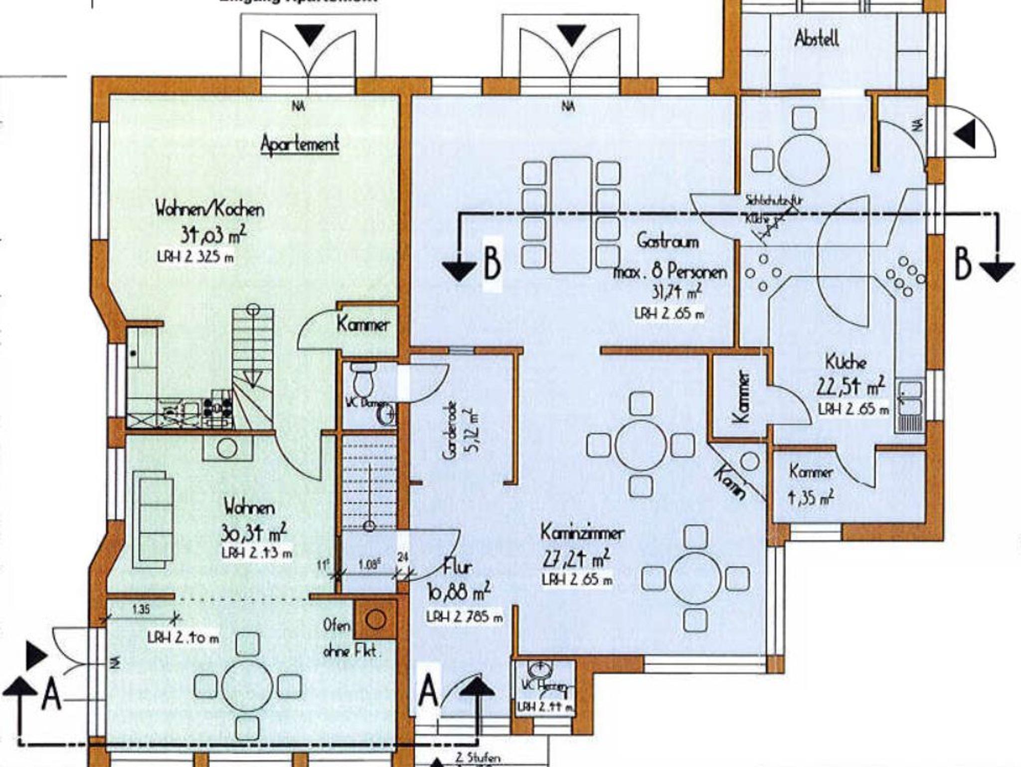 Der Saal des Hauses lädt zum Essen und Trinken ein, hier finden Sie große Tafeln an denen Sie gemeinsam dinieren können, was Sie in der Gemeinschaftsküche zubereitet haben - und vielleicht spielt ja jemand für Sie am Klavier? Außerdem können Sie in diesem Bereich auch ein Feuerchen schüren und den Abend gemütlich ausklingen lassen.