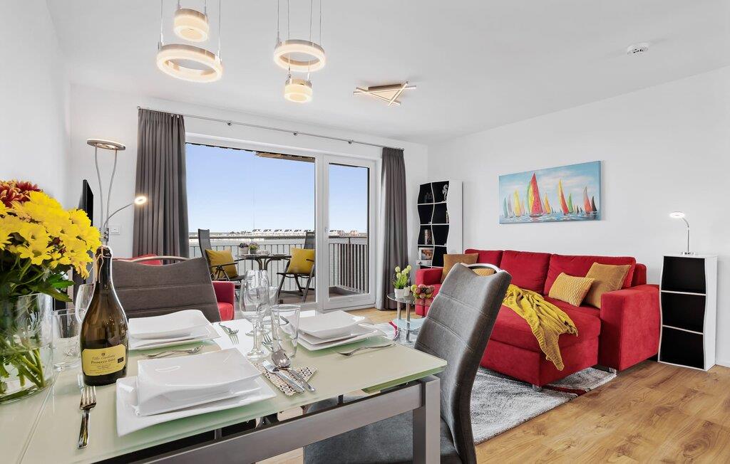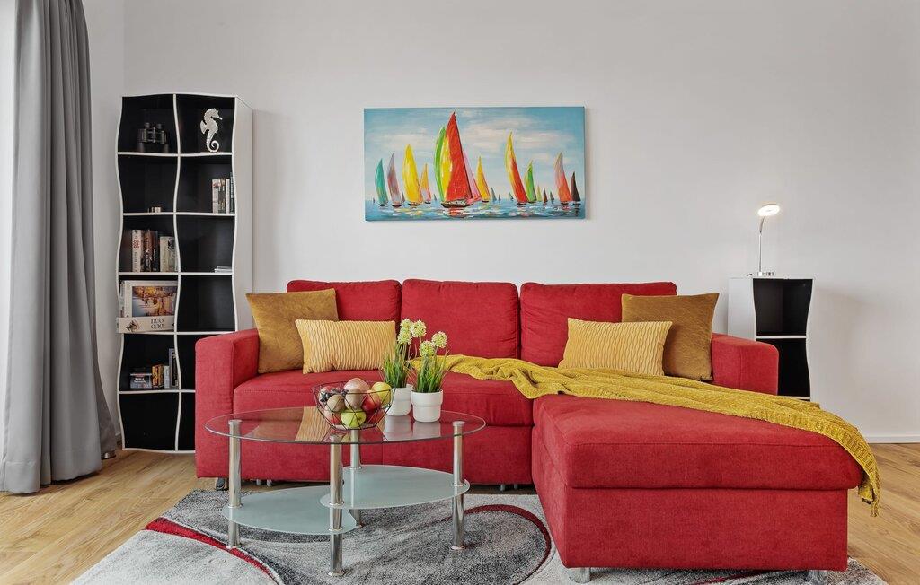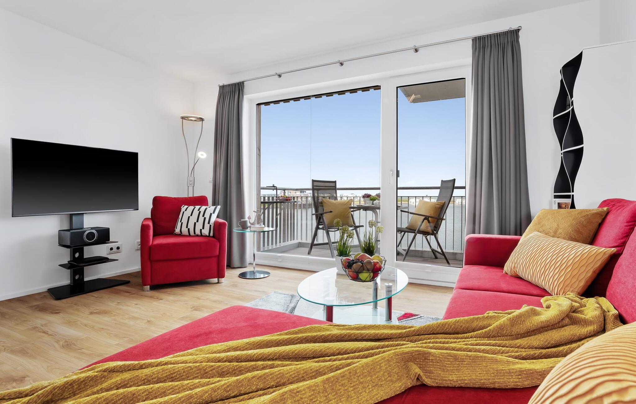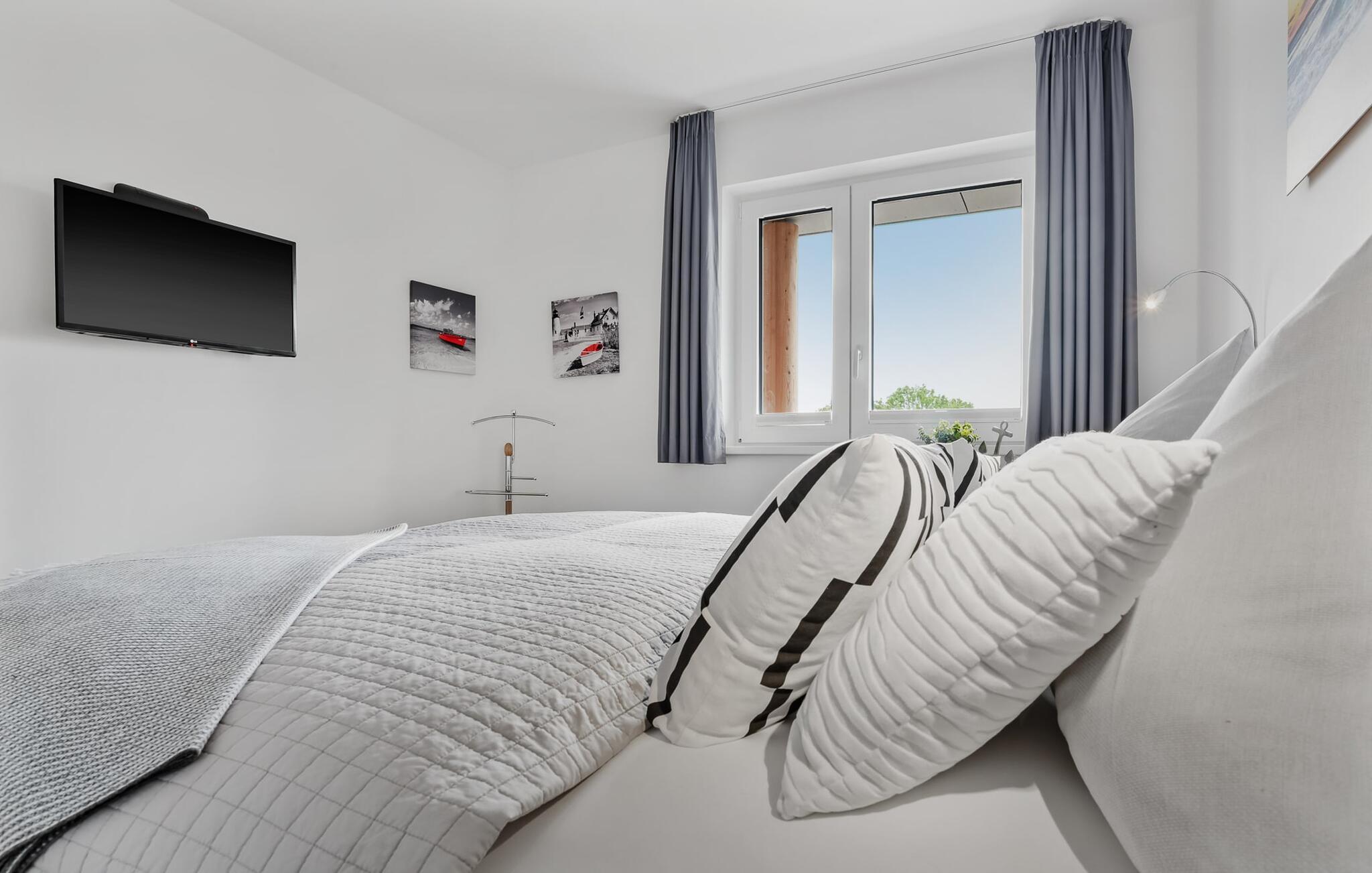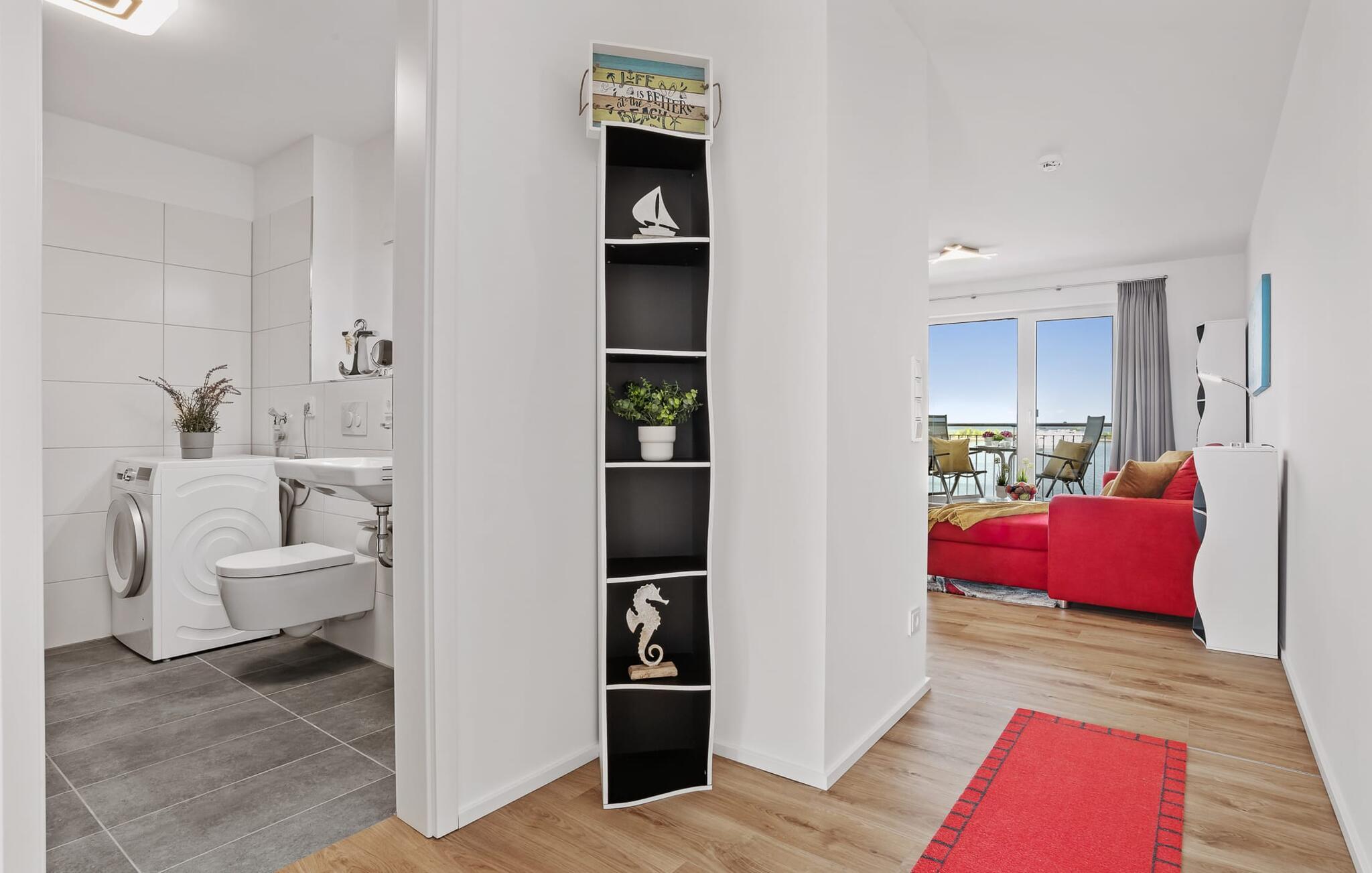 Mens I laver mad, spiser, læser avis eller bare hygger jer i det kombinerede, åbne køkken-alrum-alrum, følger udsigten over det brede vand jer konstant. I kan se gennem gulv til loft-vinduerne ud over altanen til sejlsportsbådshavnen, de flydende huse, østersøfjorden Slien og Slimünde fyrtårn. Et fænomenalt syn, der hele tiden er i bevægelse. I behøver faktisk slet ikke et tv, men NEPTUN tilbyder jer to: en i stue/spisestue og en i soveværelset. Der er også en lille samling af bøger og spil, så alle dage med dårligt vejr ikke ses negativt, men simpelthen er sjove. Og for musikelskere er der en internet-kompatibel Bluetooth-radio tilgængelig.
