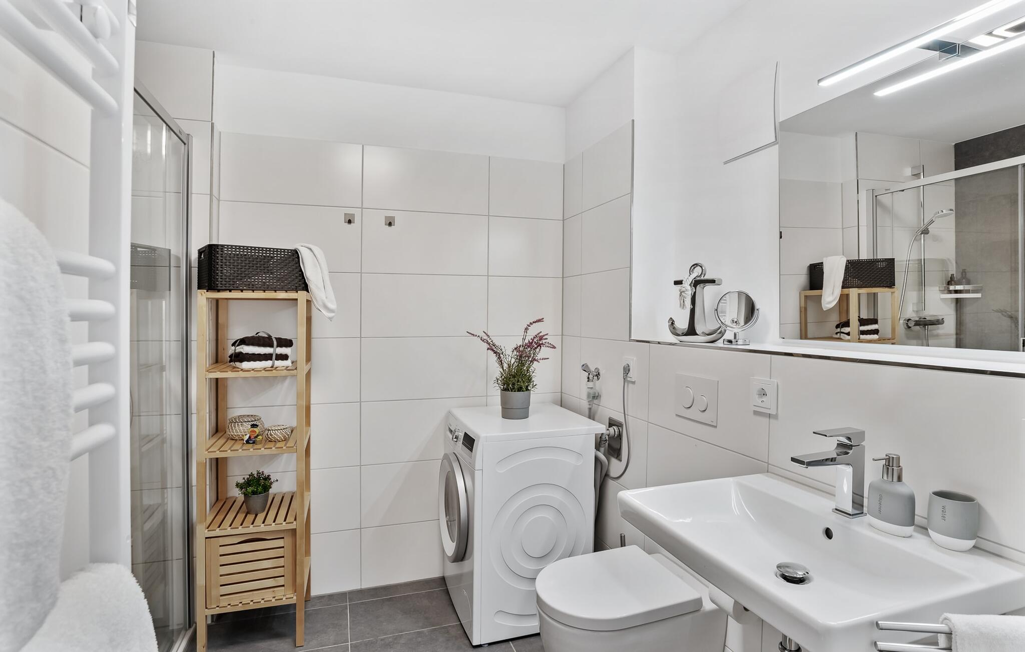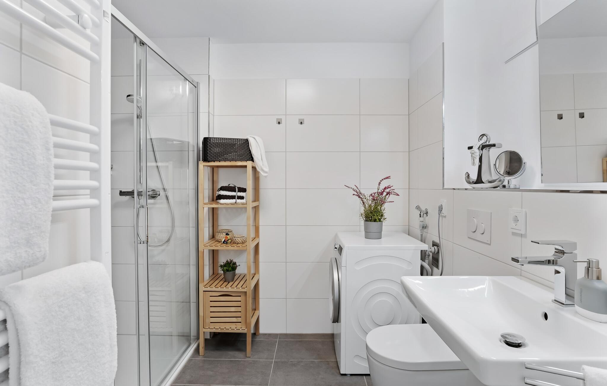 Badeværelset med bruser på gulvniveau kan nemt rumme tre personer.
