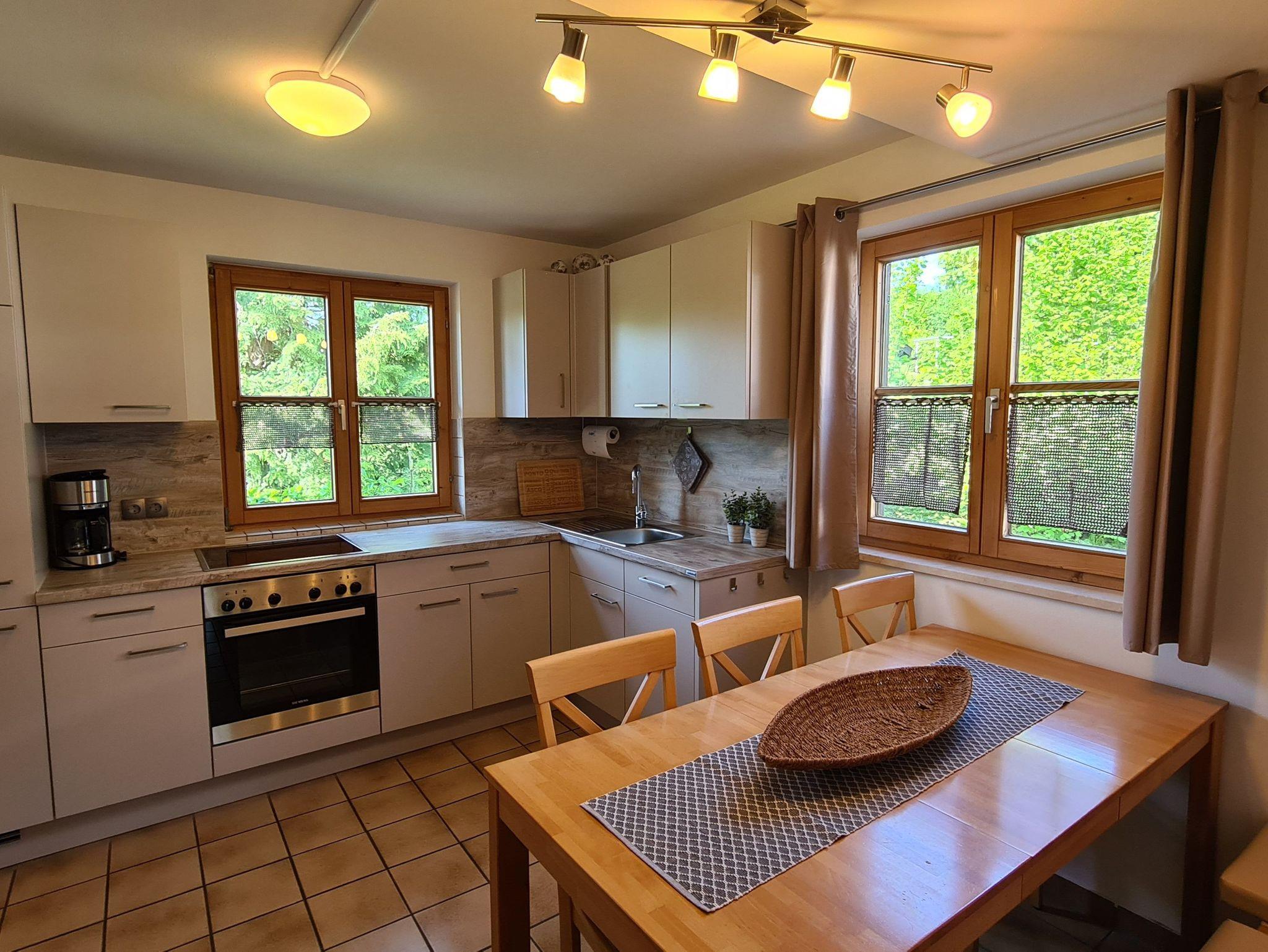 Die Küche ist umfangreich ausgestattet mit Kaffeemaschine, Mikrowelle, Spülmaschine, Handmixer, Toaster, Wasser- und Eierkocher sowie ausreichend Koch- und Essgeschirr.