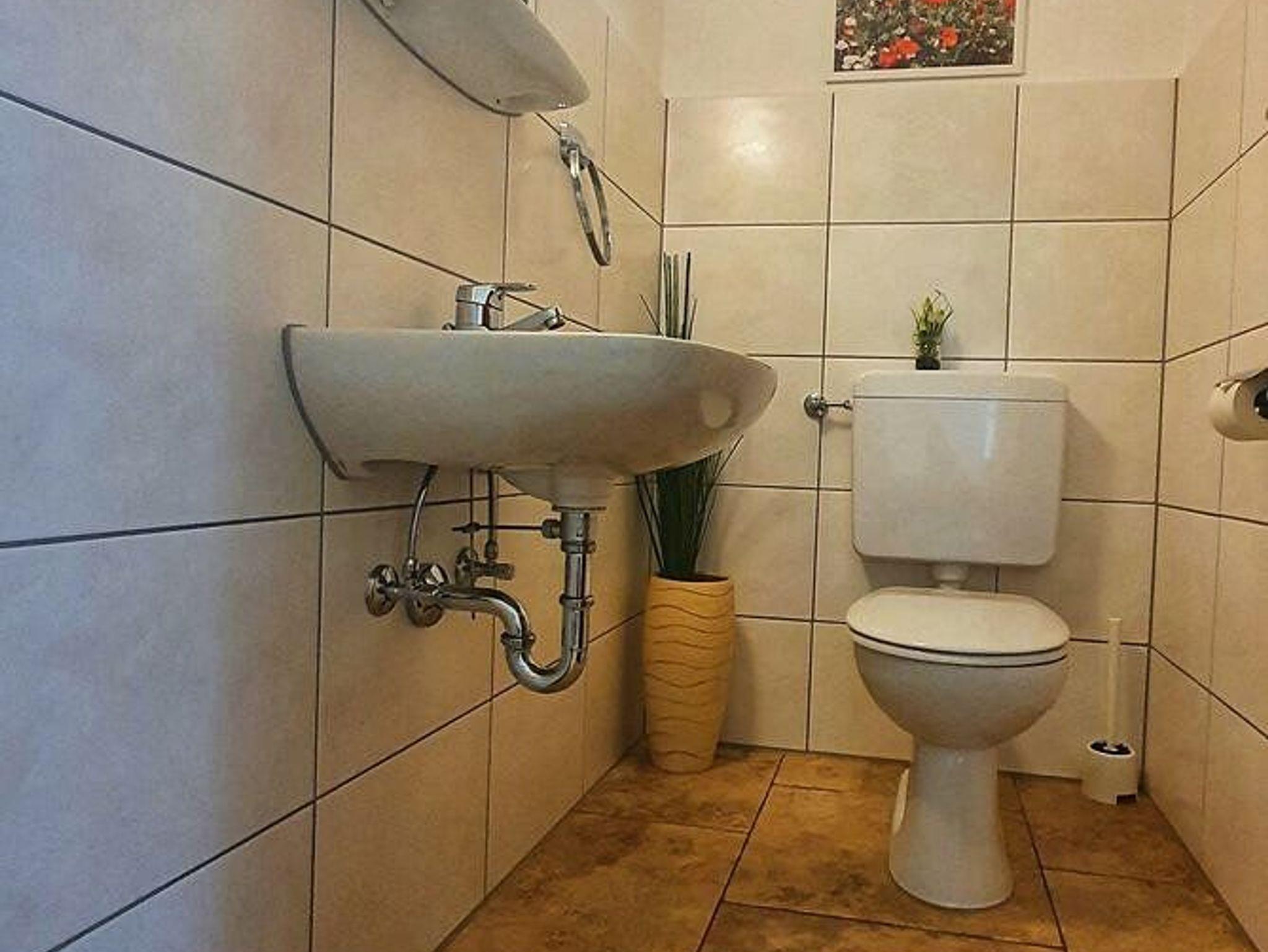 Das Badezimmer ist mit einer Dusche, einem Waschbecken, einem WC und einem Fön ausgestattet. Zusätzlich verfügt das Haus über ein separates WC mit einem Waschbecken.
