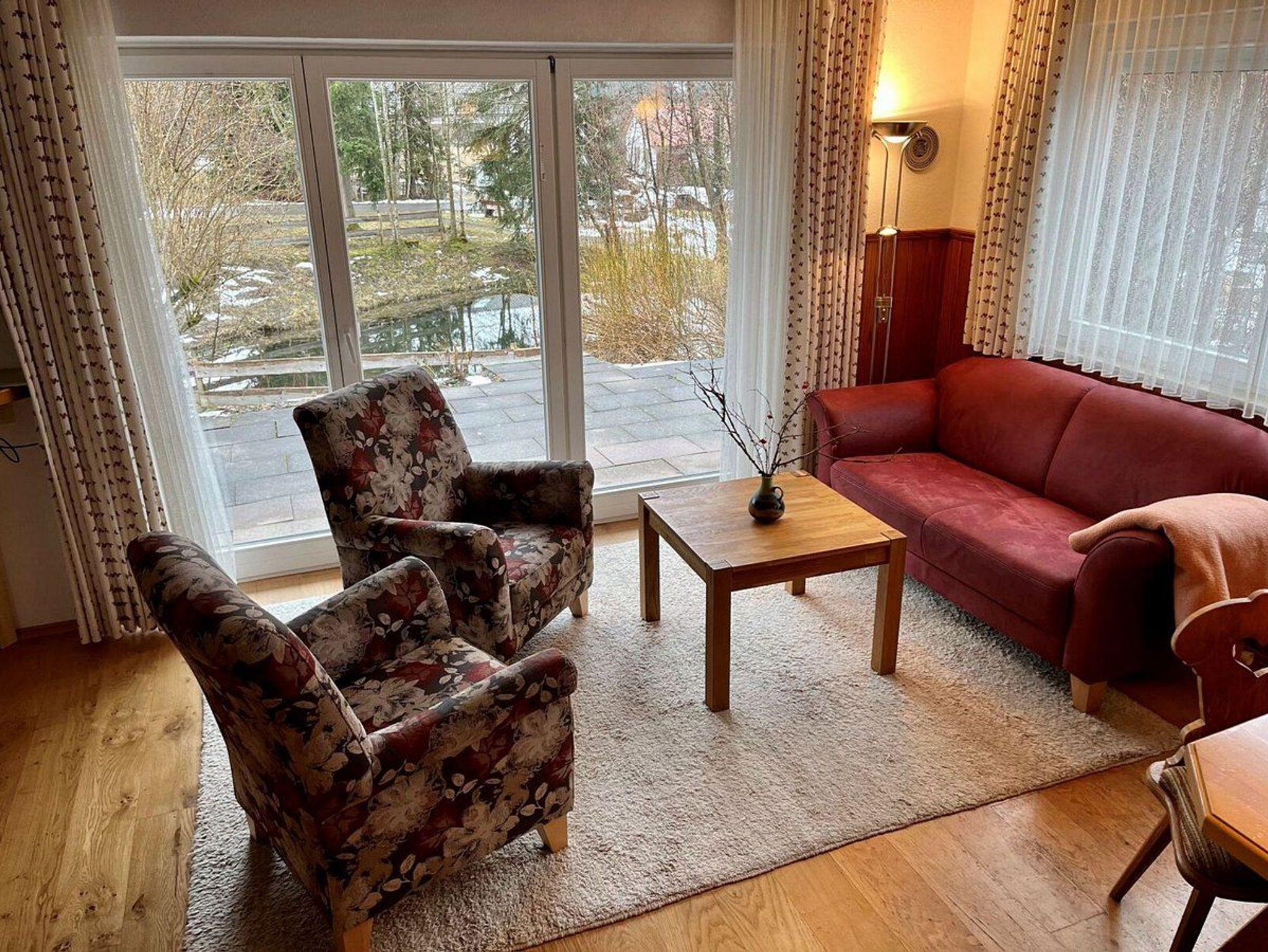 Das Ferienhaus befindet sich auf einem 1000 m² großen Grundstück mit einer sonnigen Terrasse mit Blick auf die Berge und das anliegende hölzern umfriedete Biotop, in dem Goldfische, Seerosen und Libellen leben.