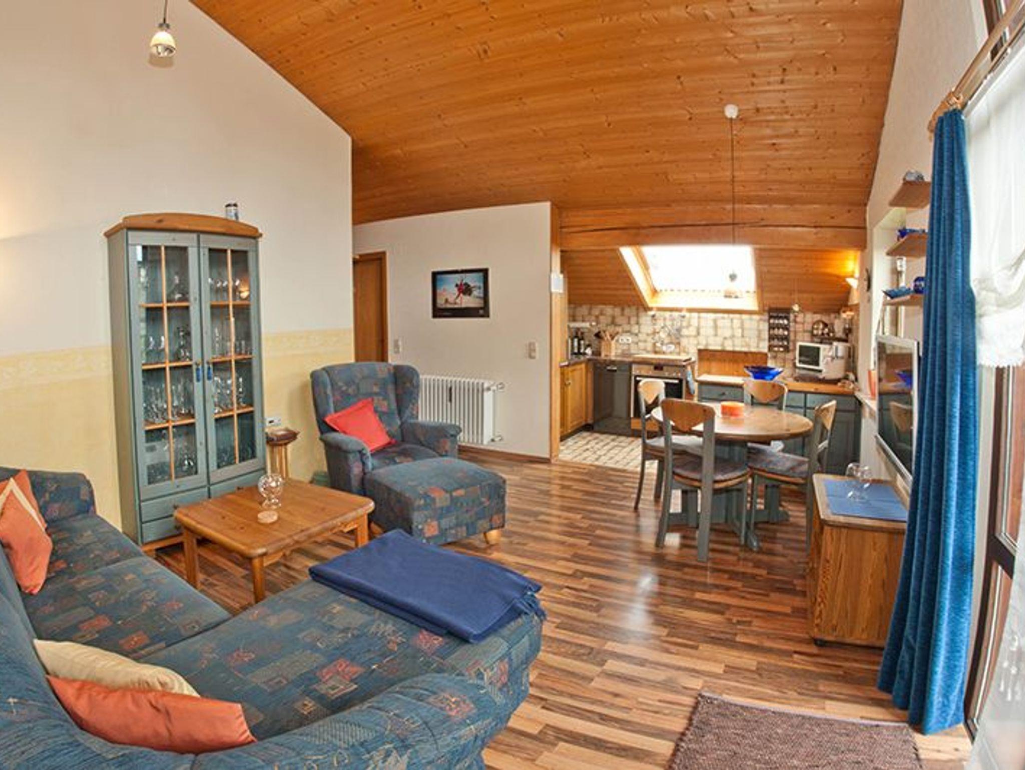 Gemütliche und voll ausgestatte Dachwohnung mit einem Schlafzimmer mit Doppelbett, einem Wohnzimmer mit Schlafsofa für eine dritte Person. Neben der gut ausgestatteten Küche biete dieses Apartment einen überdachten Balkon, außerdem WLAN und ein TV-Gerät.