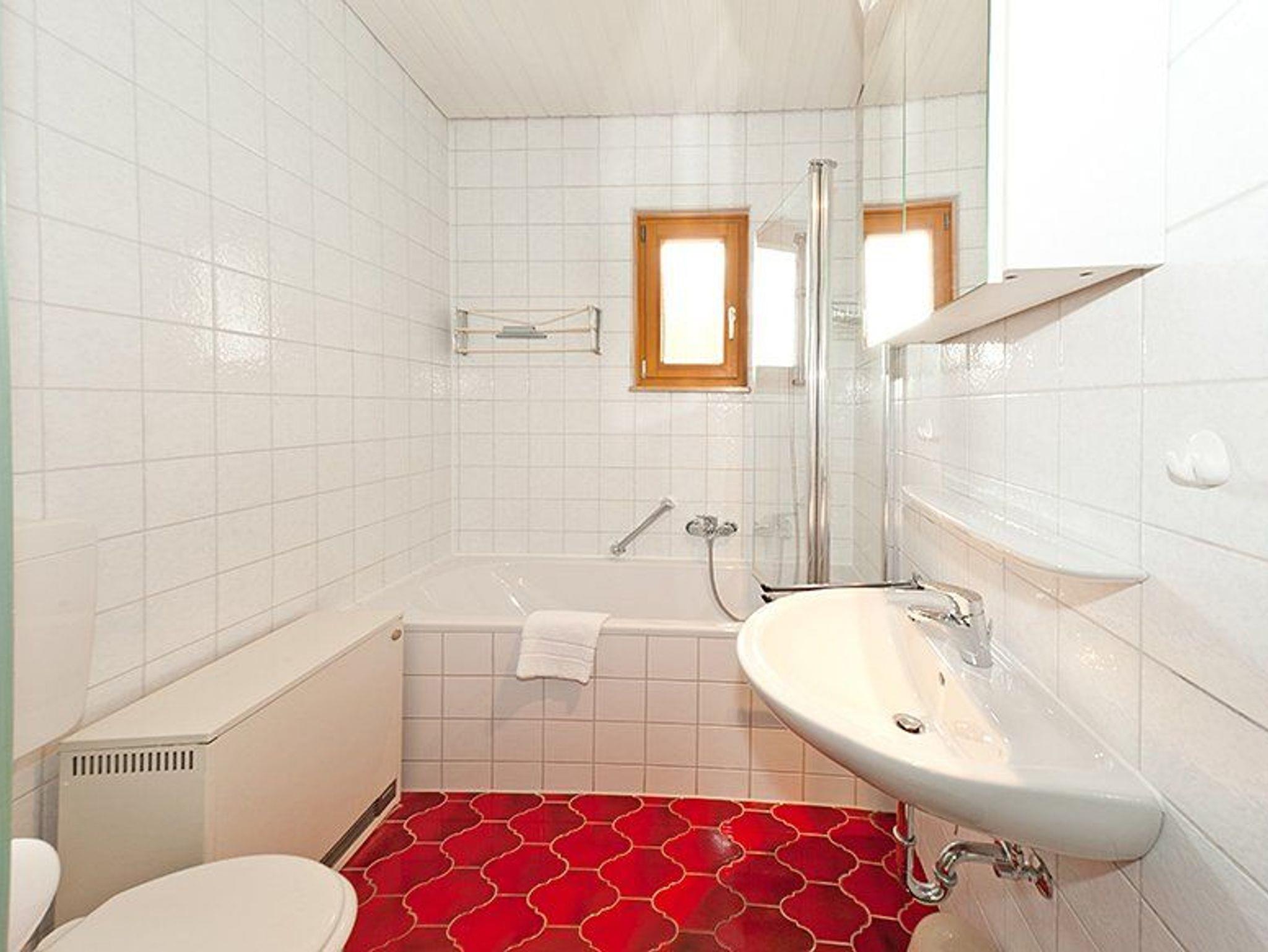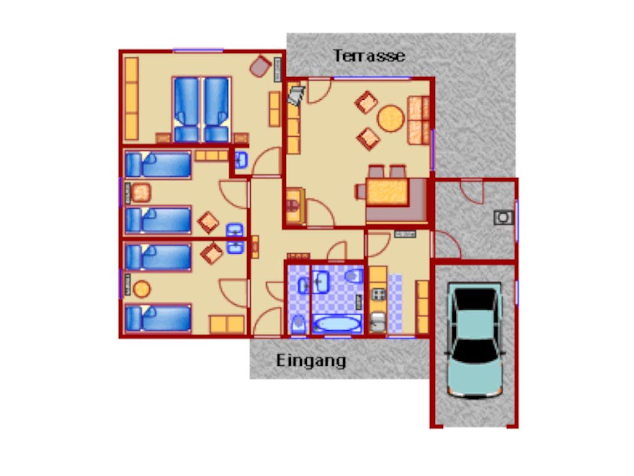 Im Inneren verfügt das Haus über ein Wohnzimmer mit Kachelofen und Essecke, drei Schlafzimmer mit jeweils eigenem Waschbecken, eine moderne Einbauküche mit Spülmaschine und Mikrowelle sowie ein Badezimmer und ein Gäste-WC. Zur weiteren Ausstattung gehören eine Waschmaschine, ein Fernseher, ein Radio und ein Kinderbett. Eine Garage befindet sich direkt am Haus.