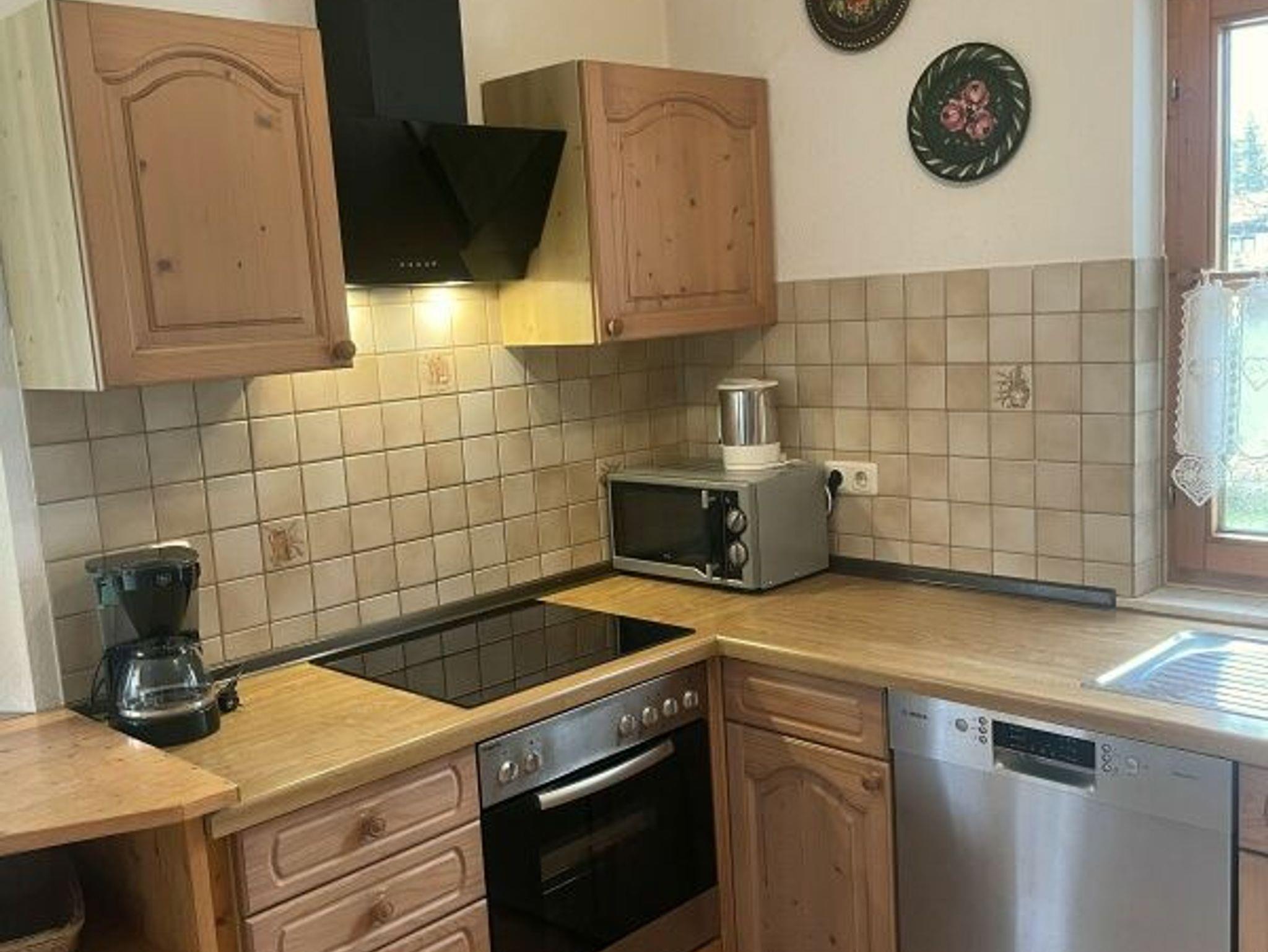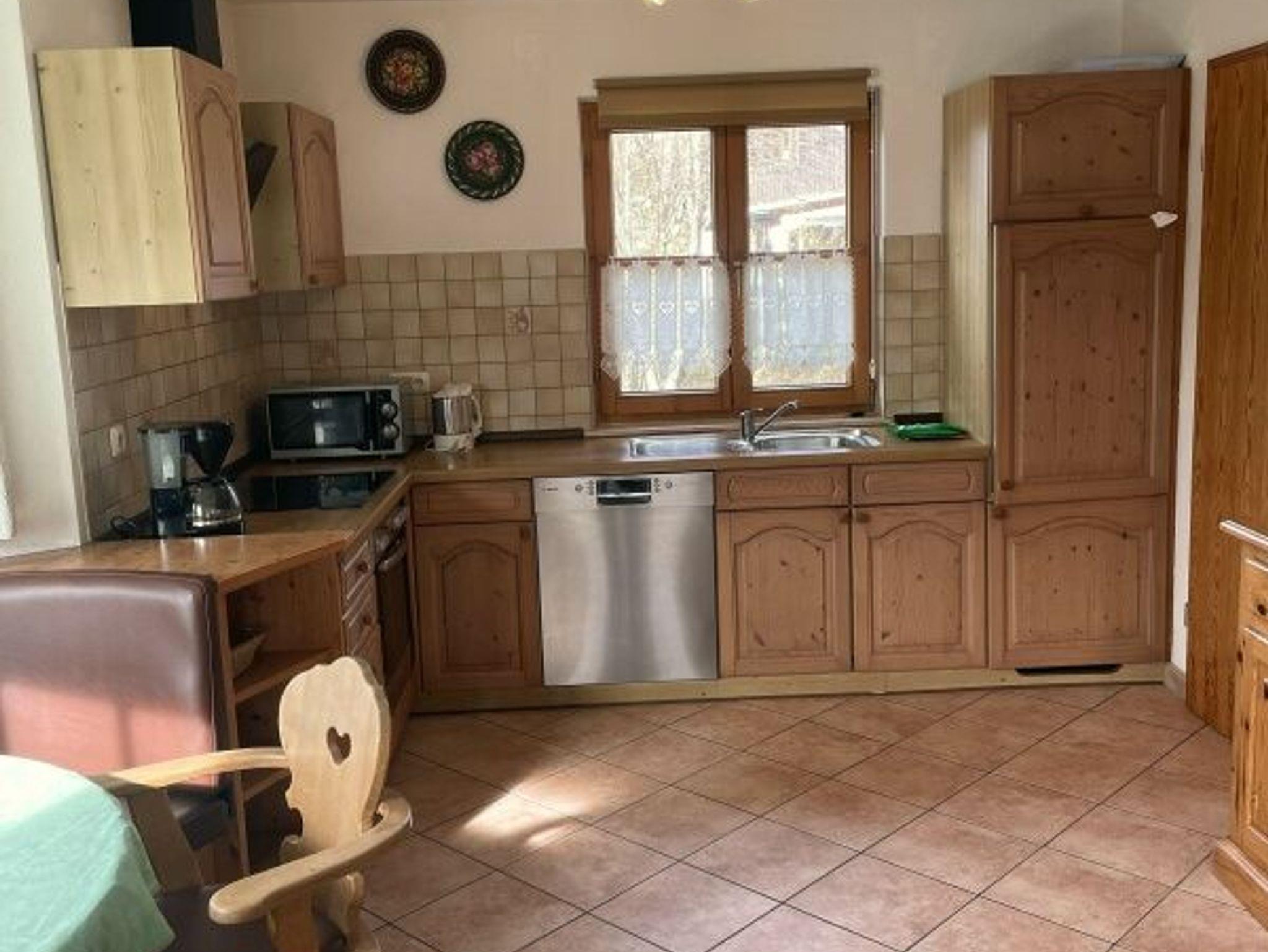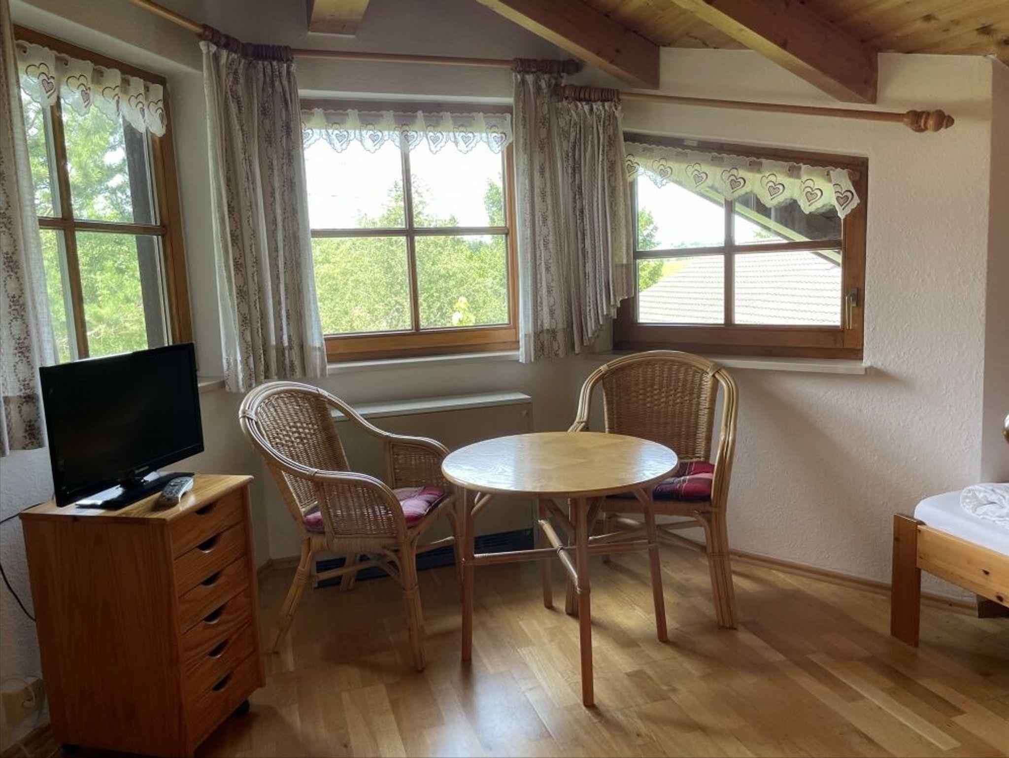 Das Ferienhaus erstreckt sich über drei Etagen und verfügt über eine umfangreiche Ausstattung. Im Erdgeschoss befinden sich eine gut ausgestattete Küche mit Spülmaschine, Mikrowelle, Cerankochfeld, Backofen und Kaffeemaschine sowie ein großzügiger Wohn- und Essbereich. Ein separates WC liegt im Eingangsbereich. Die Essecke ist in einem sonnigen Erker mit fest eingebauter runder Eckbank untergebracht. Das Wohnzimmer ist mit einer Ledersitzgarnitur über Eck und einem LED-Fernseher ausgestattet. Kabelfernsehen, Stereoanlage und eine nach Süden ausgerichtete Terrasse mit Gartenmöbeln sind ebenfalls vorhanden. Von dort besteht freier Blick auf die Allgäuer Berge wie Alpspitze, Buron, Reuter Wanne und Grünten. Die Beheizung erfolgt über Nachtspeicheröfen.