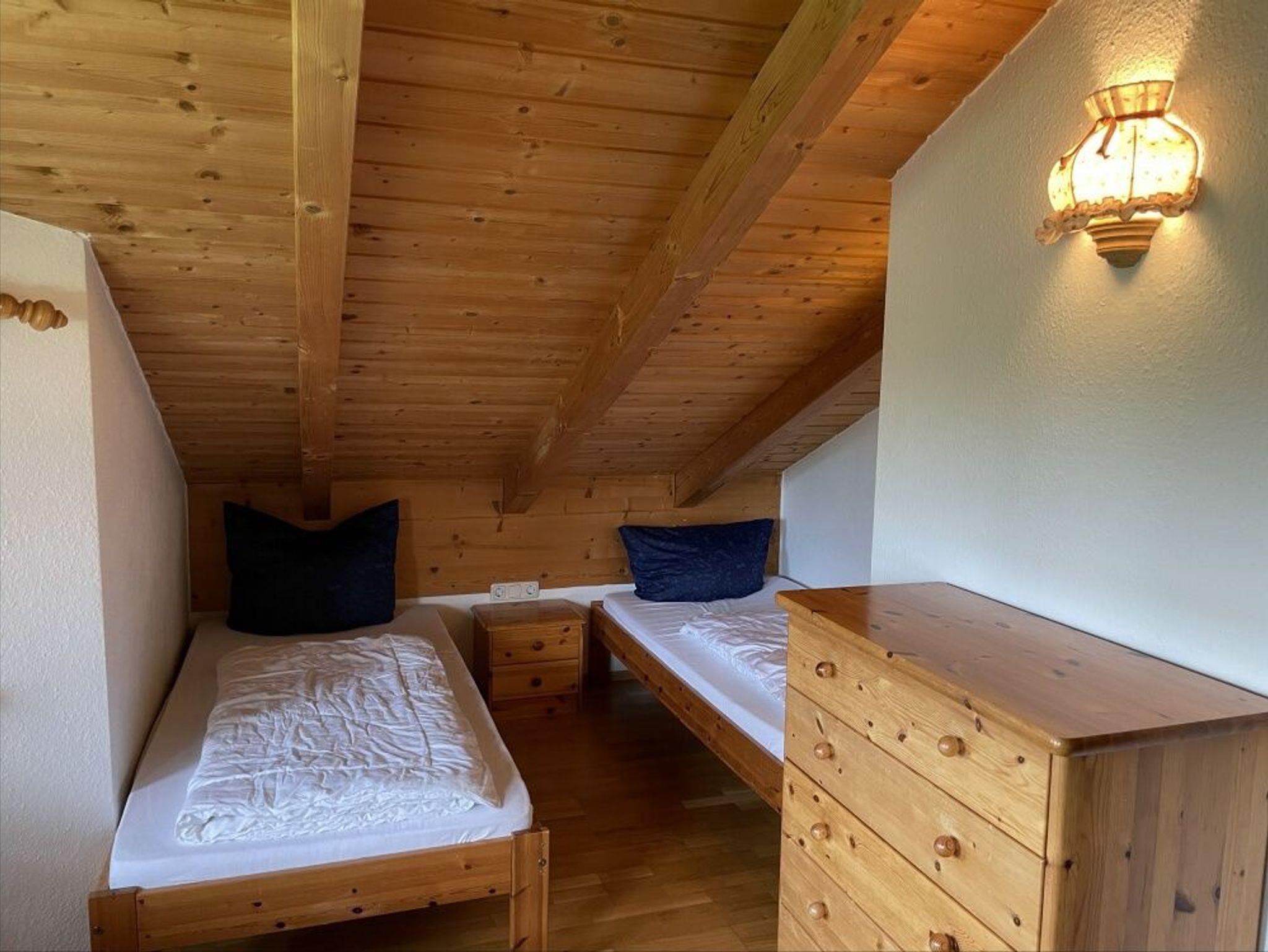 Im Obergeschoss mit offenem Dachausbau bis zum First befinden sich zwei Schlafzimmer sowie ein neu renoviertes Badezimmer mit Dusche und WC. Das größere Schlafzimmer ist mit einem Doppelbett und einer Sitzgarnitur ausgestattet, das zweite mit zwei Einzelbetten und einer Sitzgelegenheit im Erker. In beiden Zimmern sind Fernseher und Radios vorhanden. Ein Kinderbett kann bei Bedarf zugestellt werden.