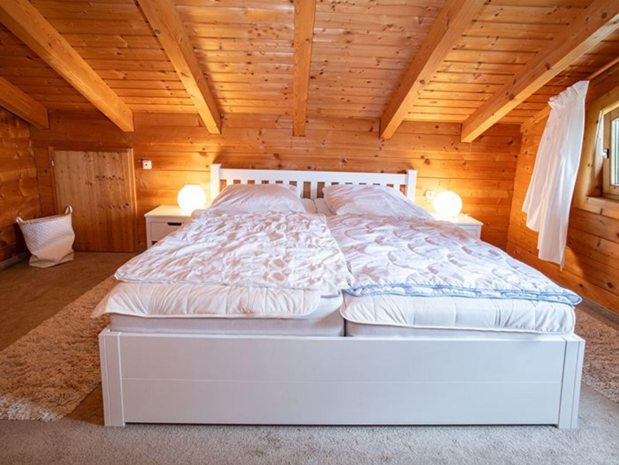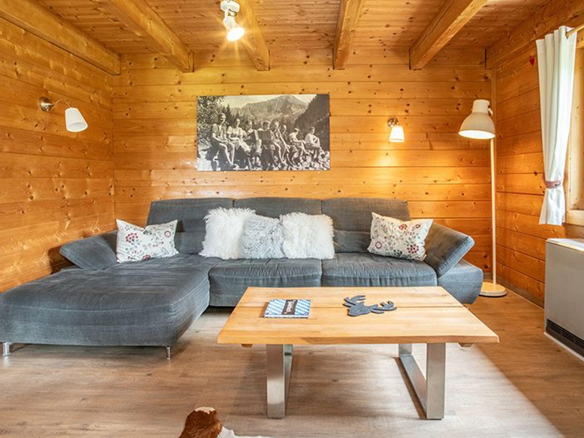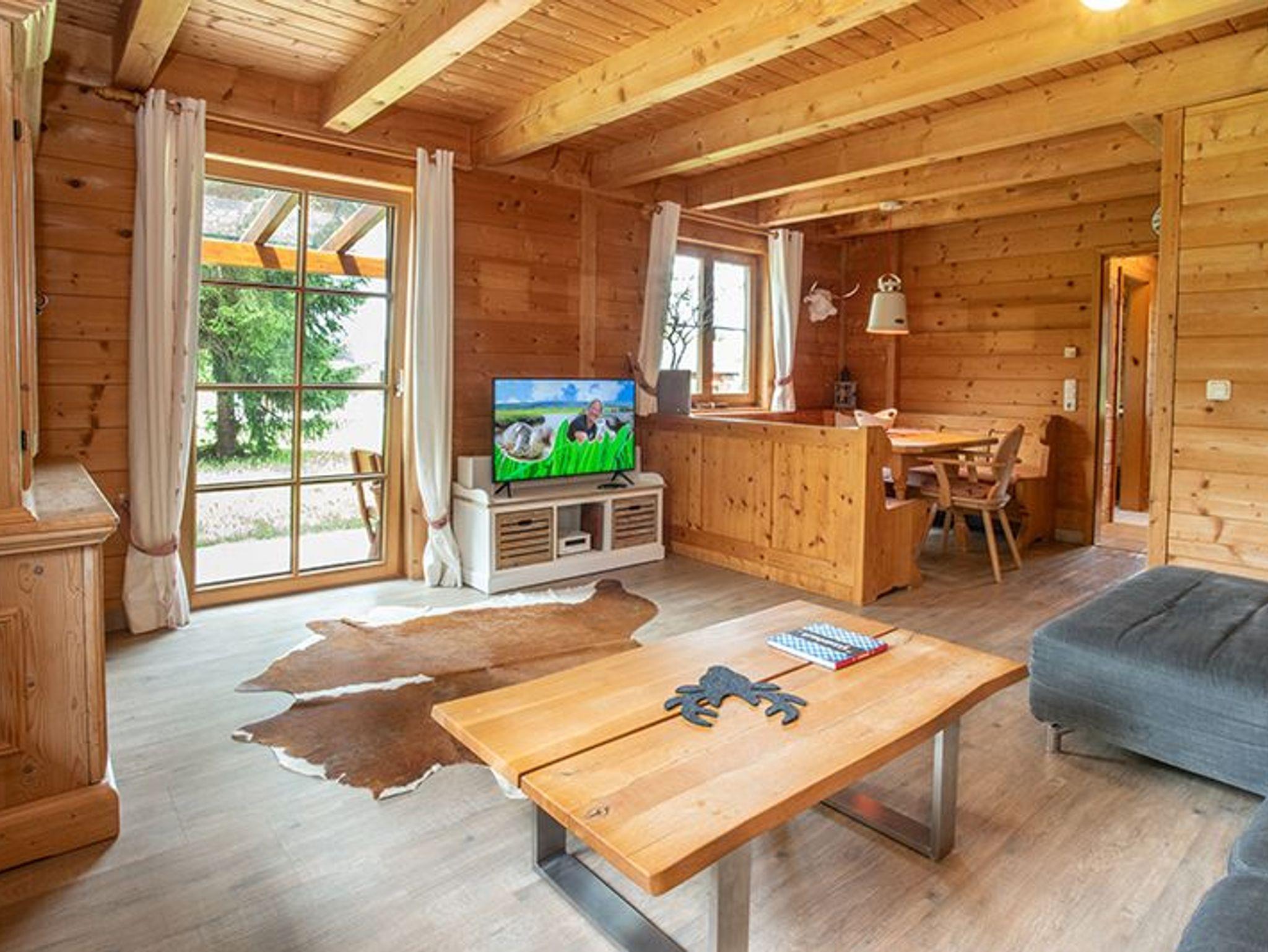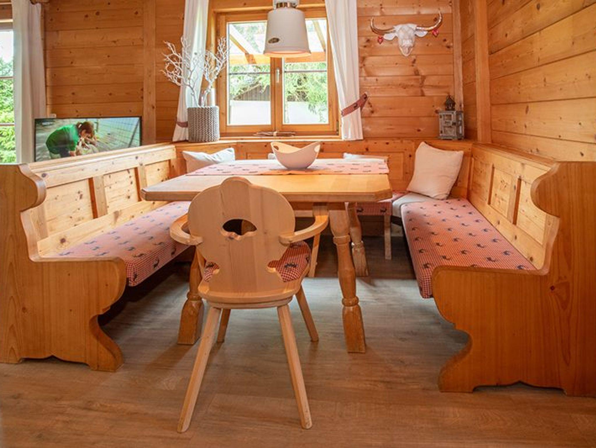 Das gemütliche Holzhaus bietet eine warme, einladende Atmosphäre mit viel Liebe zum Detail. Der offene Wohn- und Essbereich ist hell und freundlich gestaltet, mit großen Fenstern, die den Blick ins Grüne freigeben. Eine massive Eckbank mit Holztisch und bequemen Stühlen bildet den Mittelpunkt des Essbereichs. Der Wohnbereich ist mit einem großen Sofa, einem stilvollen Couchtisch und einem modernen Flachbildfernseher ausgestattet.