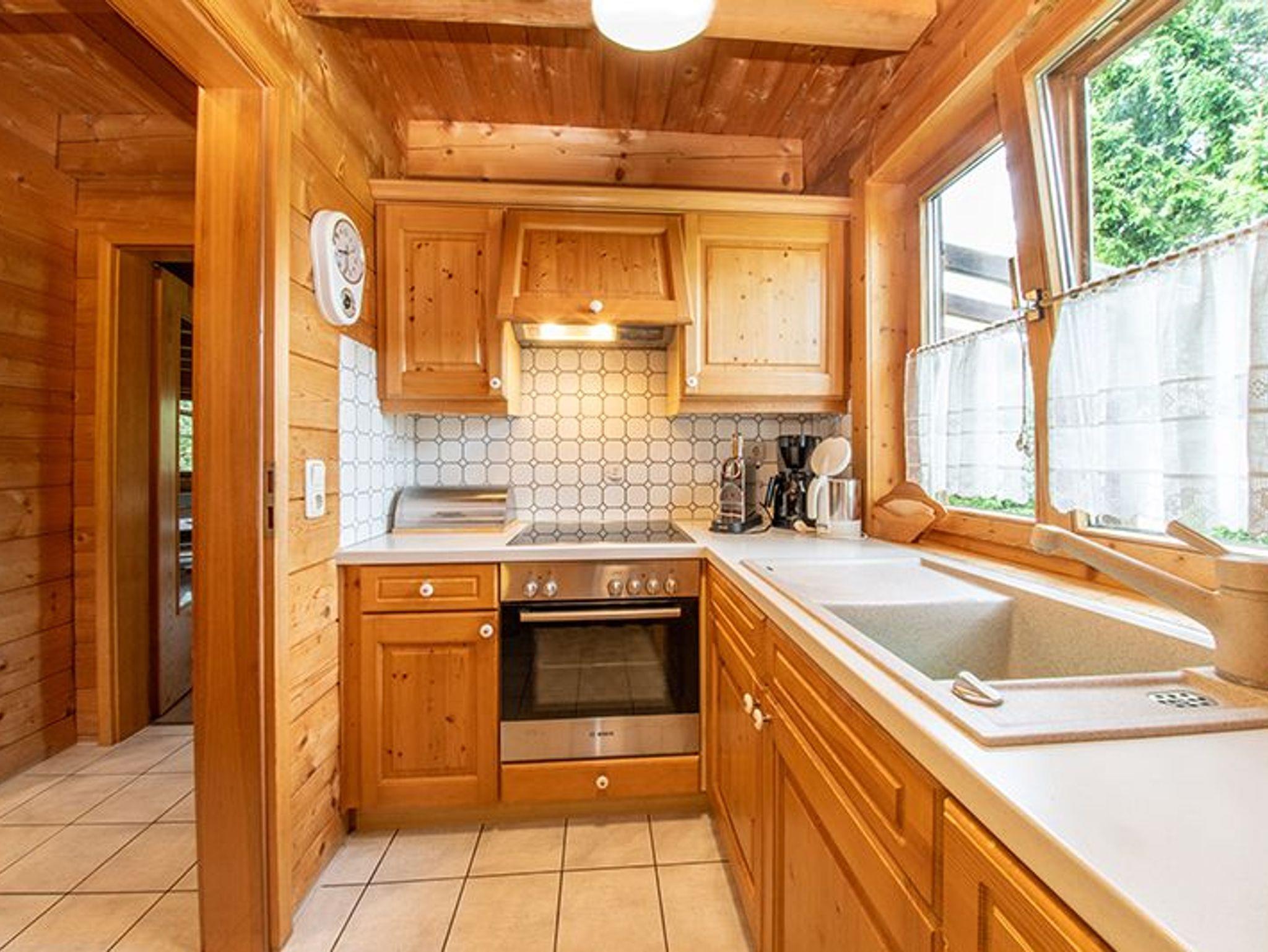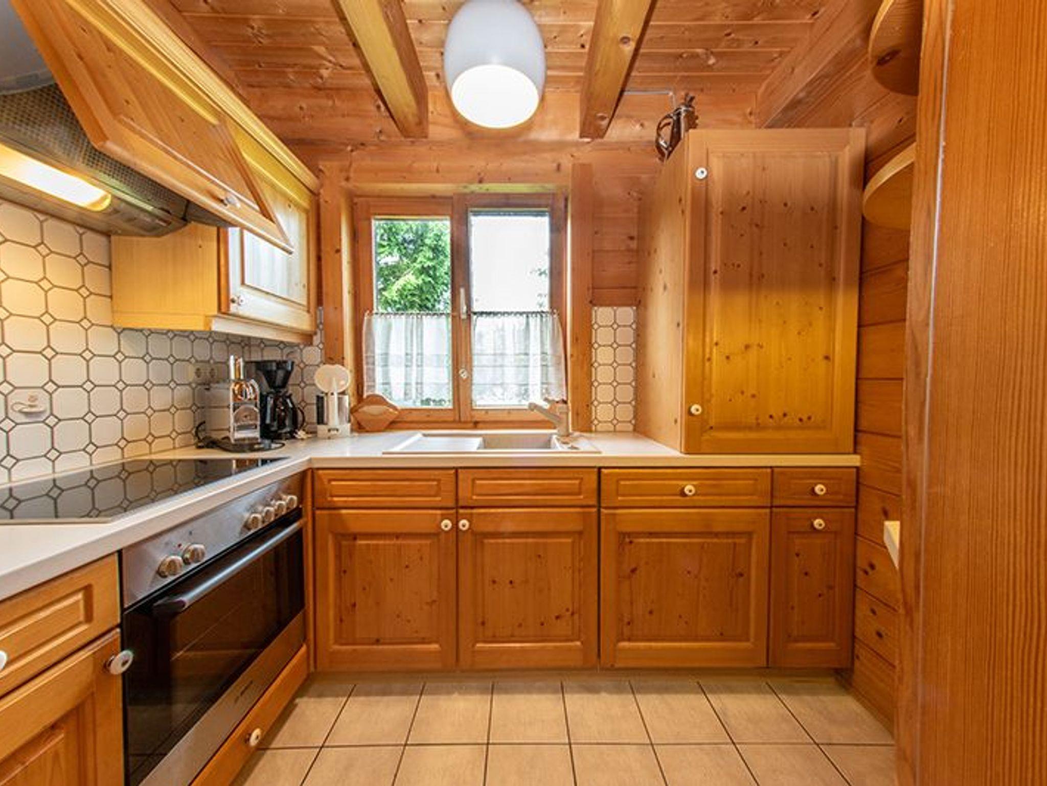 Die Küche fügt sich harmonisch in das Gesamtbild ein und kombiniert traditionelle Holzelemente mit moderner Ausstattung. Sie verfügt über einen Backofen mit Ceranfeld, eine Spüle mit großzügiger Arbeitsfläche sowie eine Kaffeemaschine und weitere praktische Küchenhelfer.