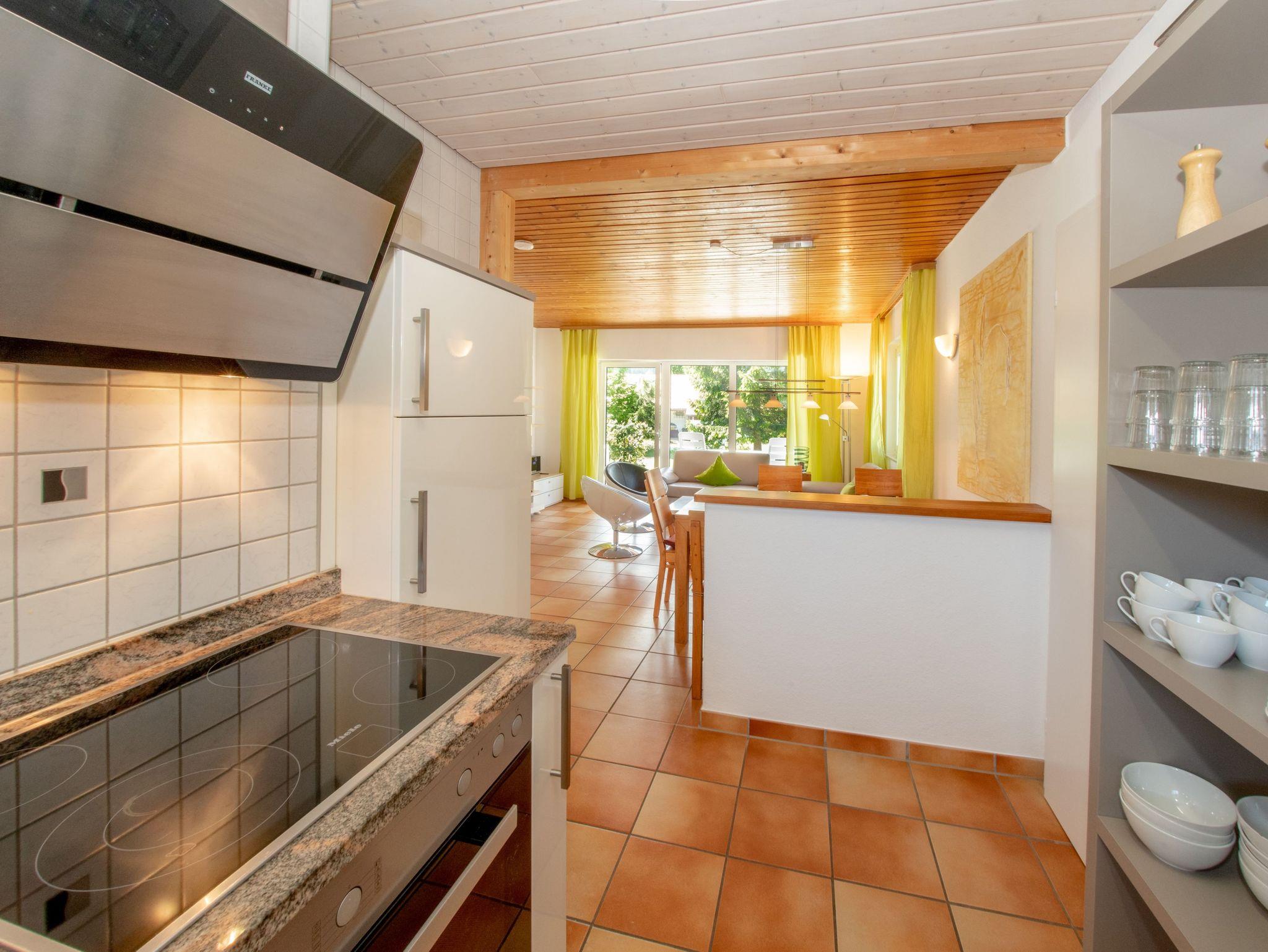 Angrenzend befindet sich eine gemütliche Essecke aus Kernbuche sowie eine moderne Küche mit Kühlschrank, Herd, Backofen und Geschirrspüler. Bad und Gäste-WC sind hell gefliest und zeitgemäß eingerichtet.