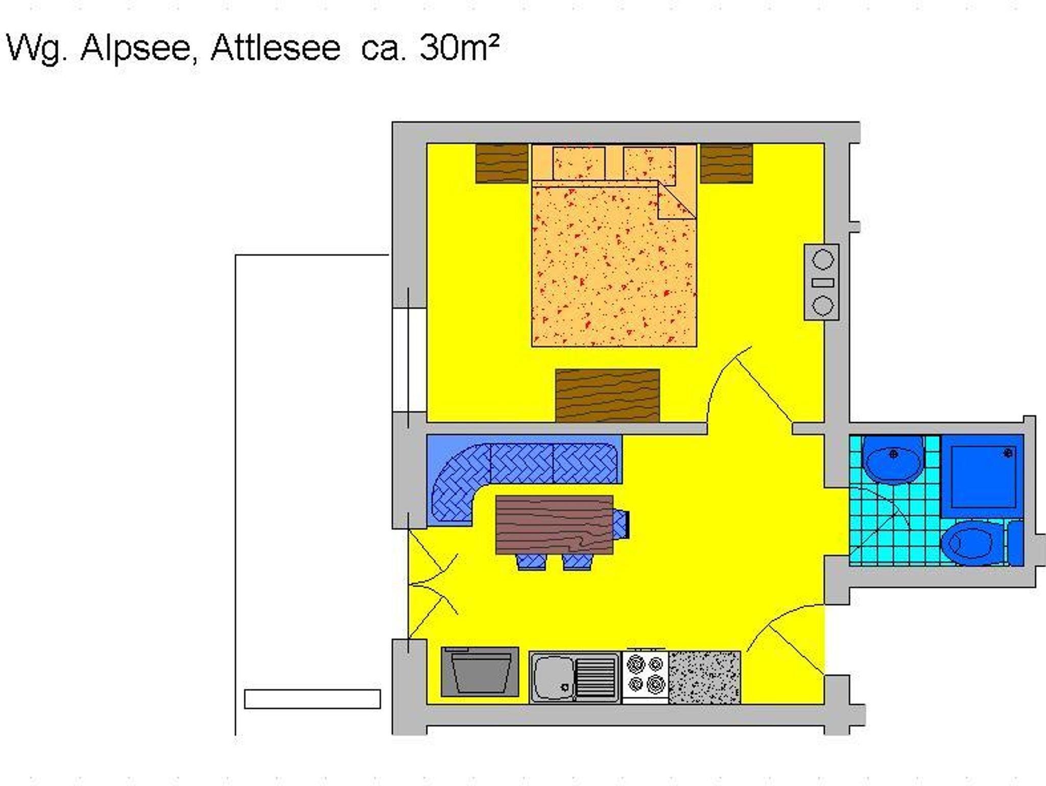Gemütliche 2-Zimmerferienwohnung Attlesee (30 qm) im 2. Stock mit Westbalkon (Blick zur Alpspitze und zum Grünten), 1 Doppelschlafzimmer, schöner Wohnküche (Backofen, Ceranfeld, Kaffeemaschine, Mikrowelle, Spülmaschine, Toaster, Wasserkocher), Sat-TV, Stereoanlage und Radiowecker sowie Badezimmer mit Dusche/WC und Haarfön.