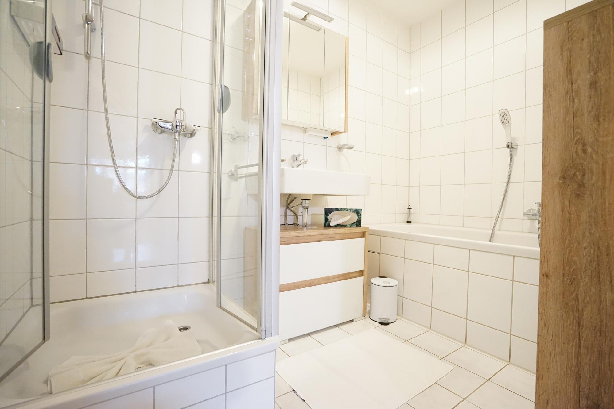 Badezimmer mit Badewanne und Dusche, helles Fliesendesign