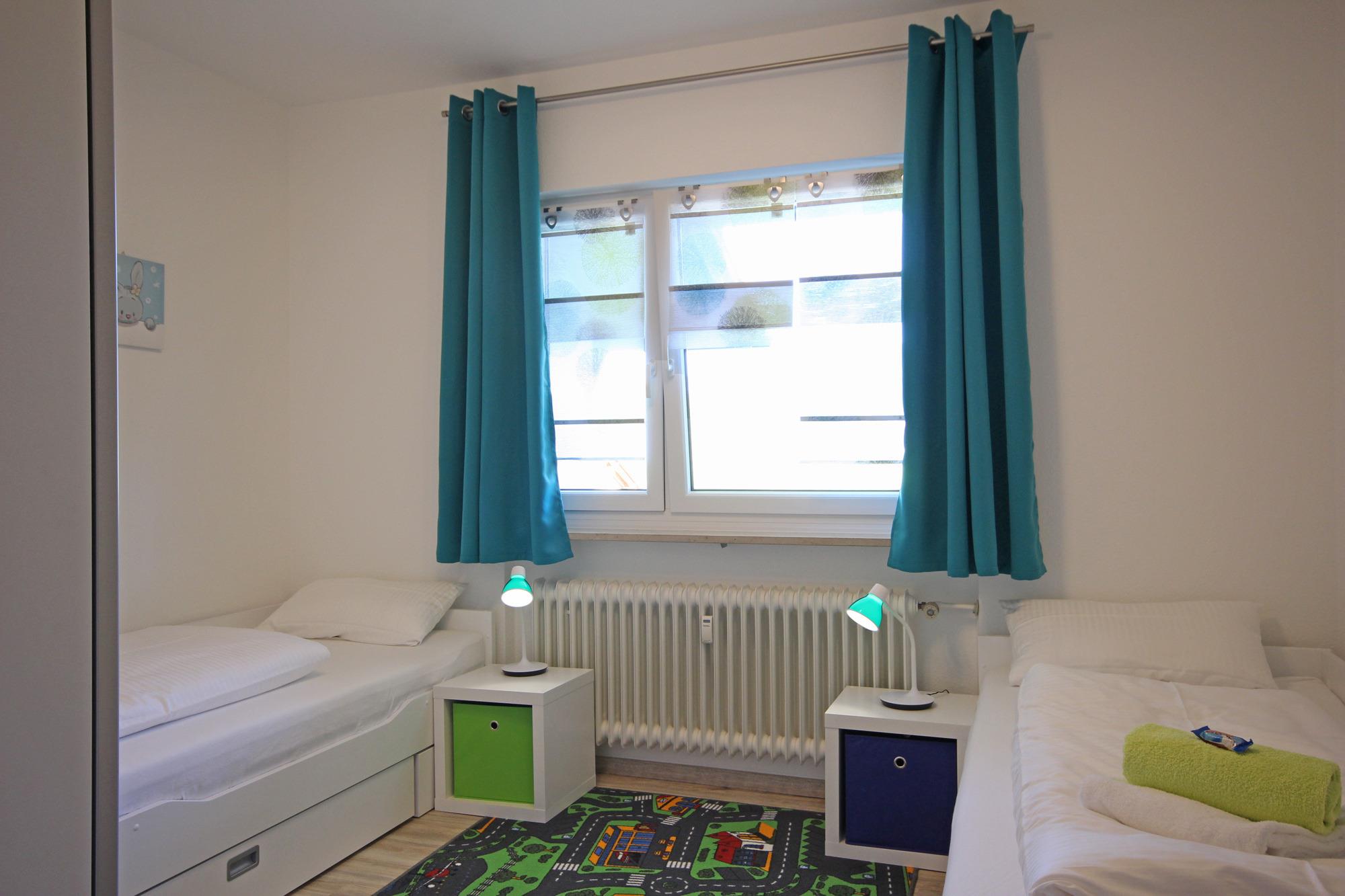 Kinderzimmer mit zwei Einzelbetten und Kleiderschrank, 1 Zustellbett (90x190, 3.Kind) auf Anfrage möglich