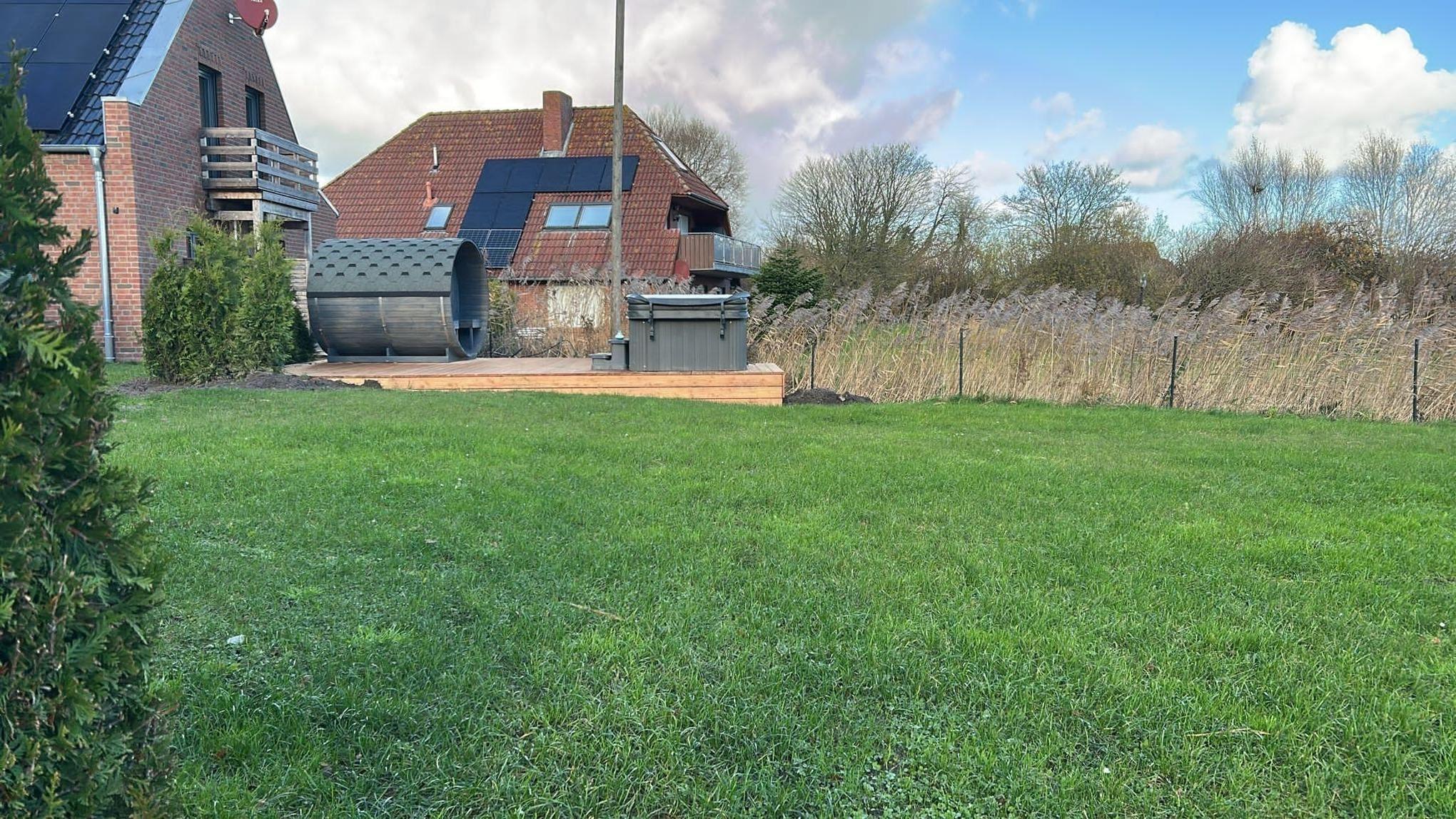 In dem großen Garten, den sich die beiden Haushälften teilen, befindet sich ein separates Saunahaus und ein Außen-Whirlpool. Hier lässt es sich herrlich entspannen und dabei in die Ferne schweifen. Vor allem auch in Herbst und Winter ist die wohlige Wärme nach einem ausgedehnten Küstenspaziergang einfach unglaublich wohltuend.