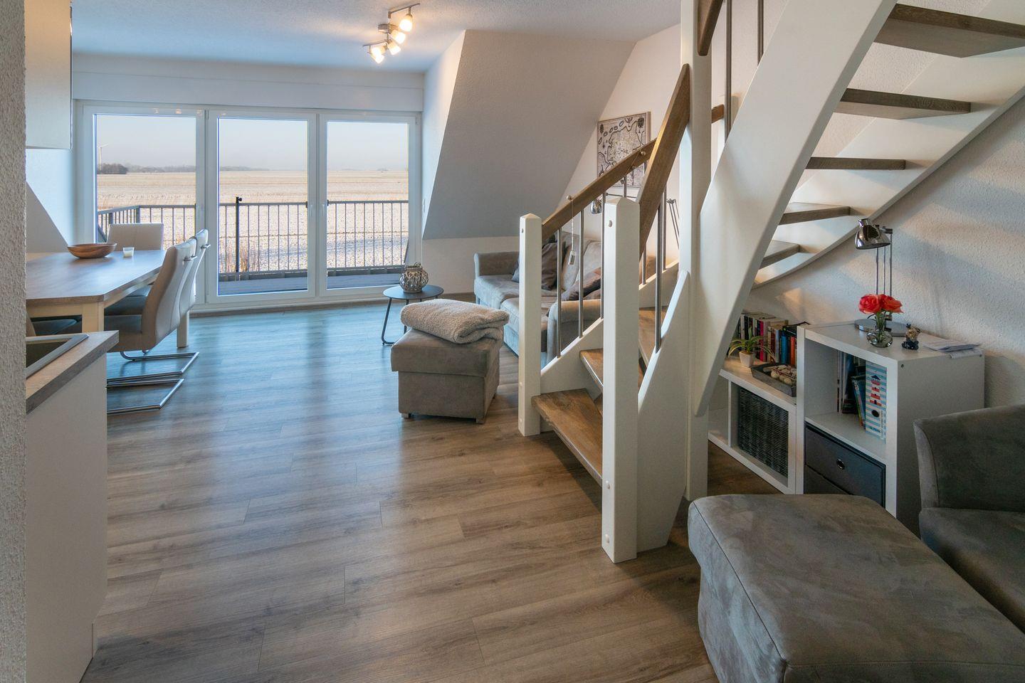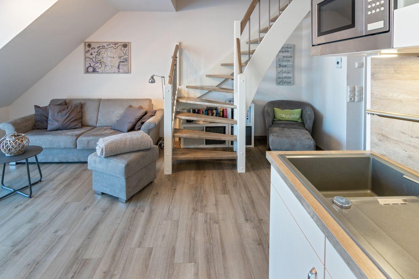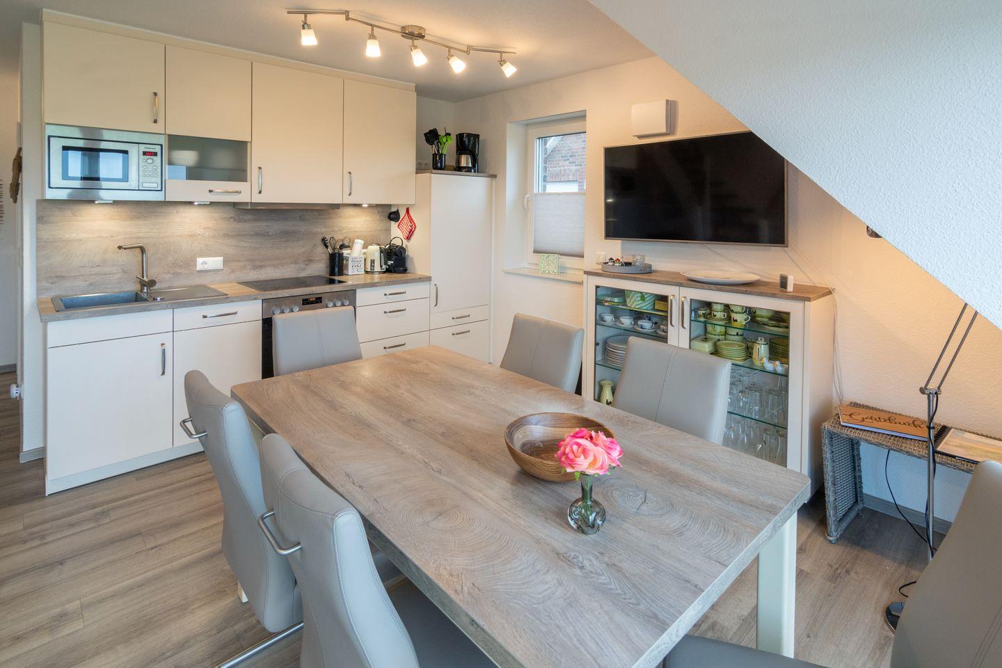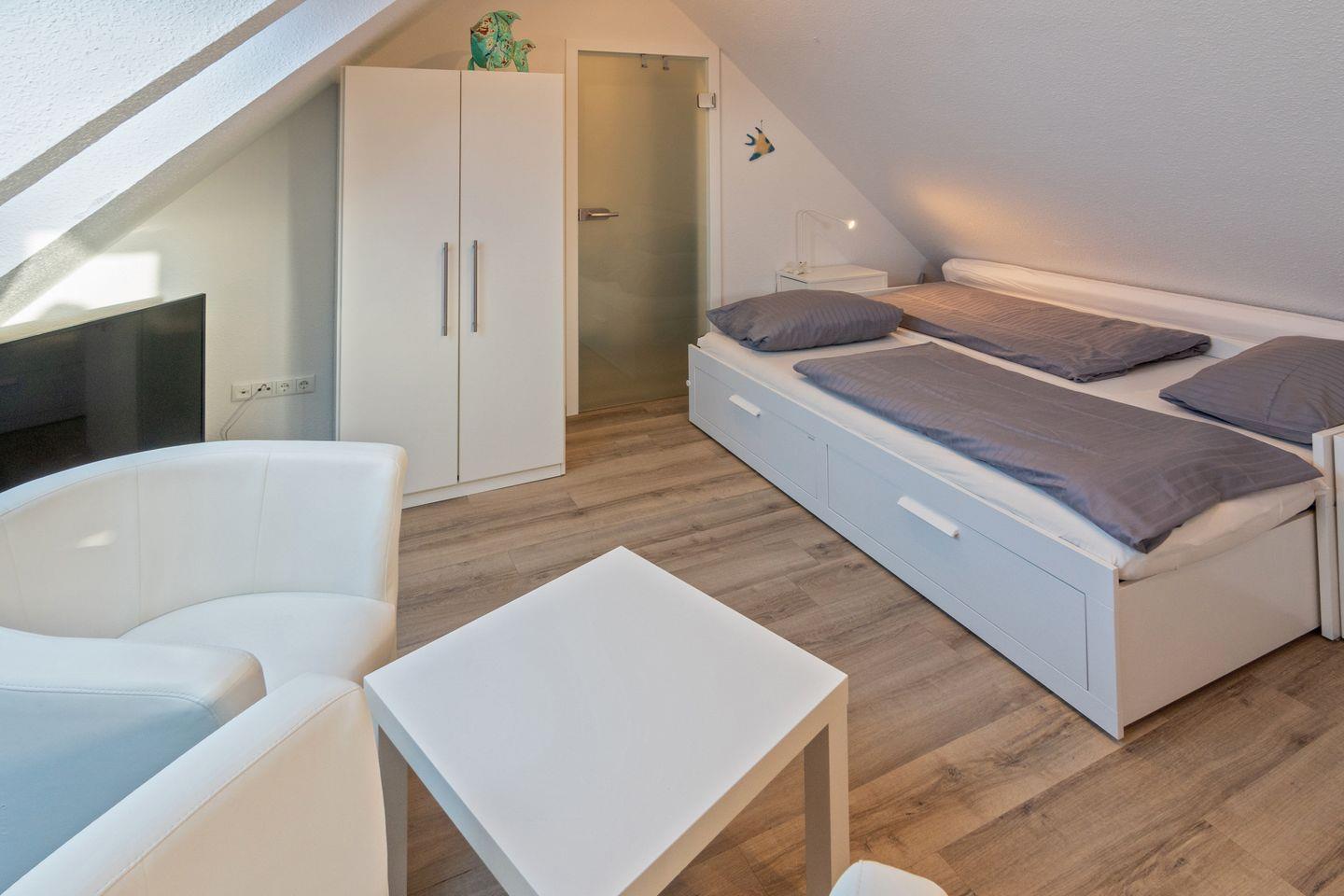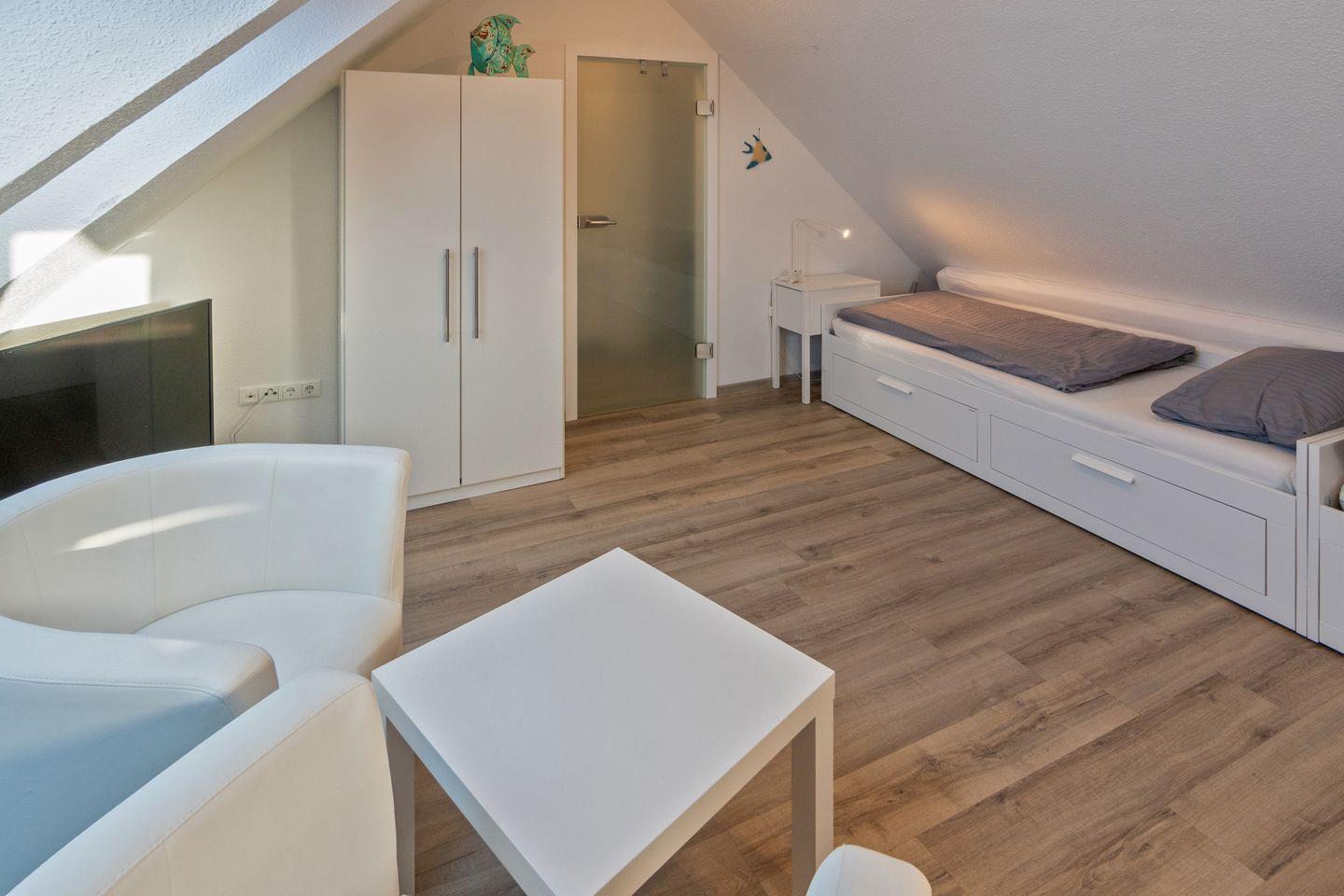 Die Wohnung verfügt über einen Wohn- und Essbereich mit voll ausgestatteter Küche, ein Schlafzimmer mit Ehebett und ein Duschbad mit WC. Über eine gut begehbare Treppe gelangen Sie zum zweiten Schlafzimmer mit zwei Einzelbetten (mit Bettschublade für eine weitere Person). Auf dem Süd-Balkon mit Gartenmöbeln können Sie sich entspannen. Waschmaschine und Trockner stehen Ihnen kostenlos zur Verfügung. In allen Wohn- und Schlafräumen sind Fernseher vorhanden. Babybett nicht stellbar in den Schlafräumen. Trotz Haustierverbots ist die Wohnung nicht für Allergiker geeignet. Der Wohnbereich ist mit elektrischen Rollo´s ausgestattet.