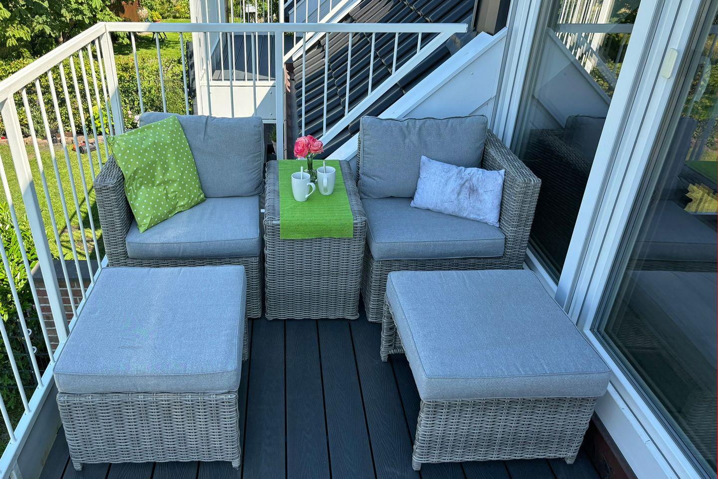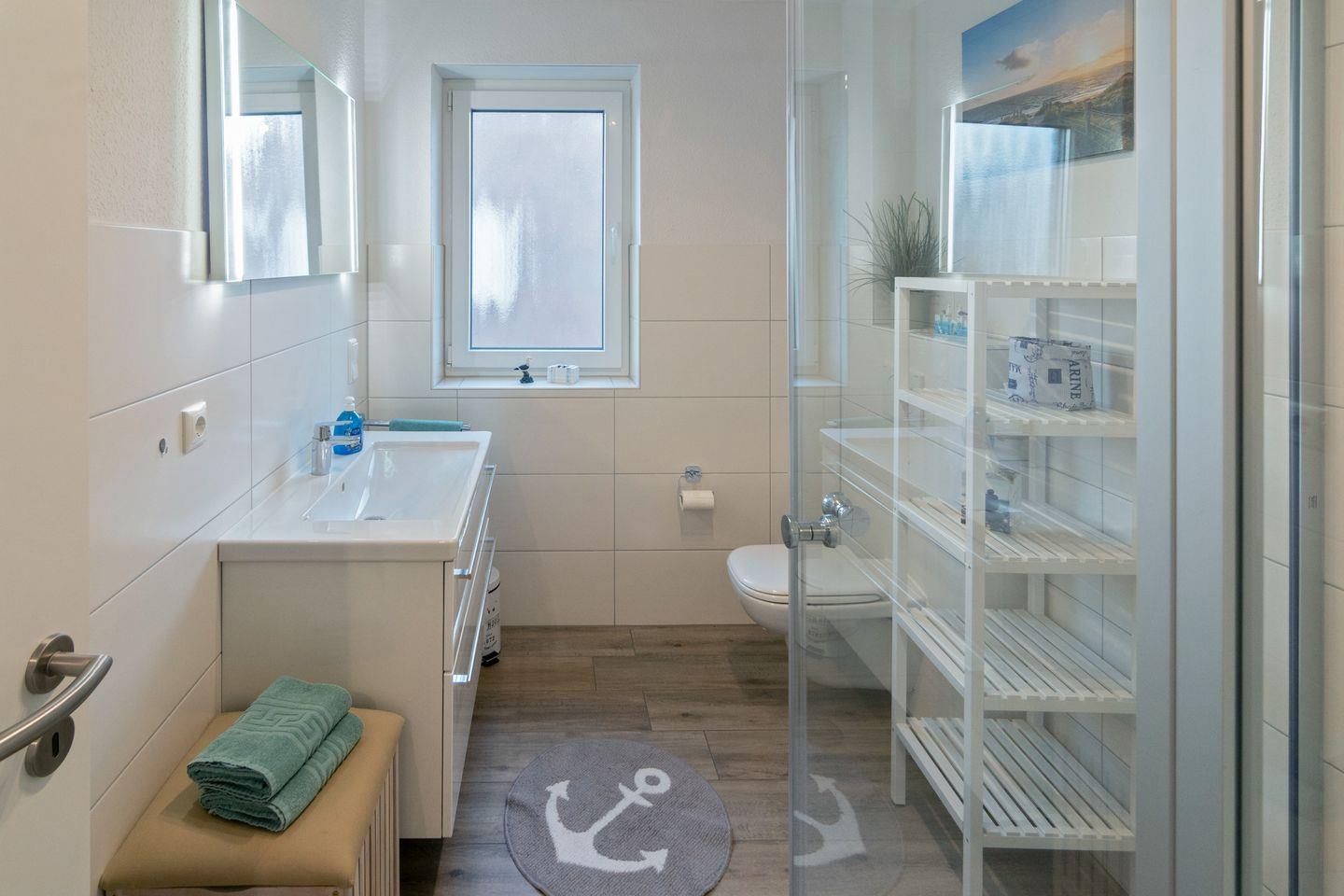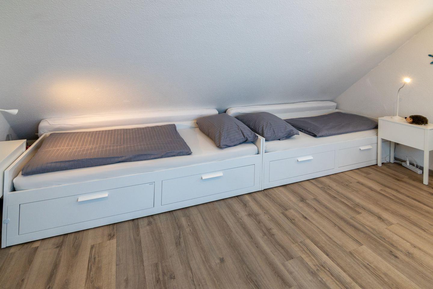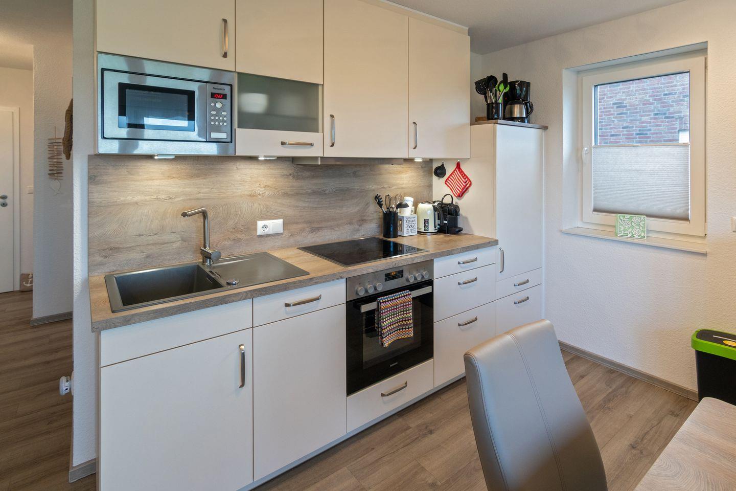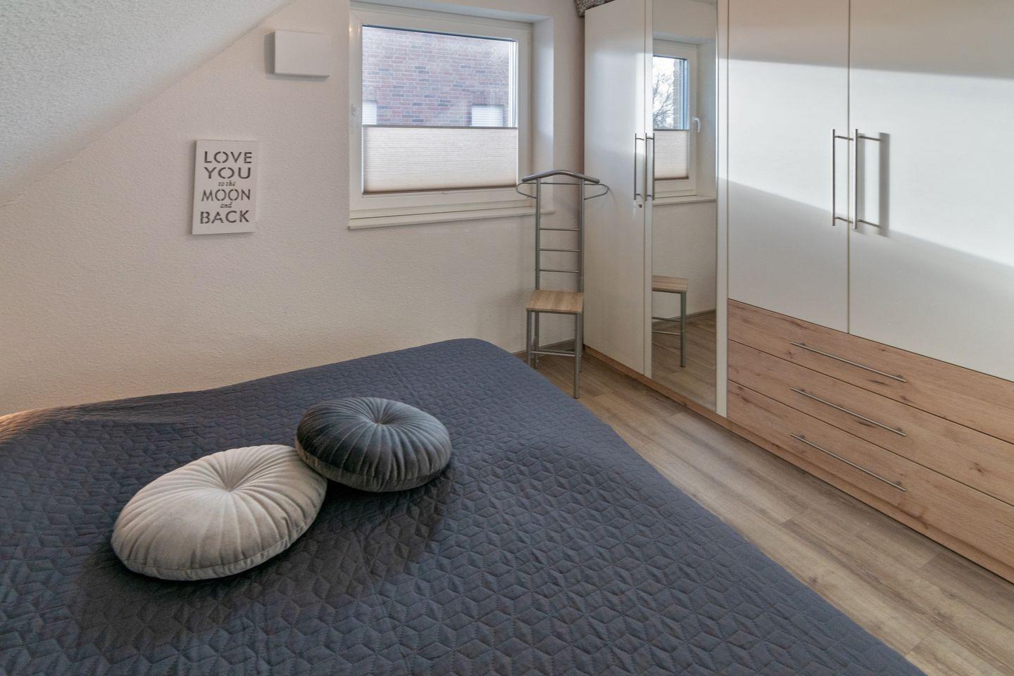Die Wohnung verfügt über einen Wohn- und Essbereich mit voll ausgestatteter Küche, ein Schlafzimmer mit Ehebett und ein Duschbad mit WC. Über eine gut begehbare Treppe gelangen Sie zum zweiten Schlafzimmer mit zwei Einzelbetten (mit Bettschublade für eine weitere Person). Auf dem Süd-Balkon mit Gartenmöbeln können Sie sich entspannen. Waschmaschine und Trockner stehen Ihnen kostenlos zur Verfügung. In allen Wohn- und Schlafräumen sind Fernseher vorhanden. Babybett nicht stellbar in den Schlafräumen. Trotz Haustierverbots ist die Wohnung nicht für Allergiker geeignet. Der Wohnbereich ist mit elektrischen Rollo´s ausgestattet.