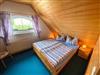 Im Obergeschoss des Ferienhauses befinden sich zwei Schlafzimmer, eines mit einem Doppelbett und Blick auf den Grabower Bodden, und eines mit zwei getrennt stehenden Betten.