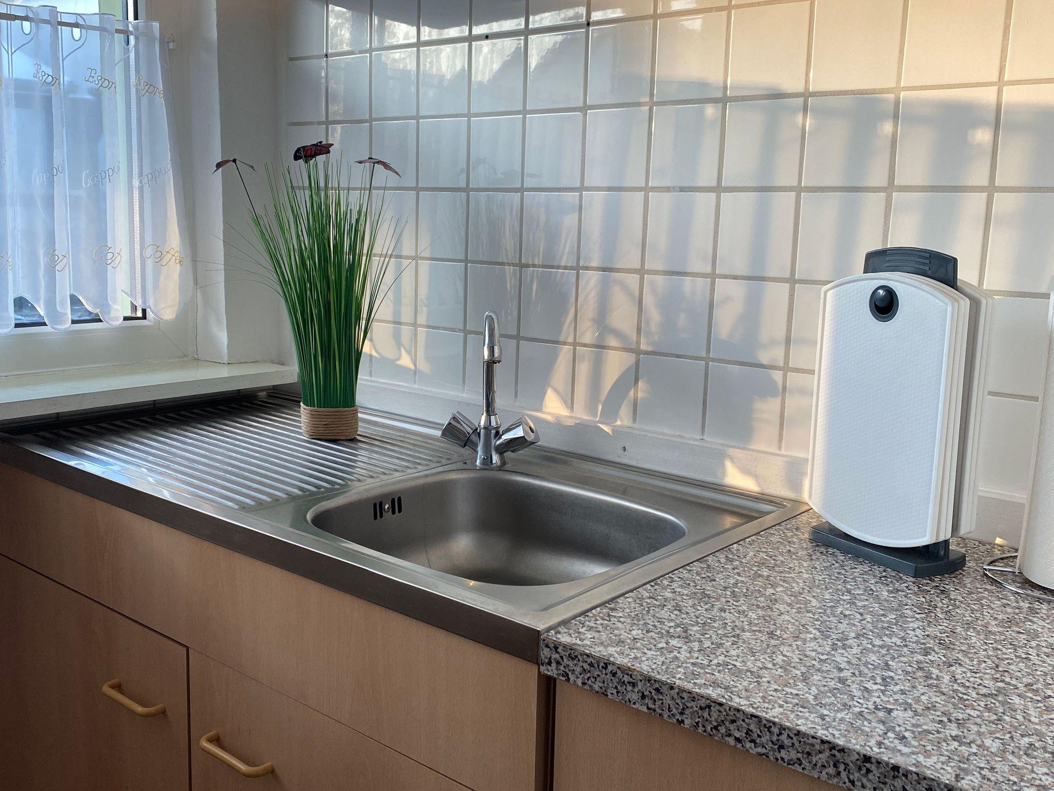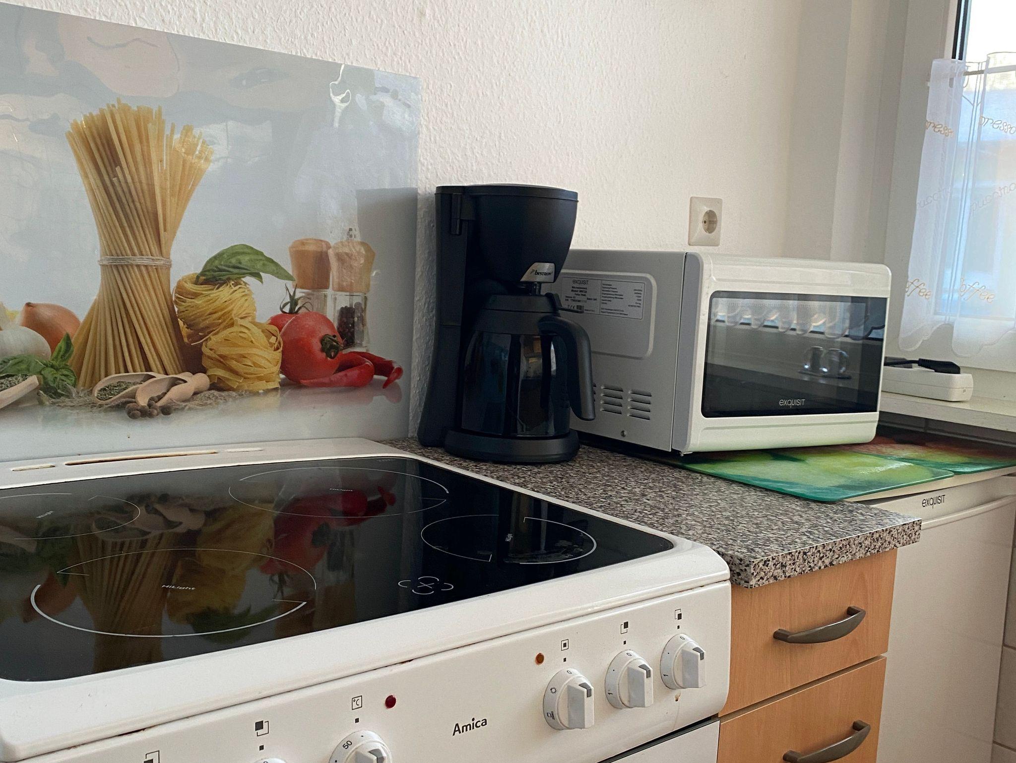 • Küche: kleine Küchenzeile, 4er-Ceran-Herd, Backofen, Kühlschrank mit Gefrierfach, Spülmaschine, Wasserkocher, Kaffeemaschine, Toaster, Mikrowelle
