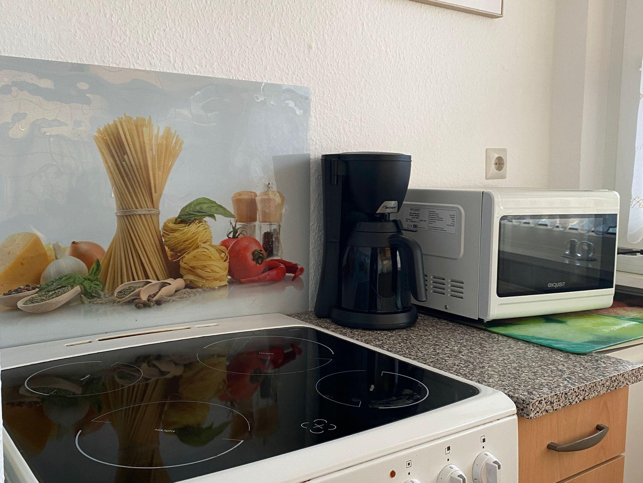 Küche: kleine Küchenzeile, 4er-Ceran-Herd, Backofen, Kühlschrank mit Gefrierfach, Spülmaschine, Wasserkocher, Kaffeemaschine, Toaster, Mikrowelle = 1 Küche mit Esstsich für 6 Personen.
