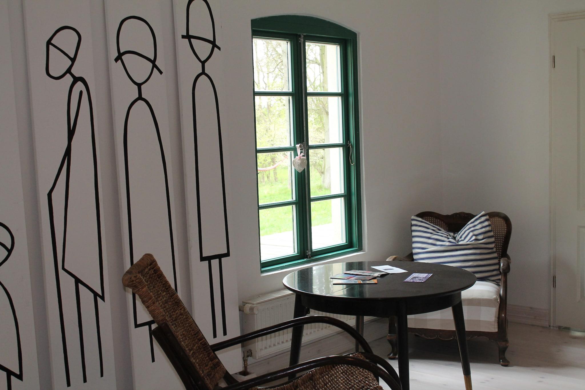 Stueetage: (åbent køkken(elkedel, komfur(Komfur med to kogeplader), kaffemaskine, køleskab(+ fryser)), Stue/soveværelse(dobbeltfeltseng, spisebord(2 personer)), badeværelse(bruser, håndvask, toilet), varme, barnestol) terrasse, have, havemøbler, parkering